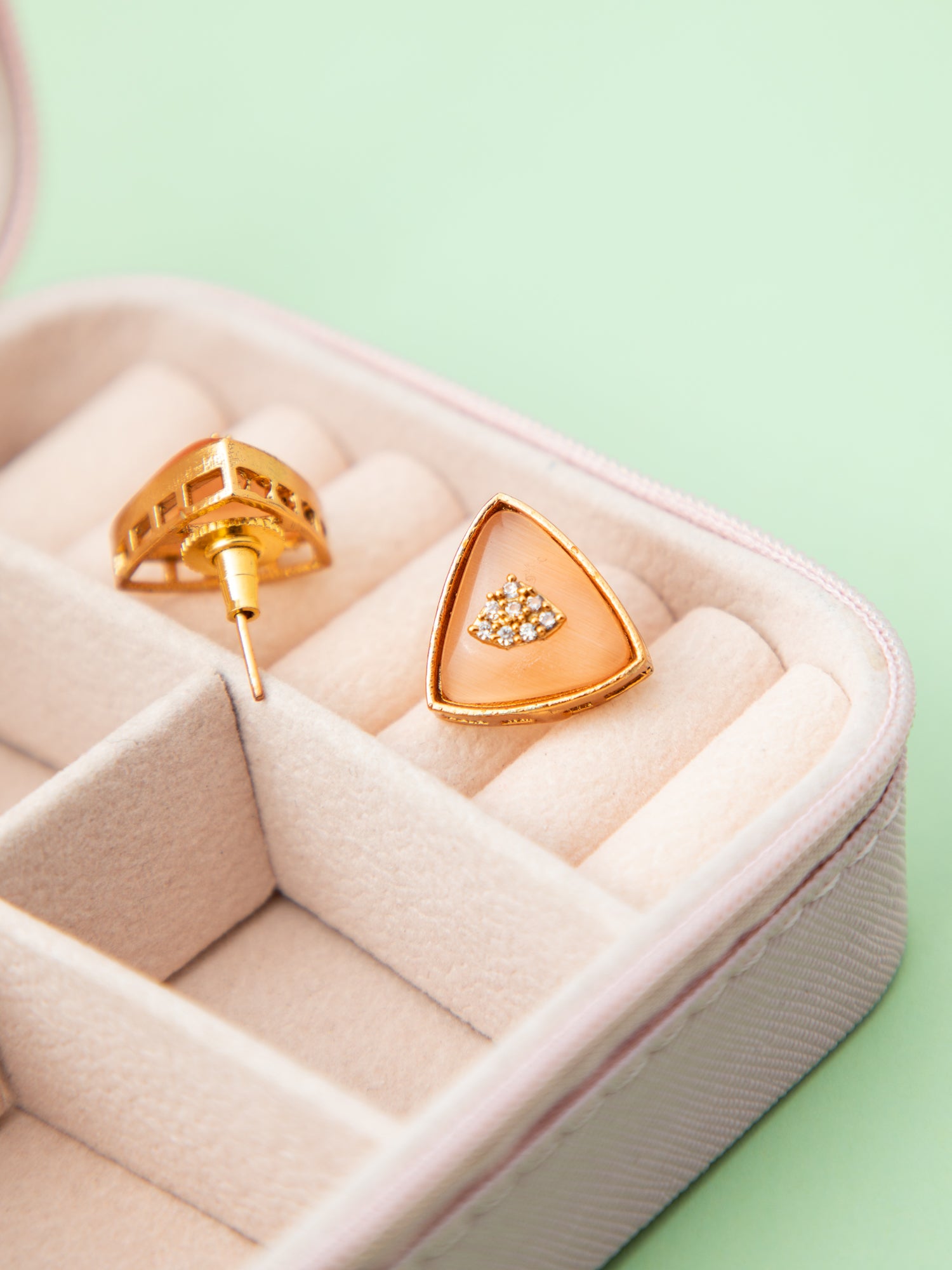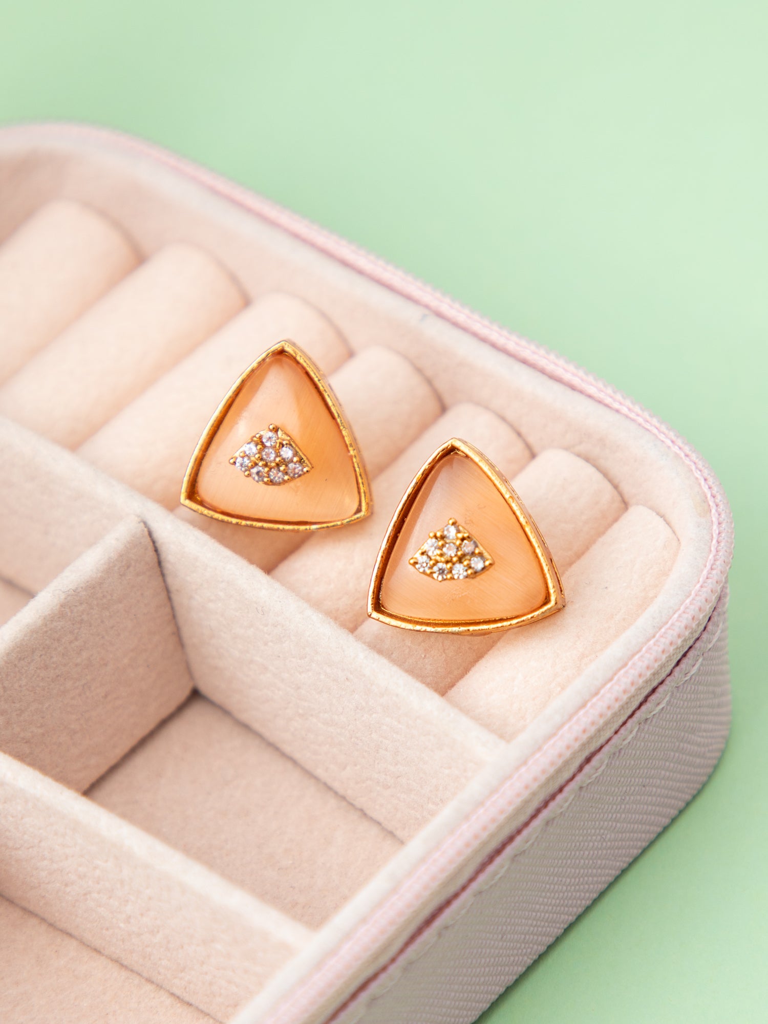 Chic and captivating, the Peach Gleam Stud Earrings blend soft elegance with a modern edge. Featuring a smooth triangular peach enamel base framed in rich gold tones, these studs are elevated by a sparkling cluster of CZ diamonds at the center — creating a perfect balance of subtle color and radiant brilliance. Ideal for both everyday elegance and special occasions, these earrings bring a warm, polished glow to your jewellery collection.