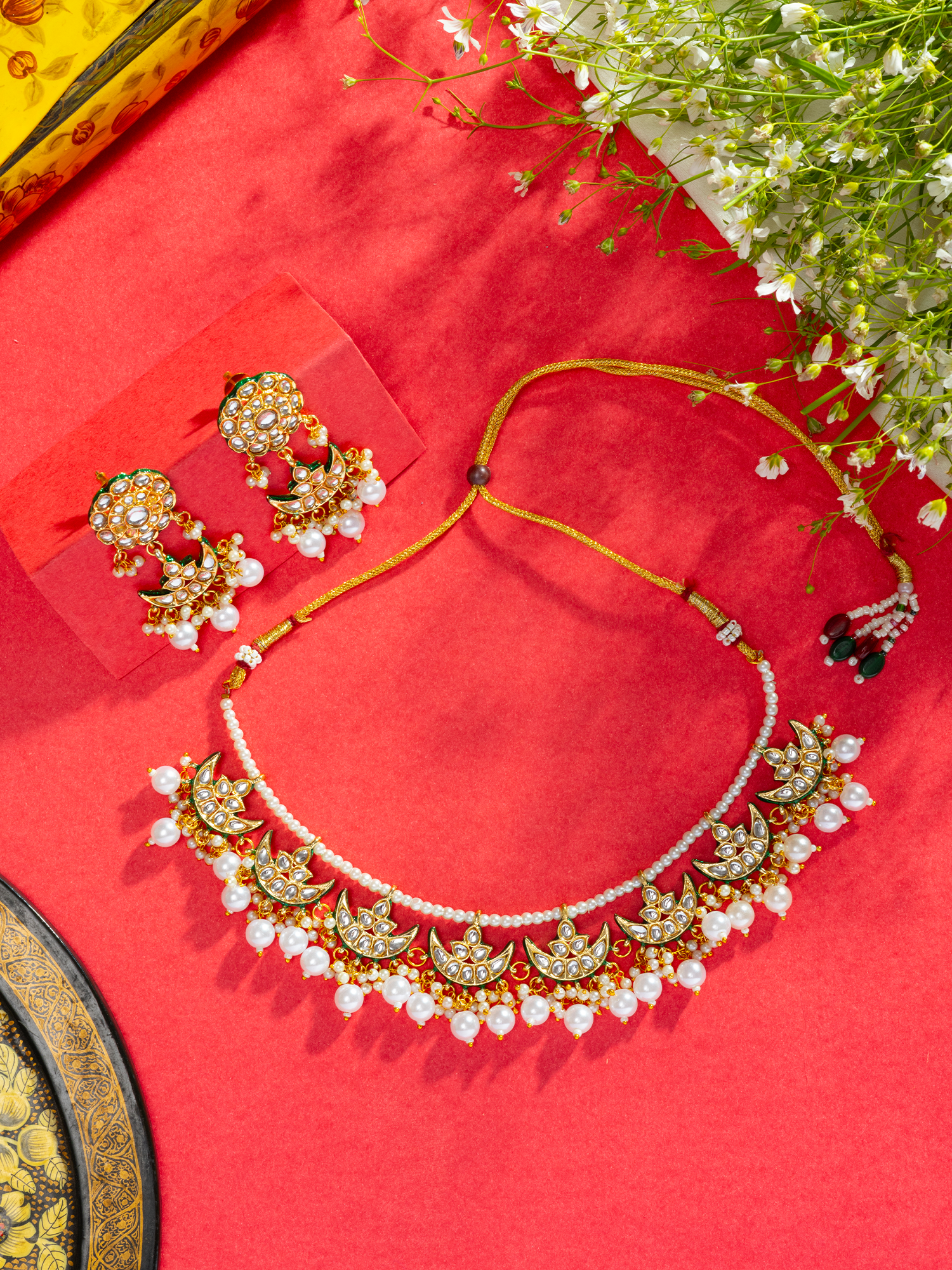 Pair the Pearl and Kundon Floral Necklace And Earrings Set with a solid color ethnic outfit to let its stylish Floral Earrings and captivating design shine. Elevate your fashion game effortlessly with this high-quality, elegant ensemble – a perfect blend of tradition and the latest design trends.