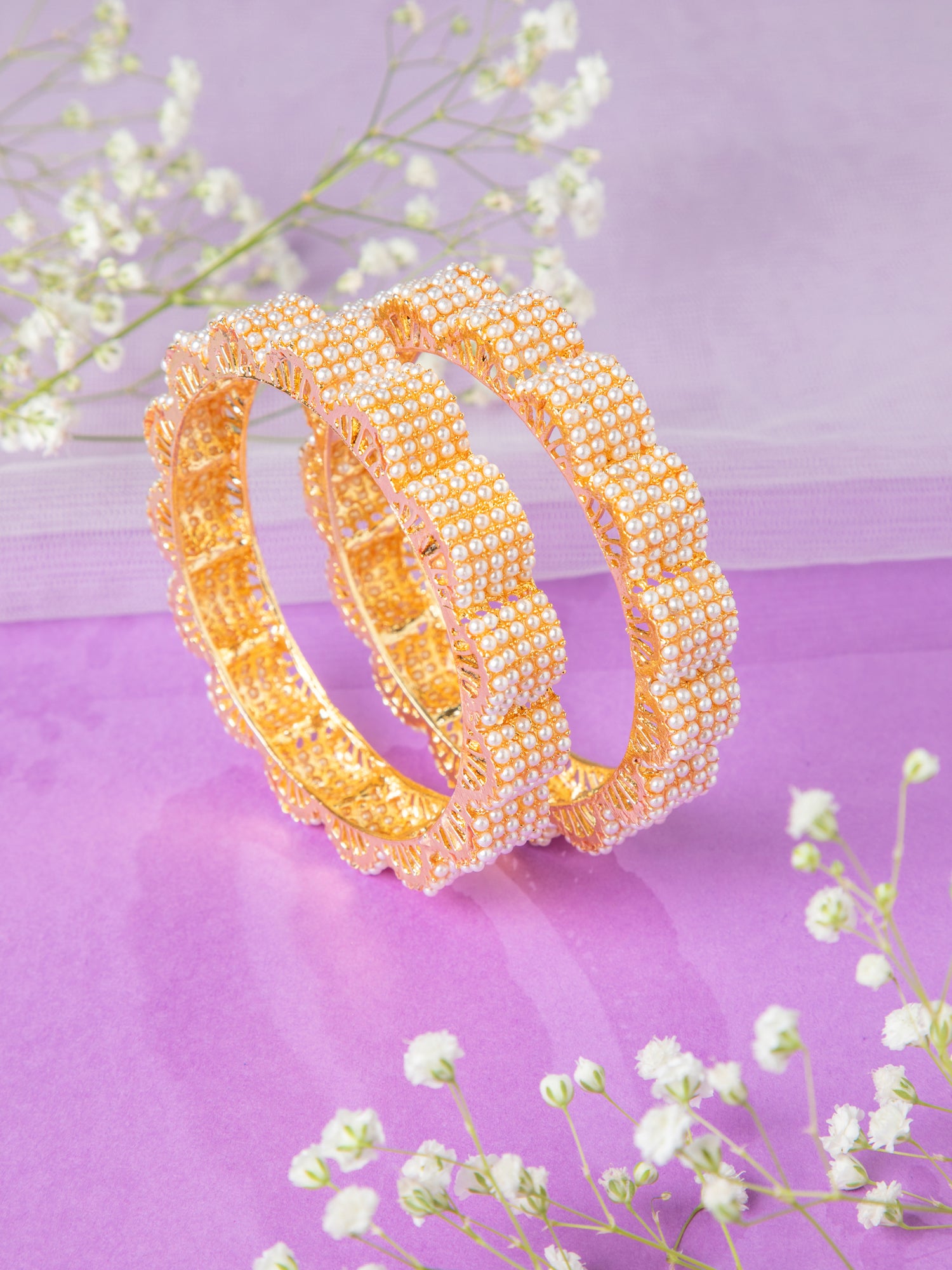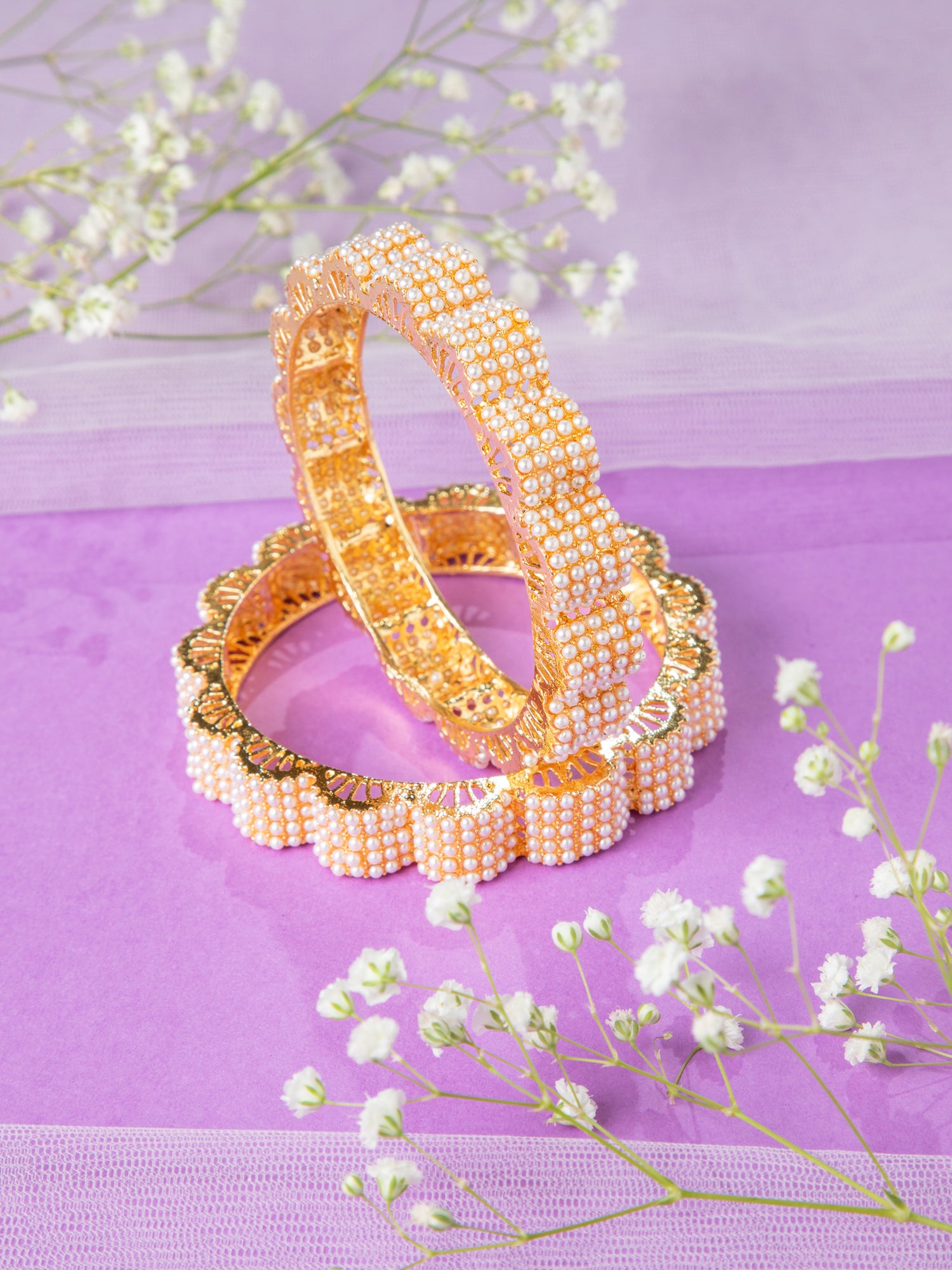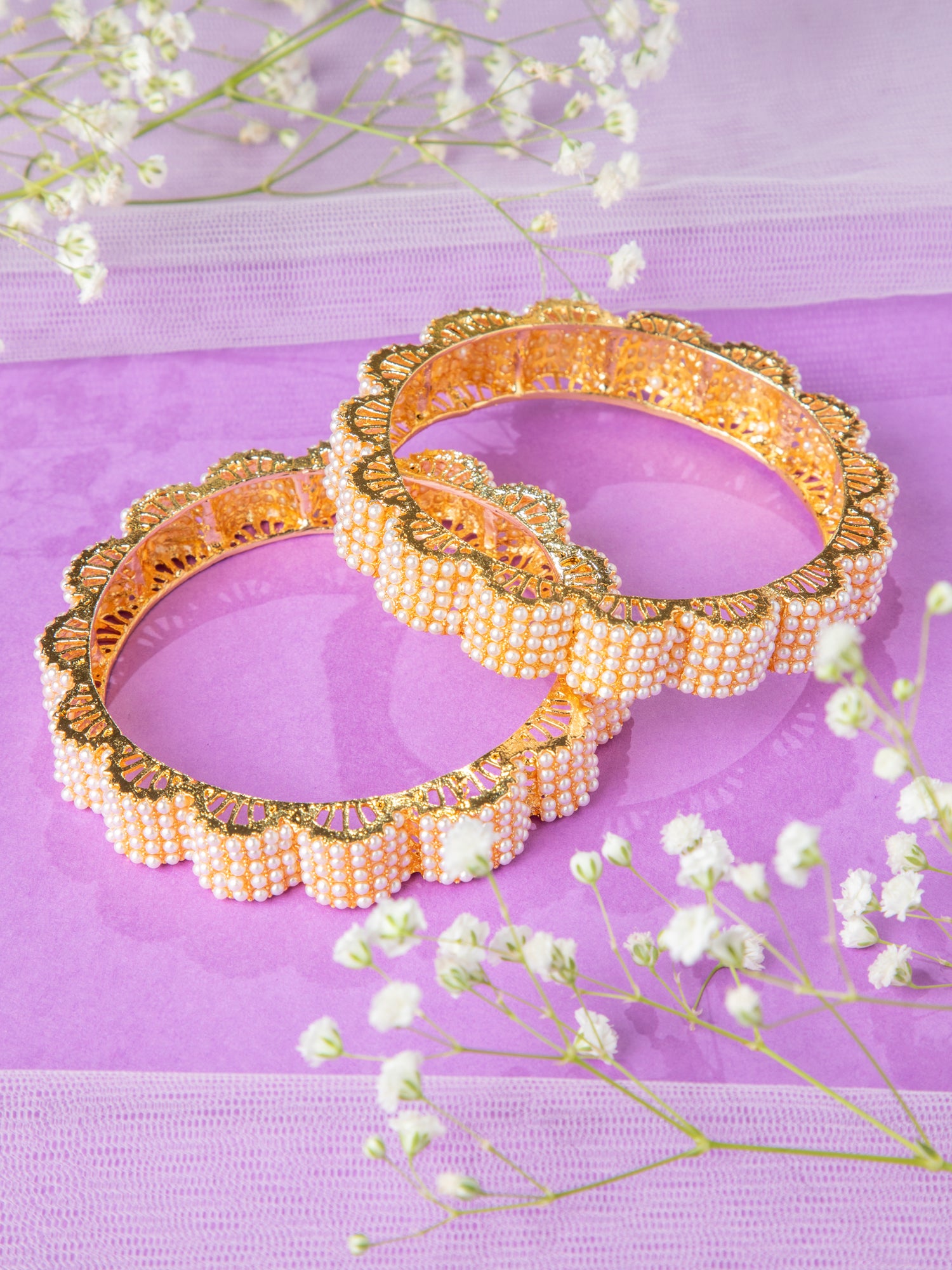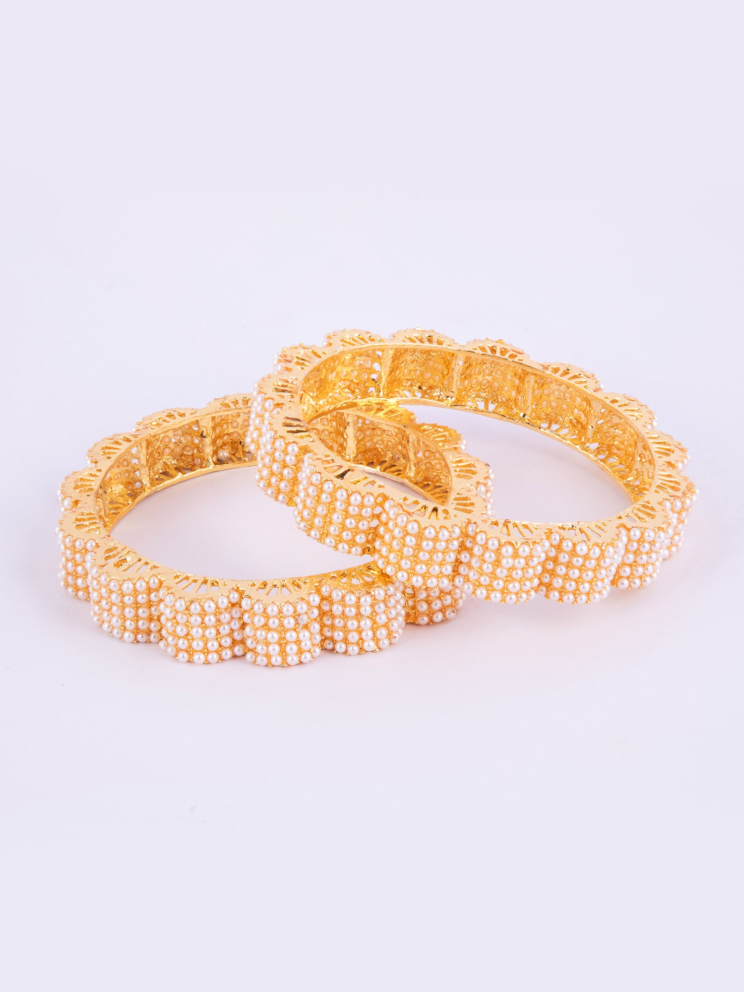 Add a touch of timeless elegance with this 24K gold plated Kada bracelet set, beautifully embedded with delicate white faux pearls. A graceful blend of tradition and charm, perfect for any festive or special occasion.