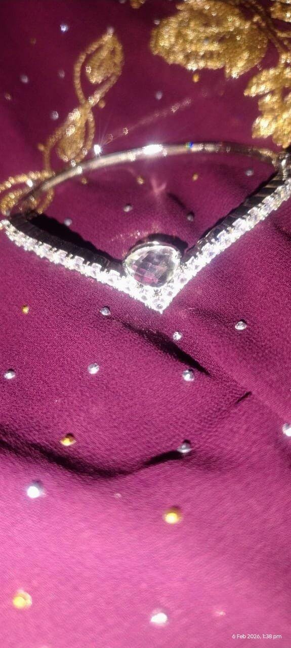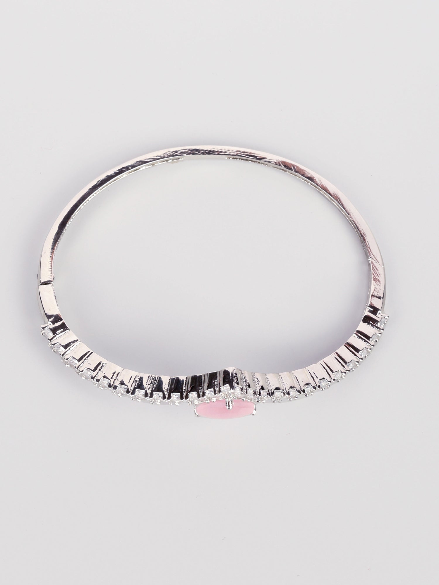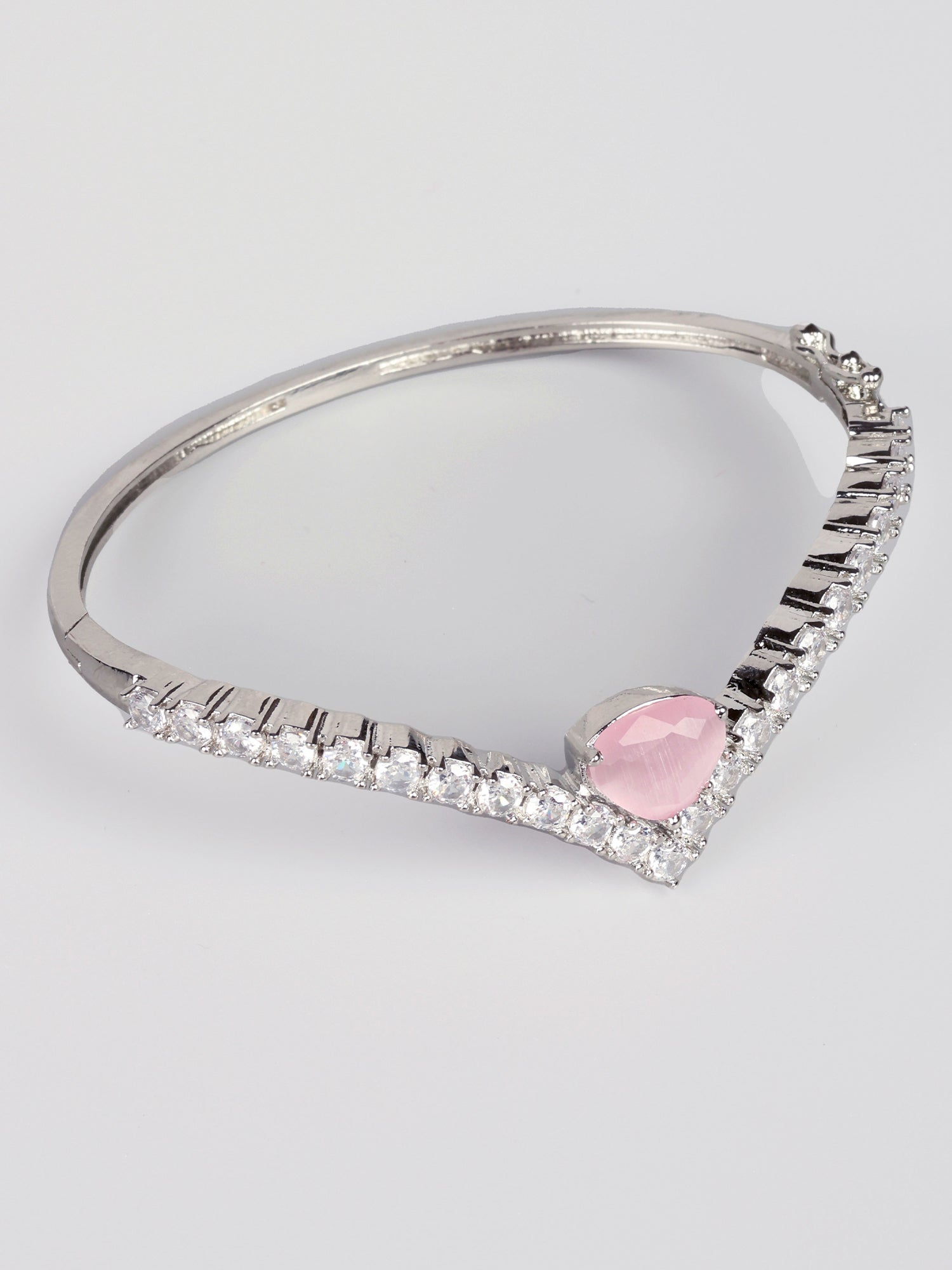 Introducing our enchanting White American Diamond Bracelet, a stunning adornment for your wrist. Crafted with mesmerizing white AD stones in a chic V-shape design, it features a prominent pink CZ stone at its center, adding a touch of allure and sophistication. Skillfully designed and handmade by local artisans, this bracelet embodies the latest trend in jewelry design. With anti-tarnish and anti-allergic properties, it's perfect for functions and parties, effortlessly elevating your ensemble with its timeless elegance and charm.