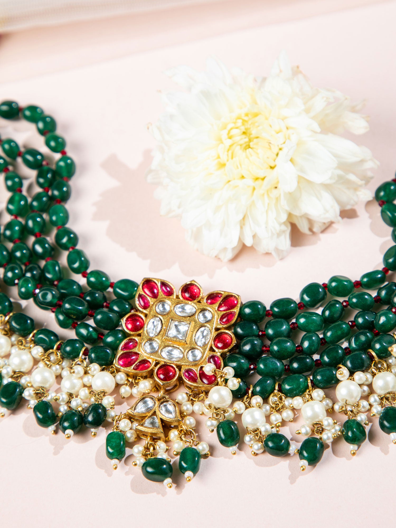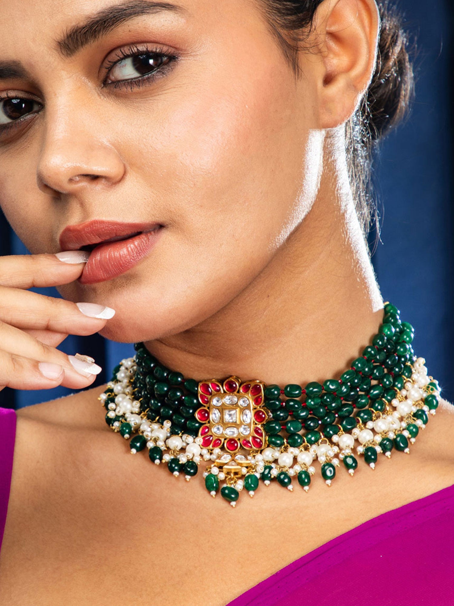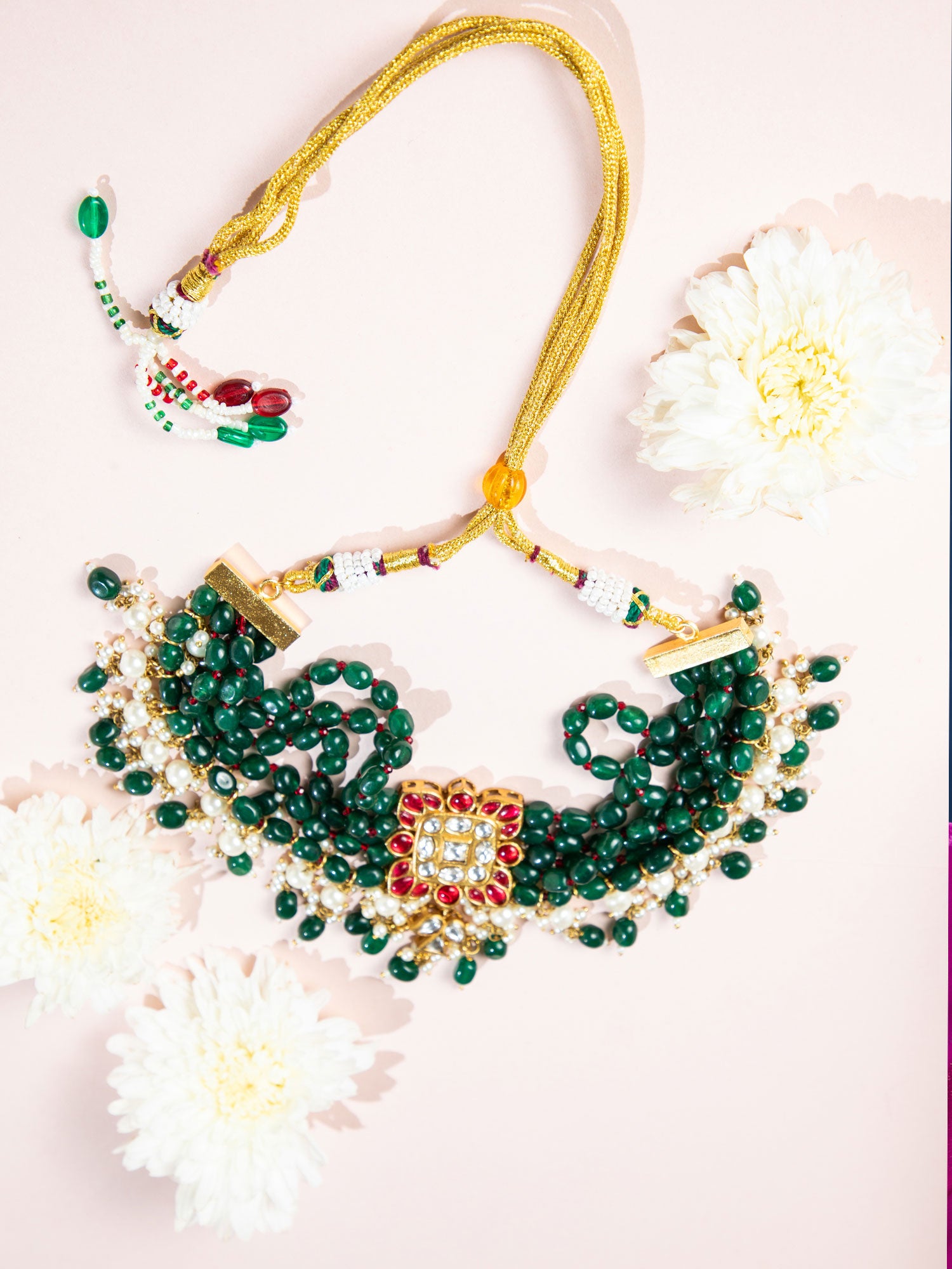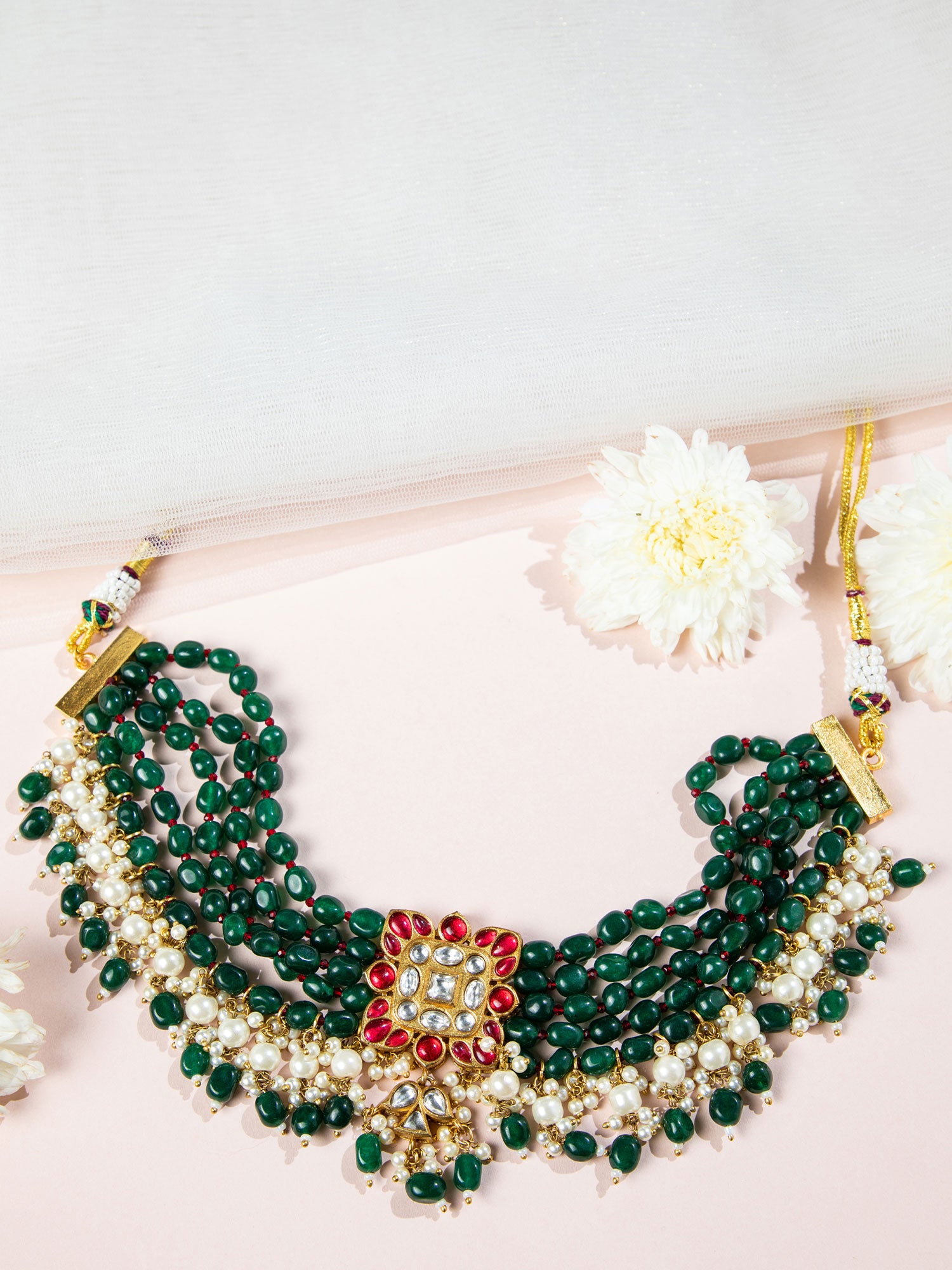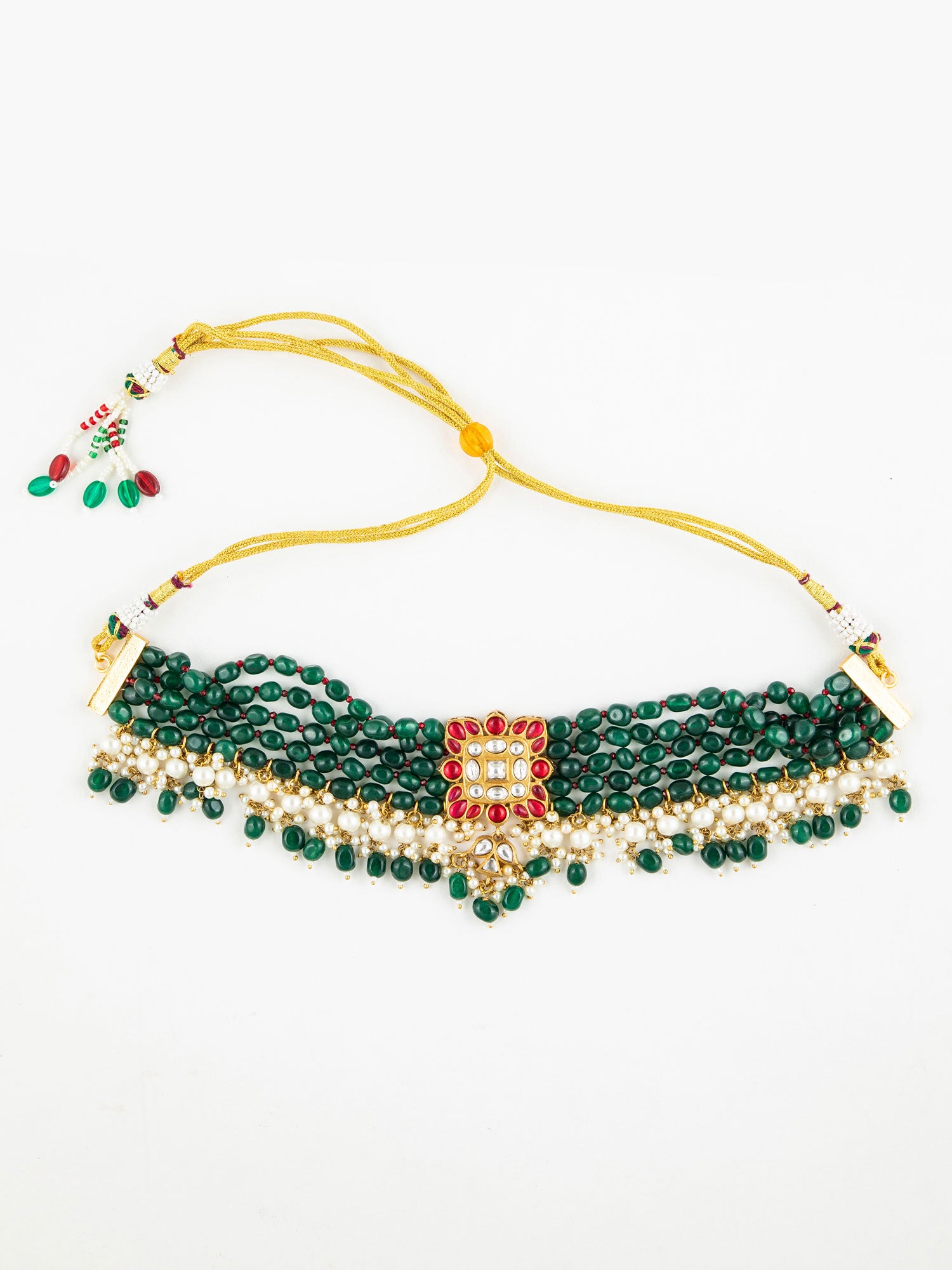 Gold-plated choker necklace, has green Kundan and cubic zirconia stone-studded and beaded details, Secured with a drawstring closure.