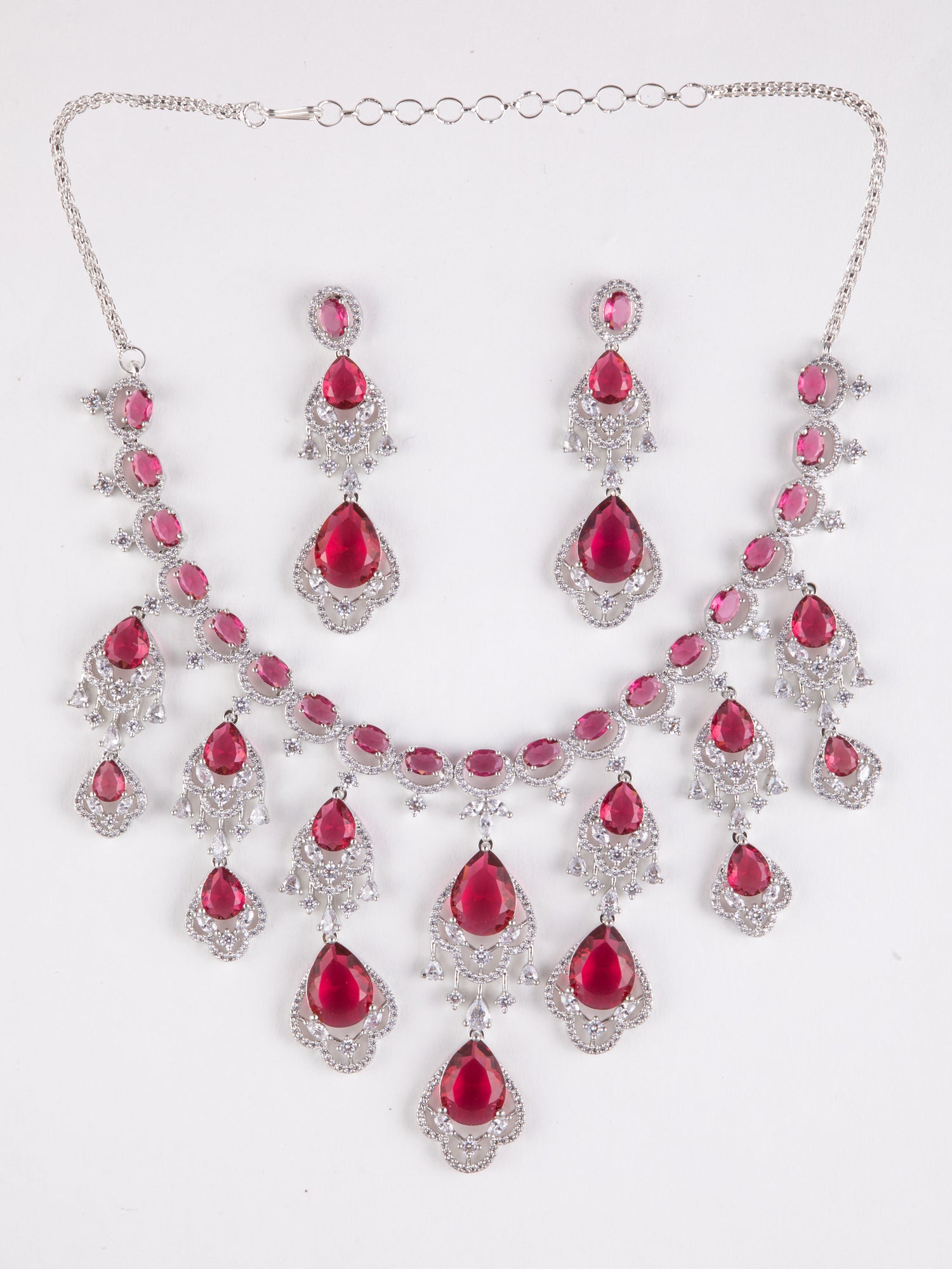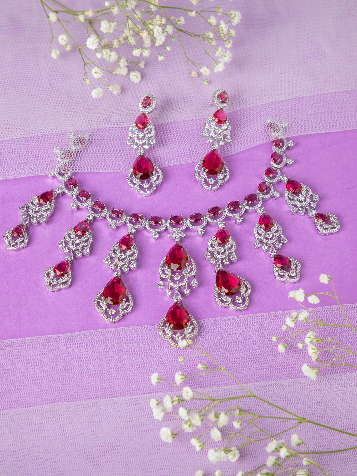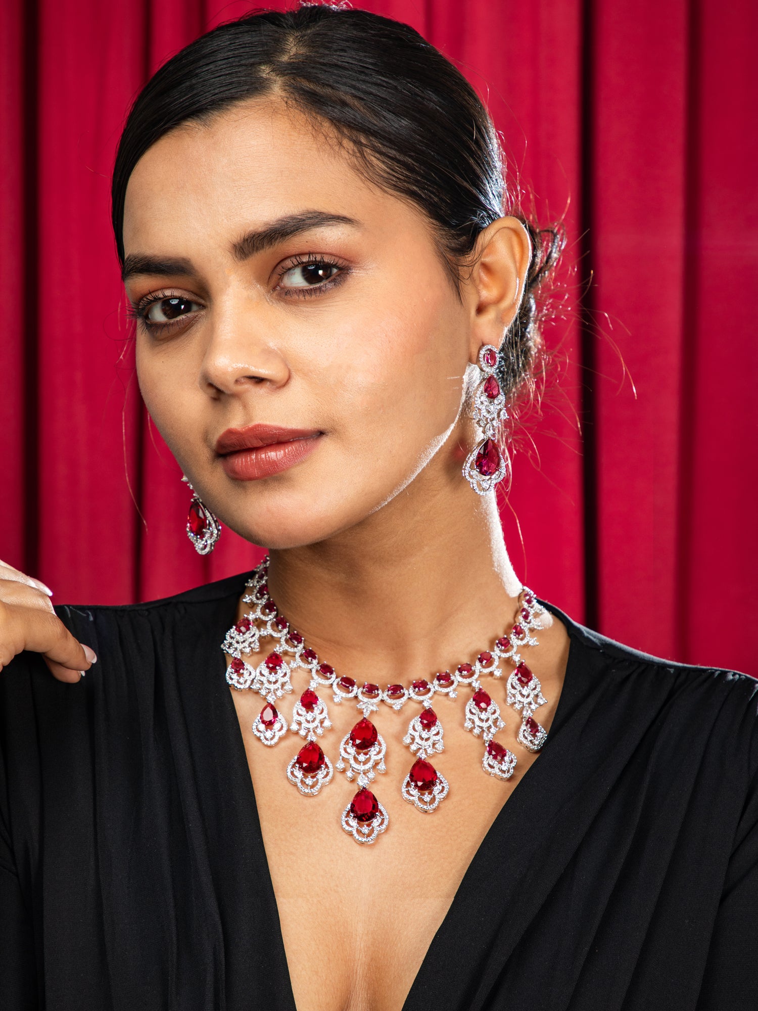 Make a statement with this rhodium plated silver American Diamond necklace, featuring bold red and white stones in a grand design. Paired with long, elegant earrings from our enchanting new collection.