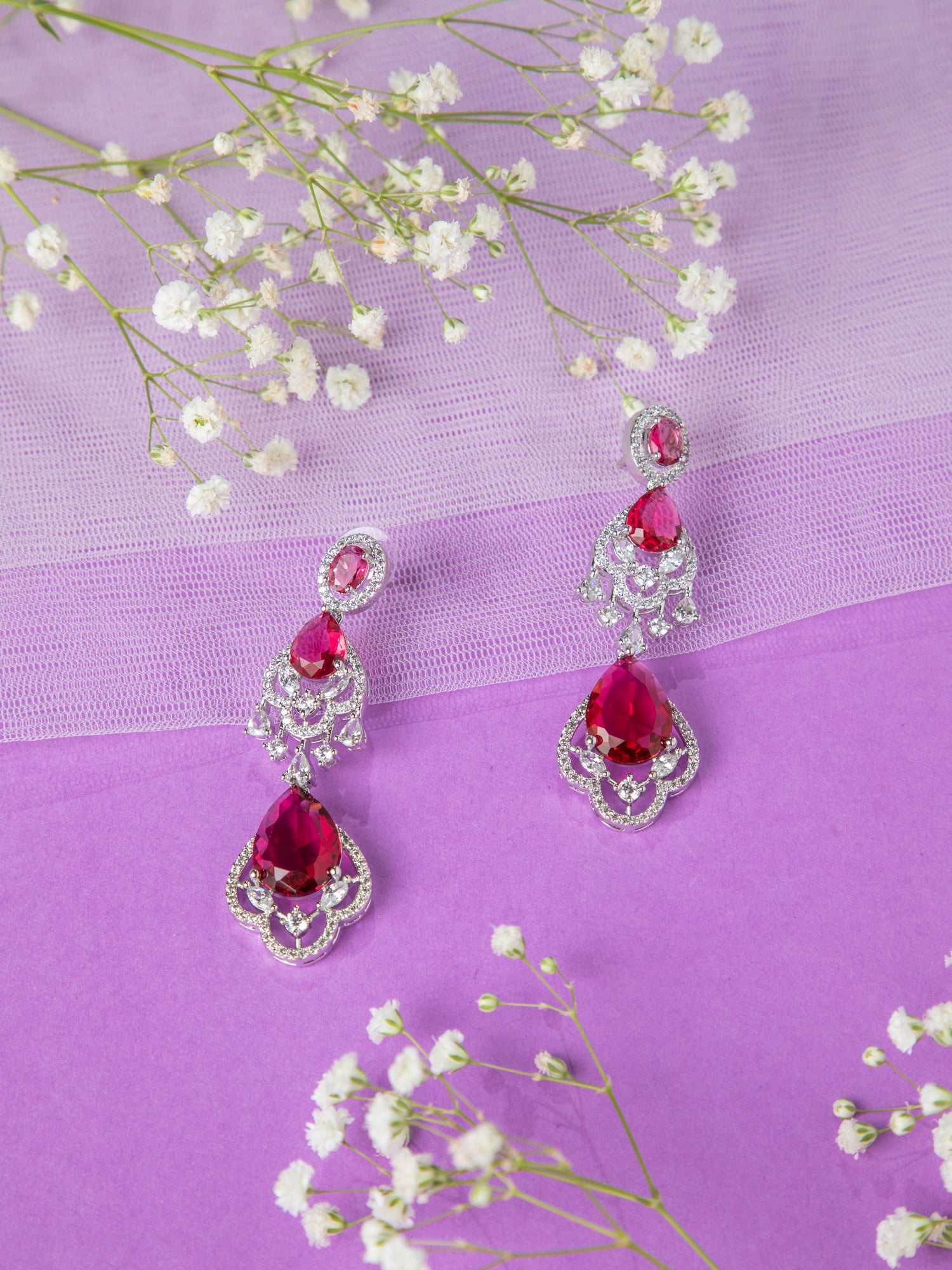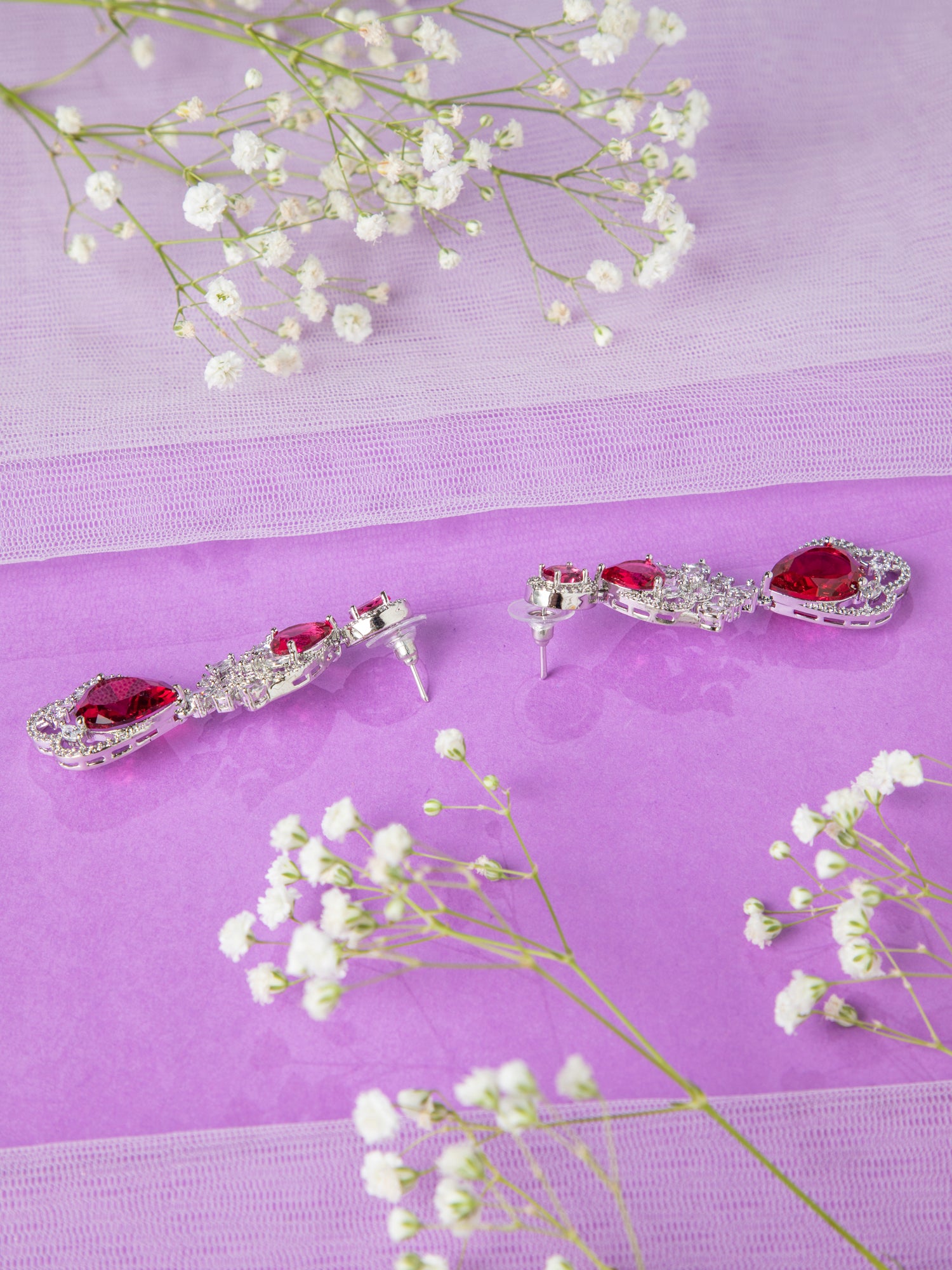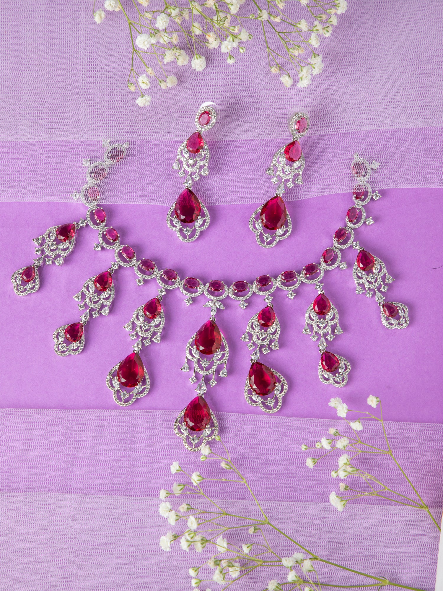 Make a statement with this rhodium plated silver American Diamond necklace, featuring bold red and white stones in a grand design. Paired with long, elegant earrings from our enchanting new collection.