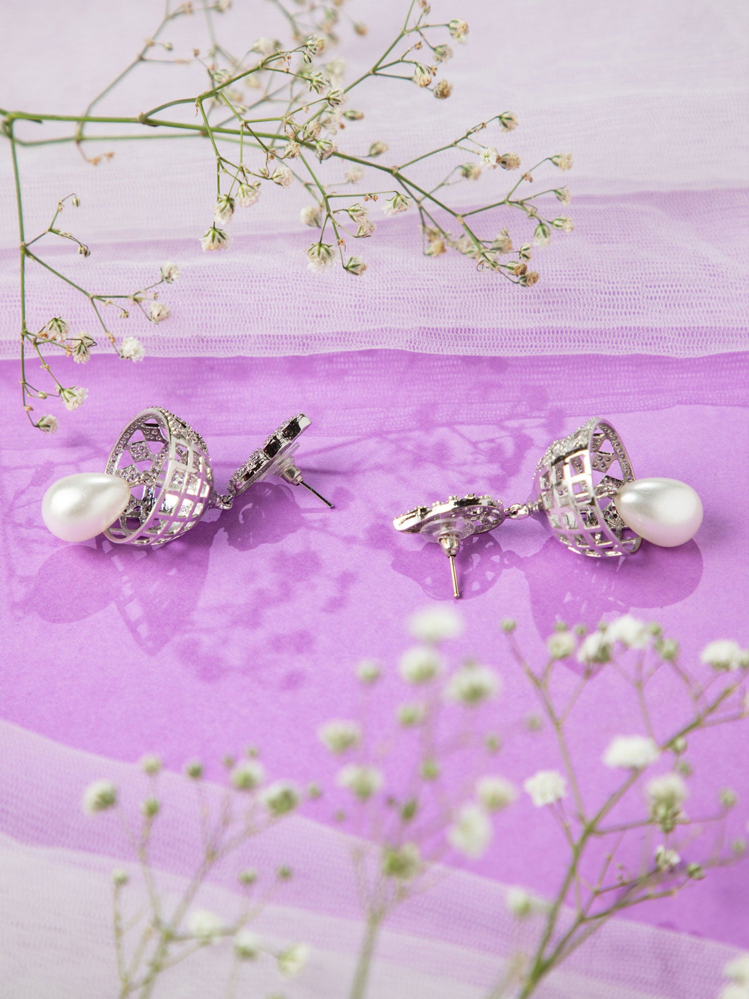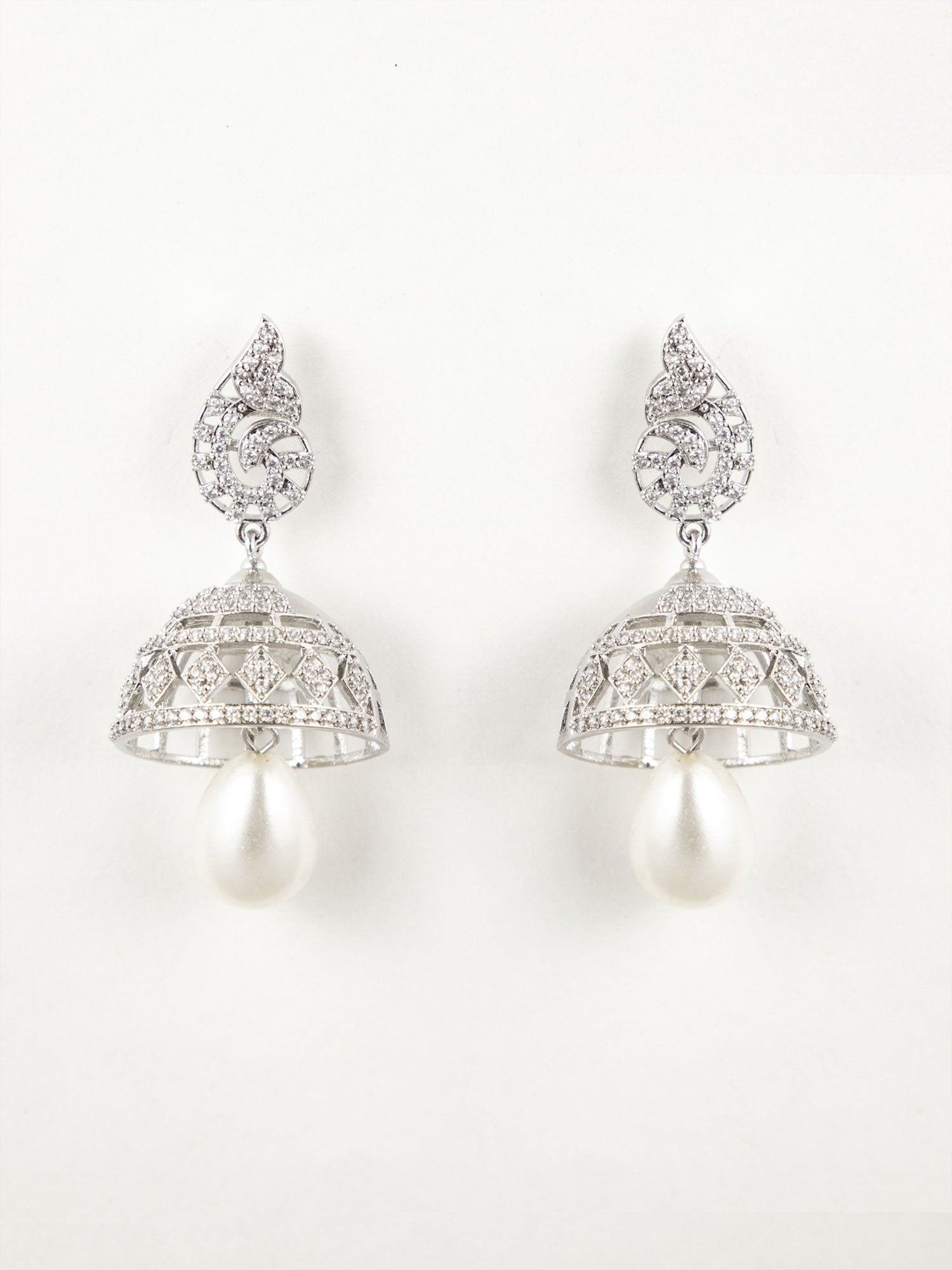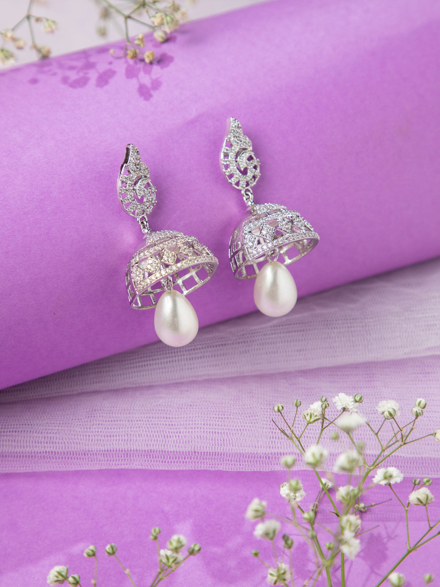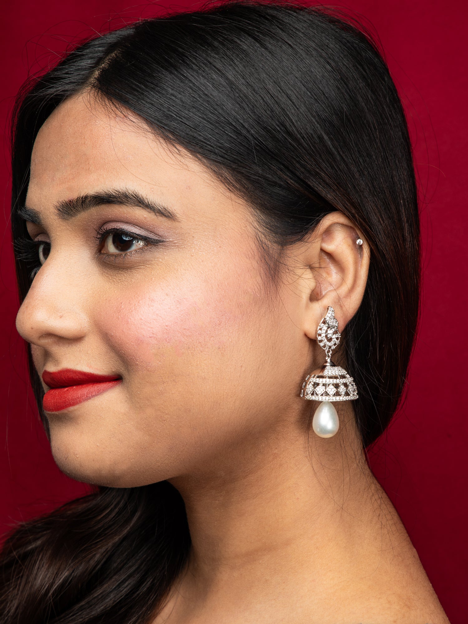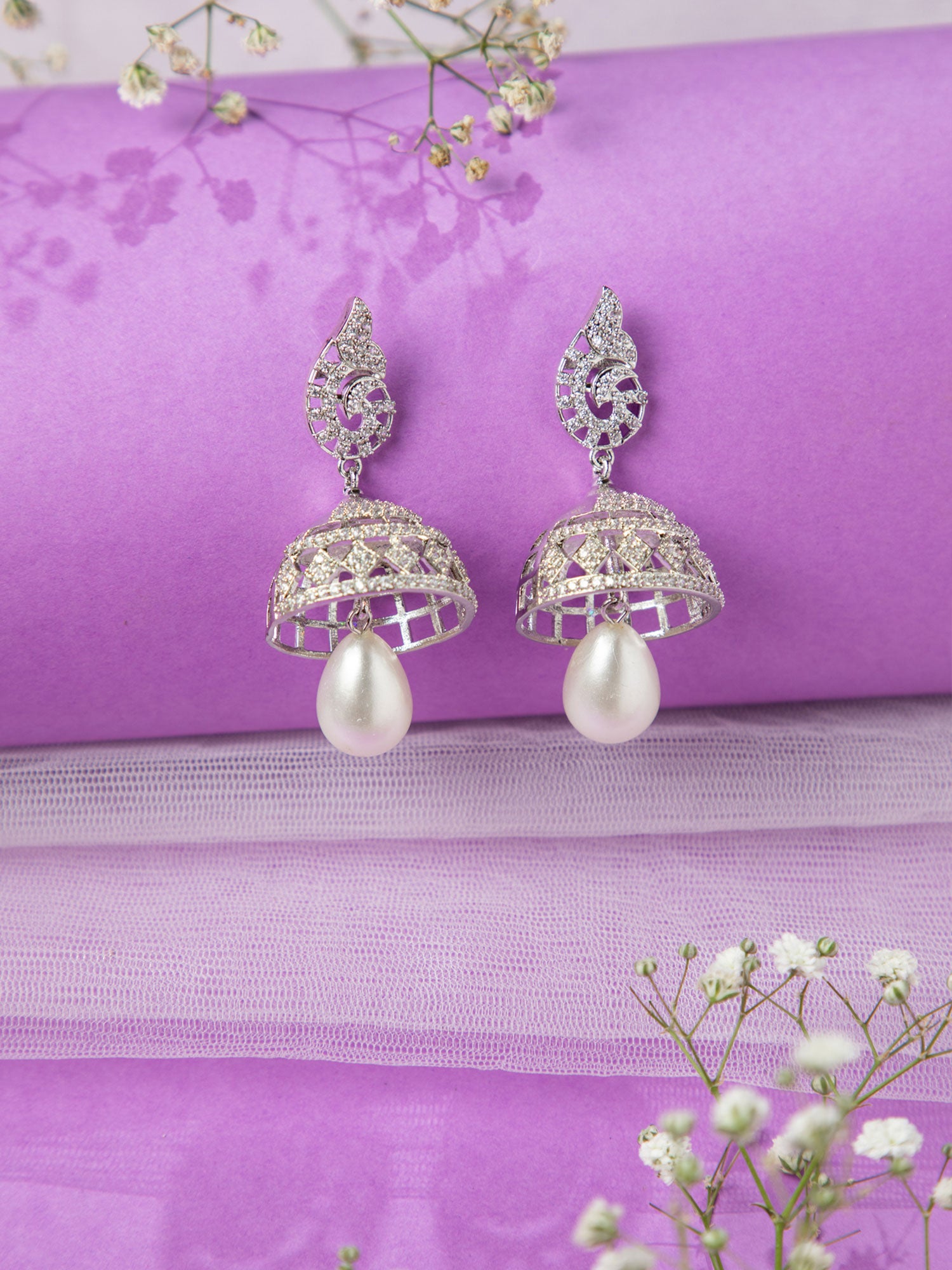 Rhodium-plated jhumka earrings studded with white American diamond stones in a traditional pattern, featuring a large white water drop faux pearl. Handcrafted by local artisans, this mesmerizing new design is perfect for festive, party, or function wear—a true must-have piece.