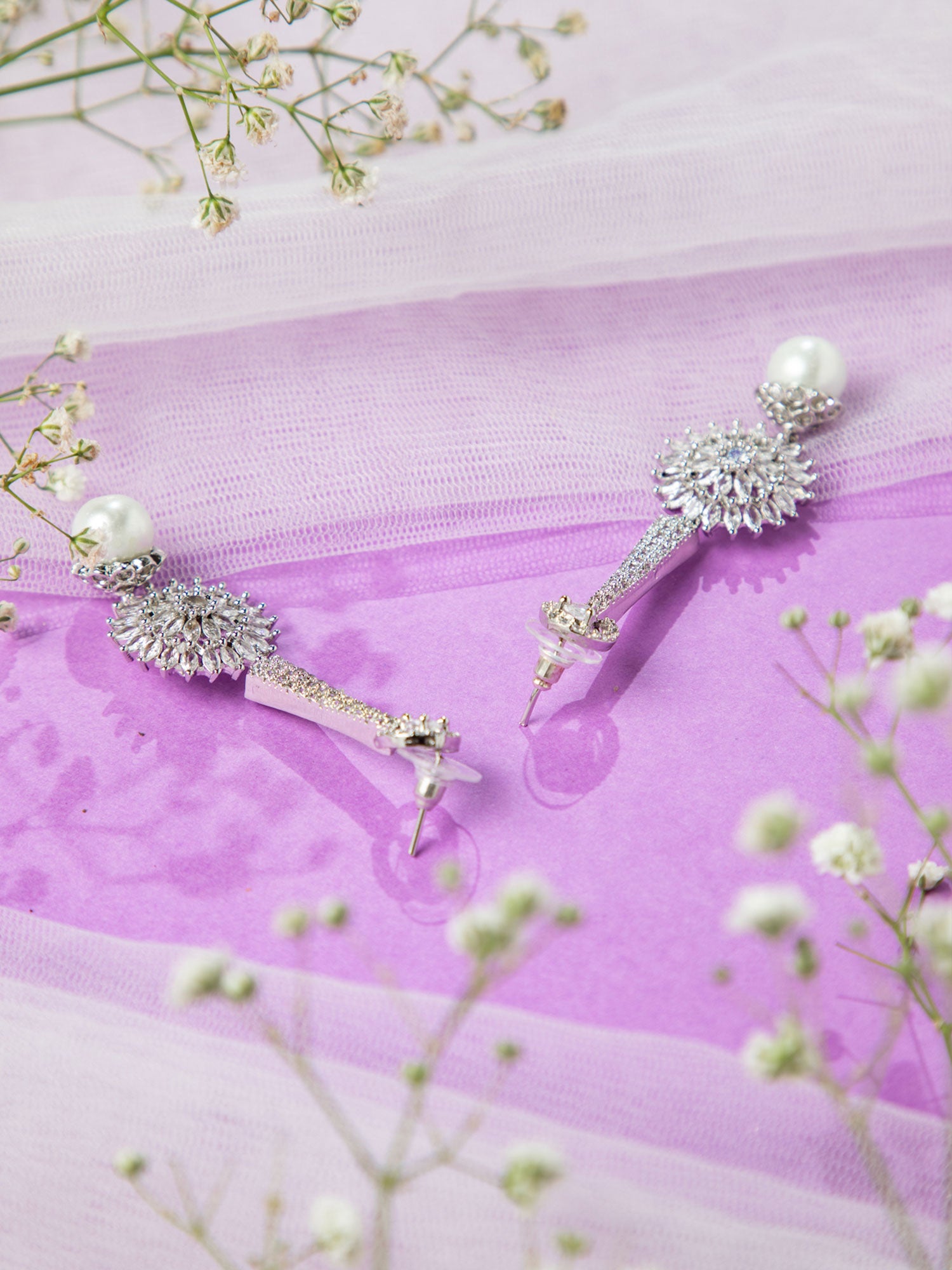 Mesmerizing rhodium-plated American diamond earrings with white AD and CZ stones. Featuring a sparkling star design and a big round faux pearl at the bottom, these handcrafted long earrings are a must-have for parties, festivals, or functions. A modern, elegant statement piece.