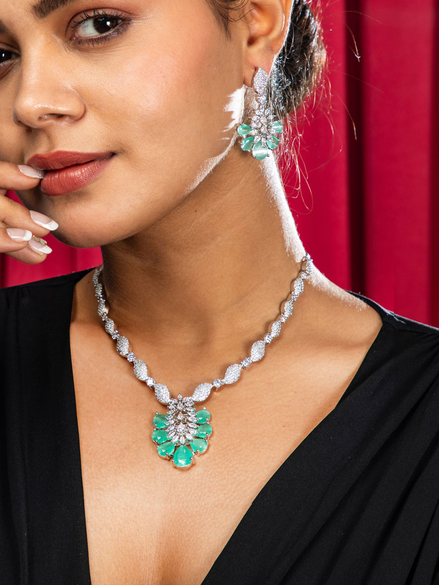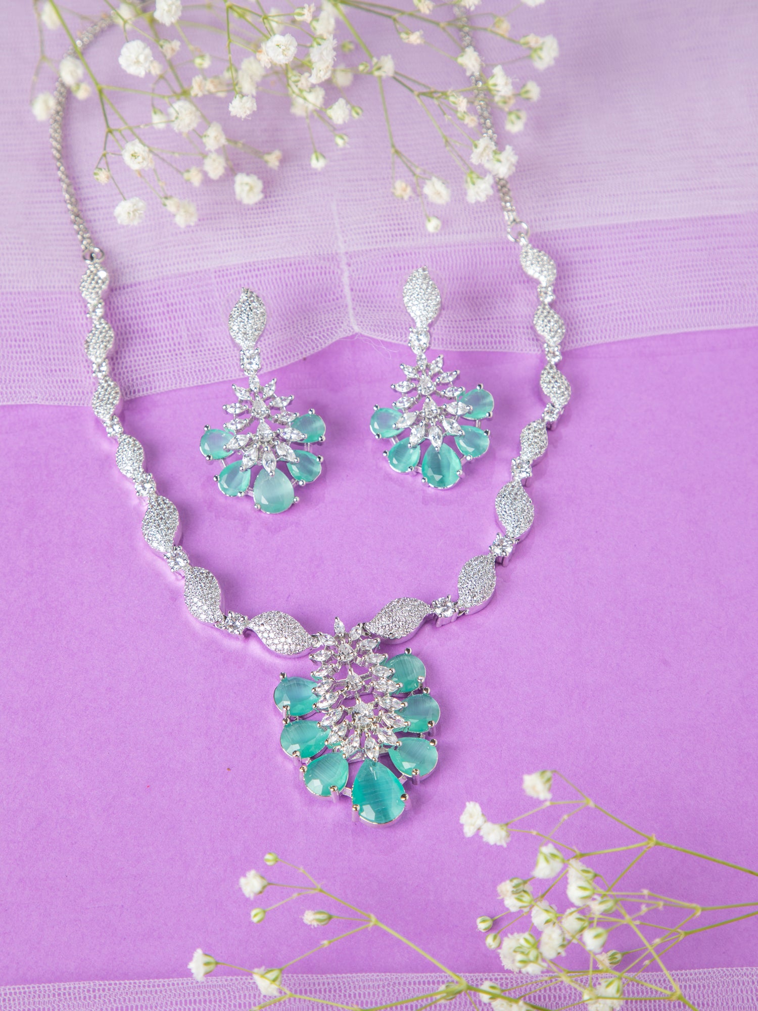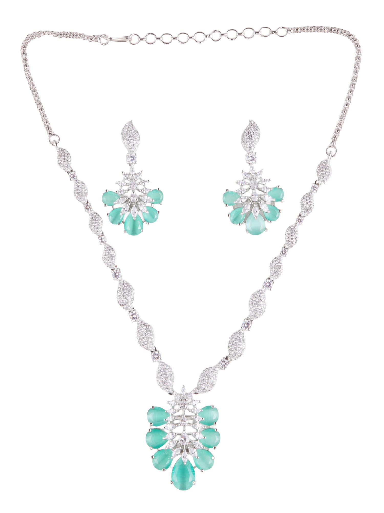 Rhodium Plated Aqua Green and White AD Necklace Set with Earrings