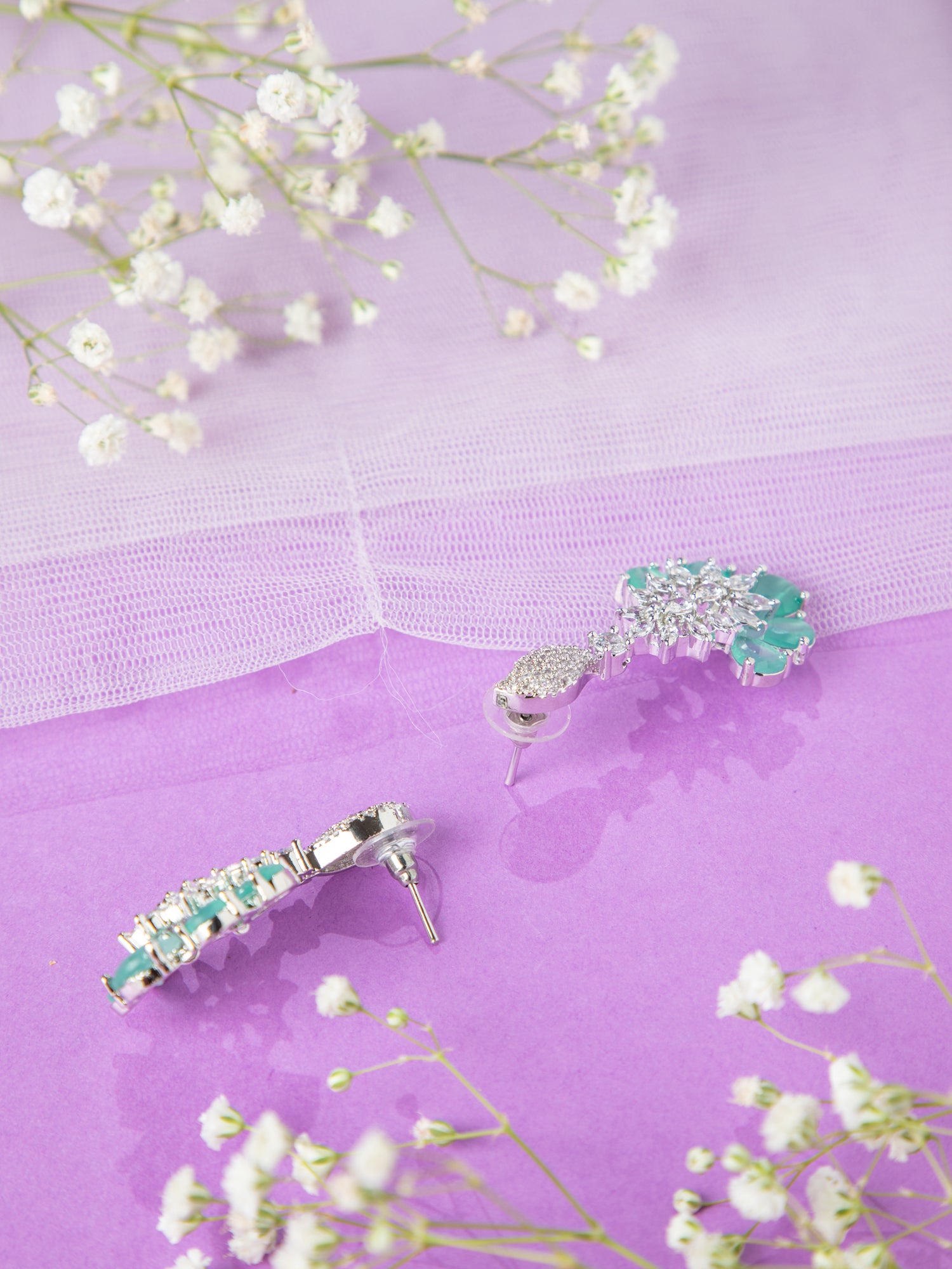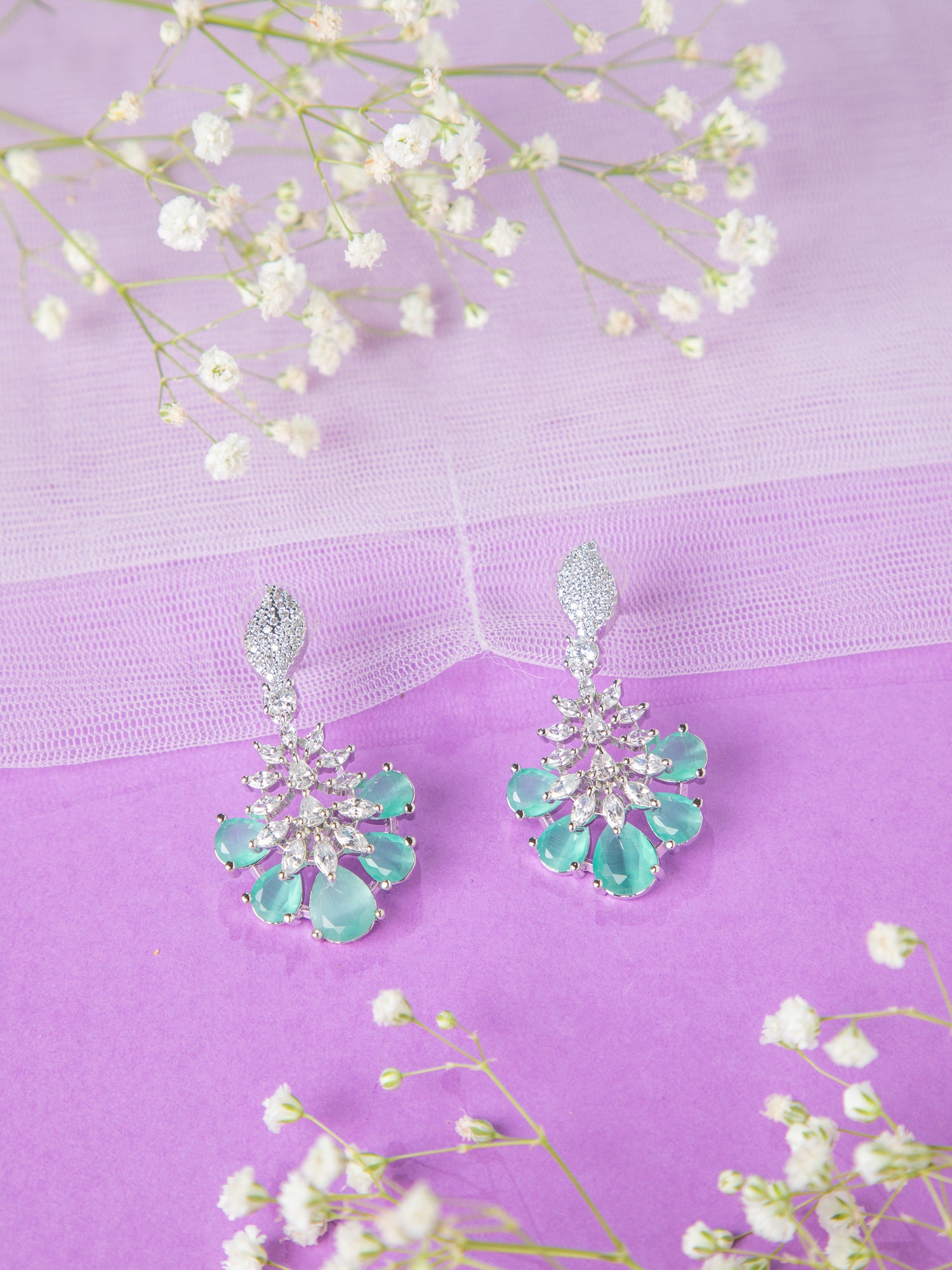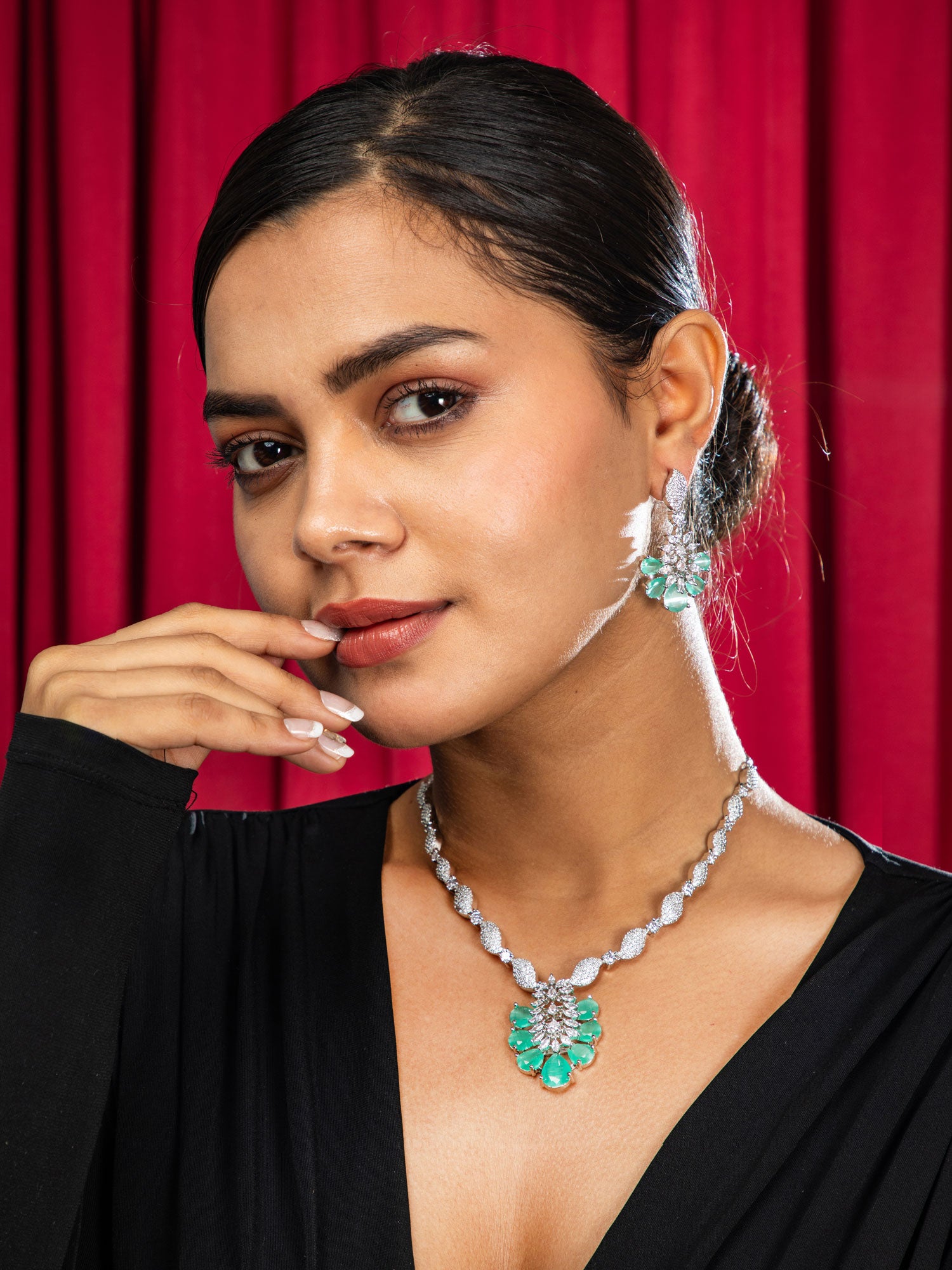 Rhodium Plated Aqua Green and White AD Necklace Set with Earrings