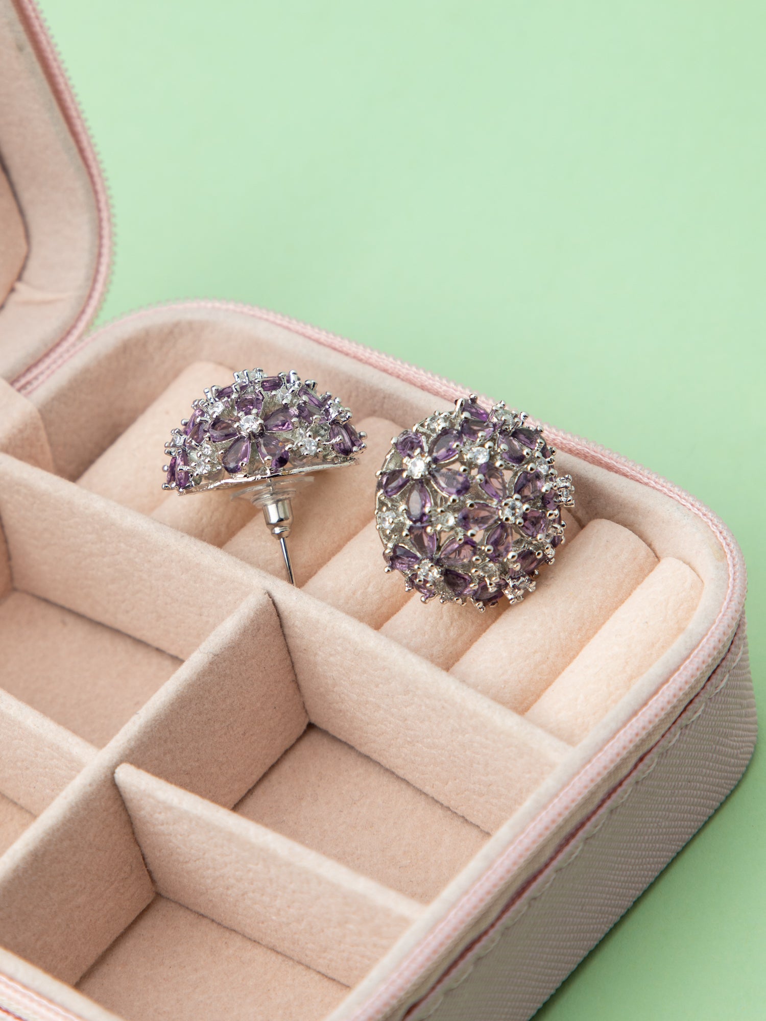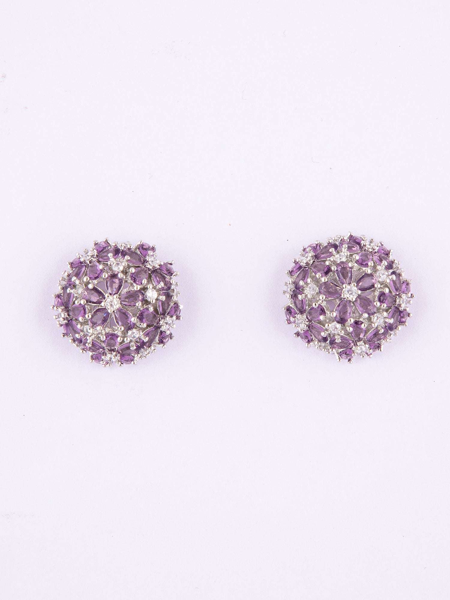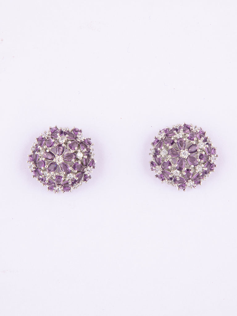 Rhodium Plated Floral Round Earrings with Purple and White AD Stones