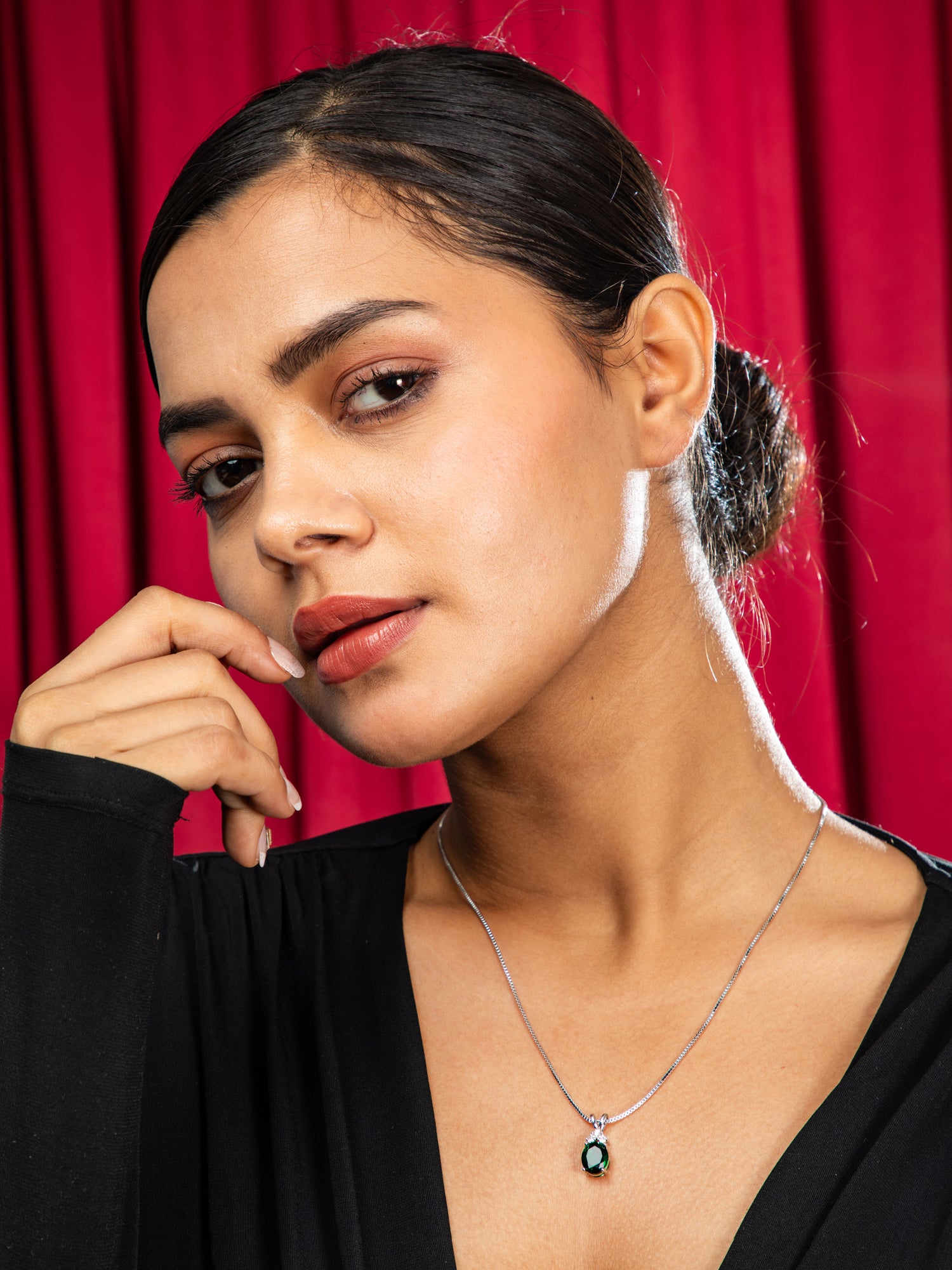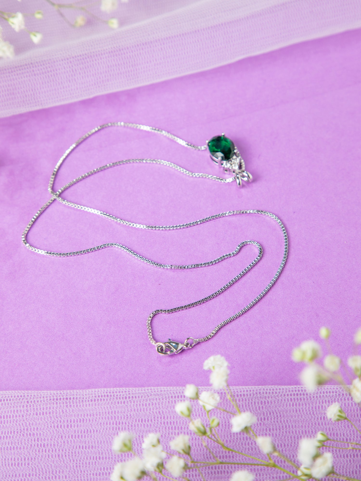 Rhodium Plated Green Emerald & White AD Pendant Necklace