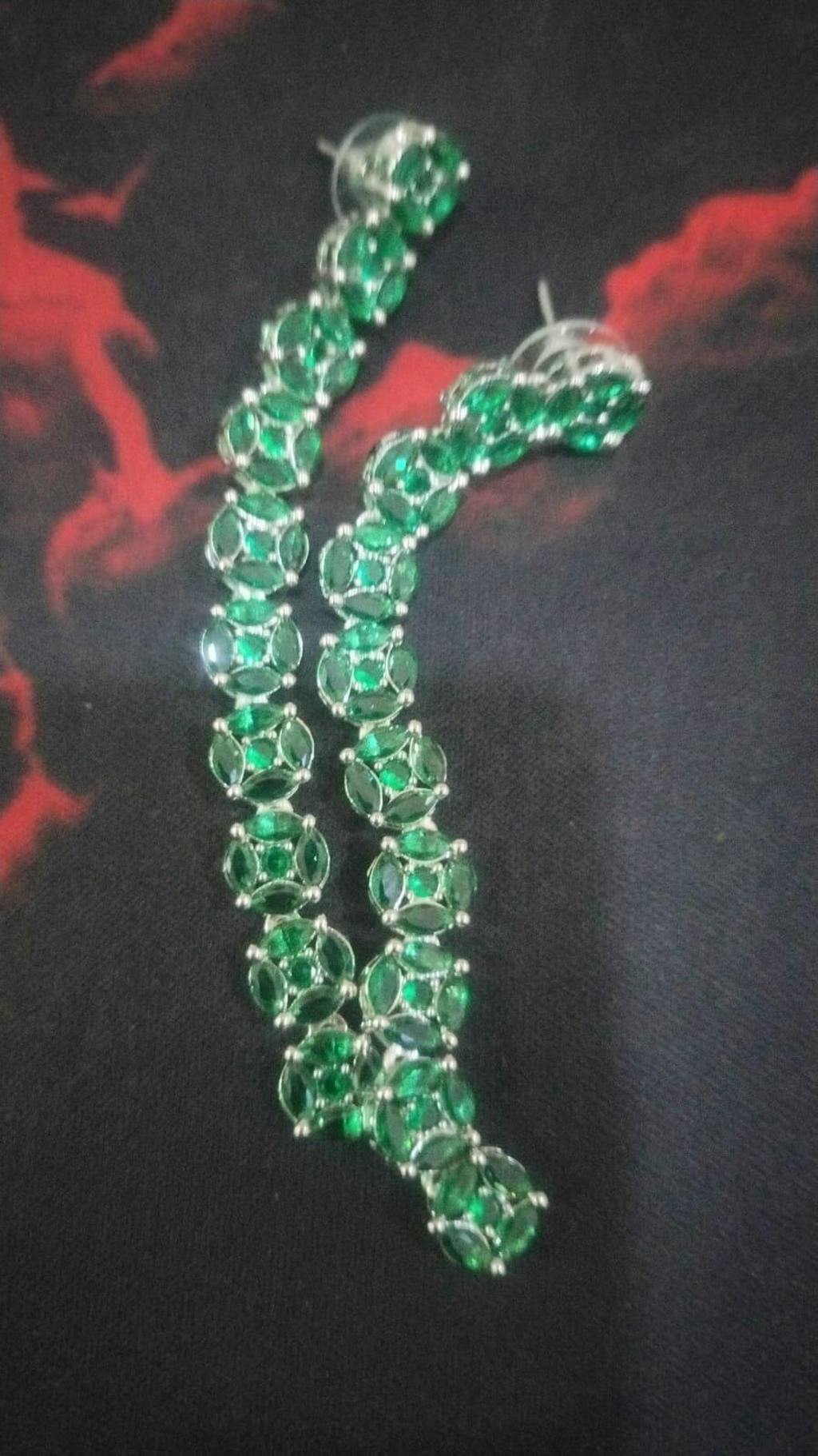 Rhodium Plated Green Stone Long Earrings
