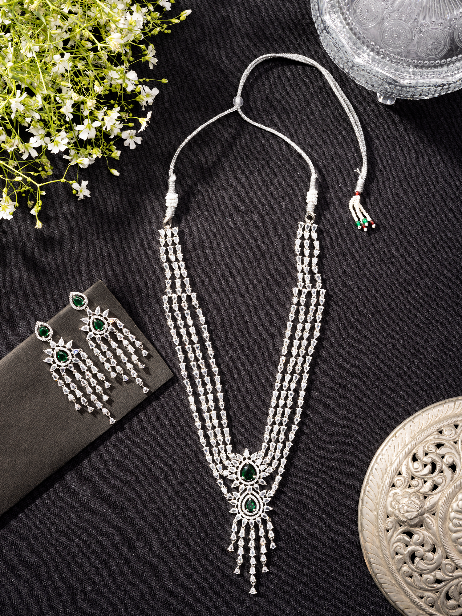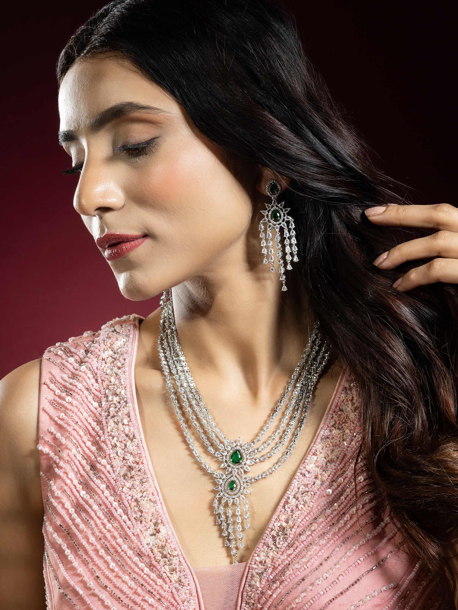 Elevate your look by wearing the Rhodium Plated White and Green American Diamond Multi-layered Necklace Set with a simple white blouse or dress to let the stunning floral design and vibrant stones take center stage.
