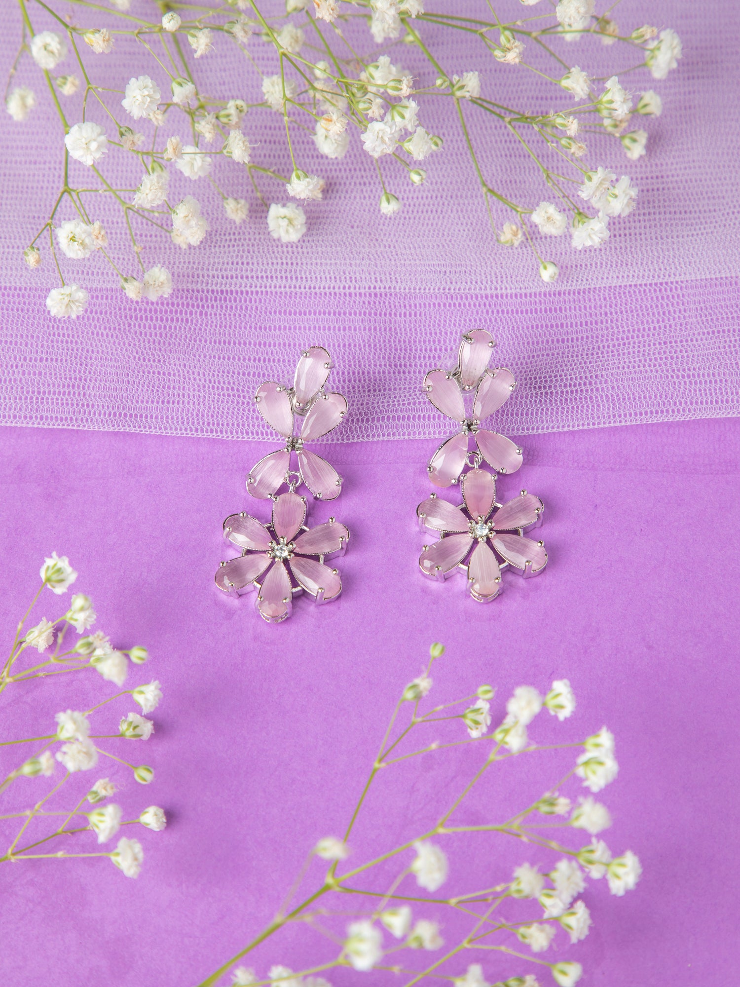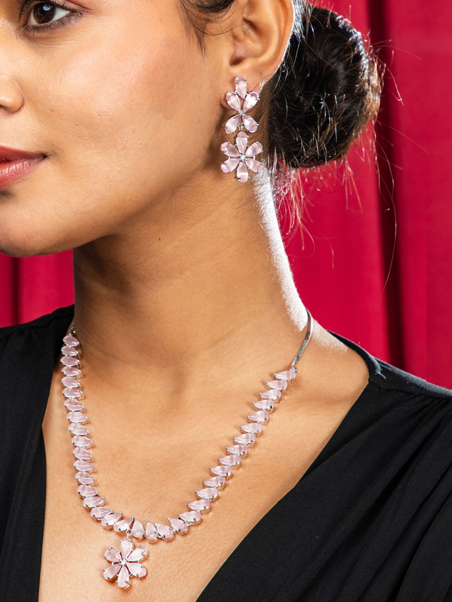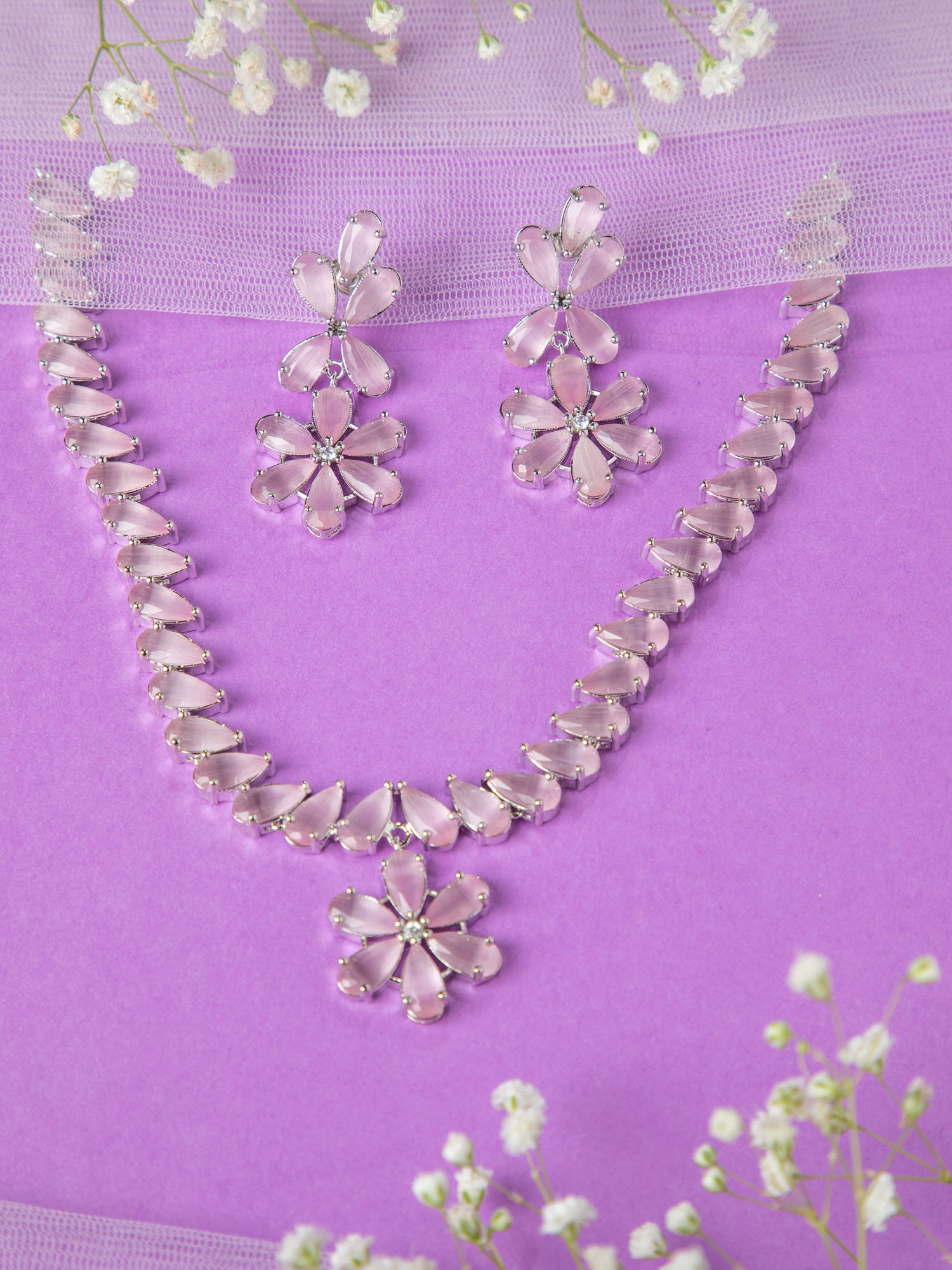 Rhodium Plated Pink AD Floral Necklace and Earrings Set