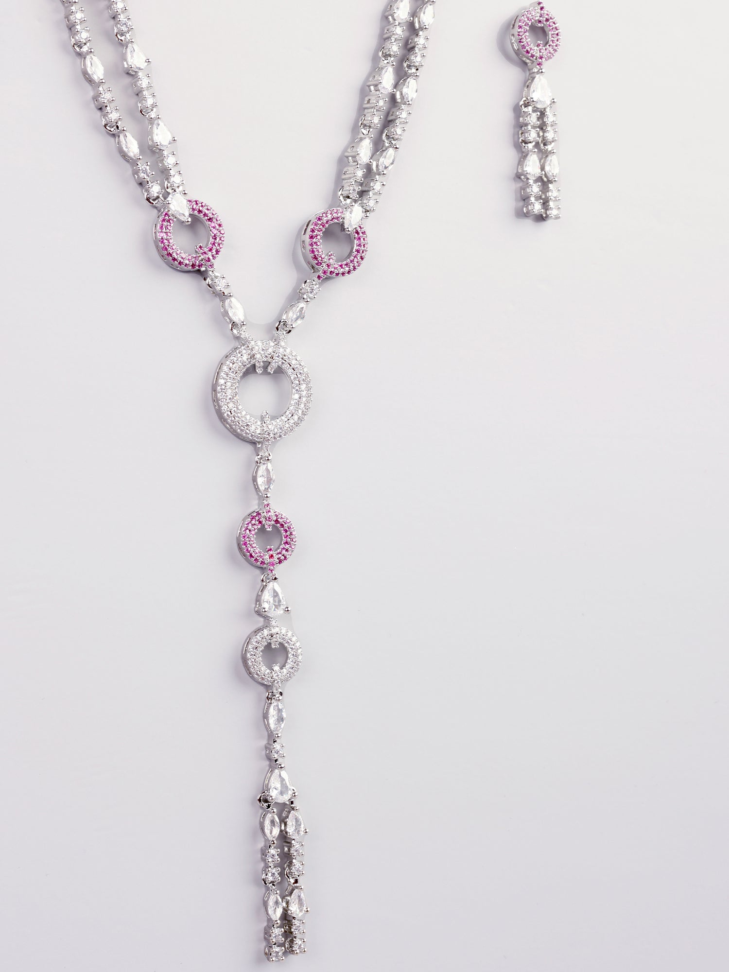 Rhodium Plated Pink and White American Diamond Necklace Set with Earrings