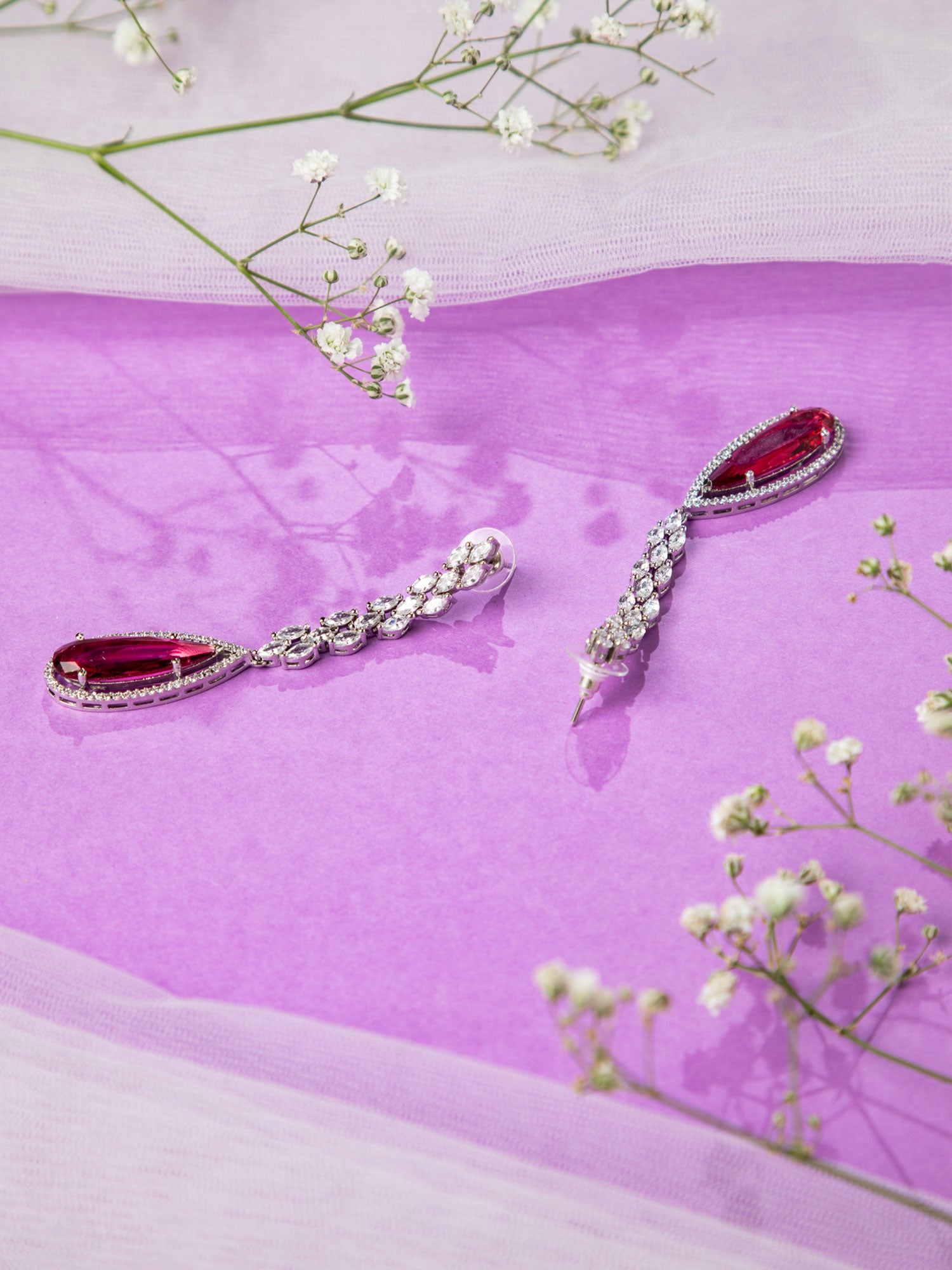 Handcrafted by local artisans, this rhodium-plated pink and white American diamond necklace set features a beautiful big pink stone pendant. The long earrings are studded with white AD stones and a stunning pink waterdrop stone—perfect for parties, festivals, or functions.