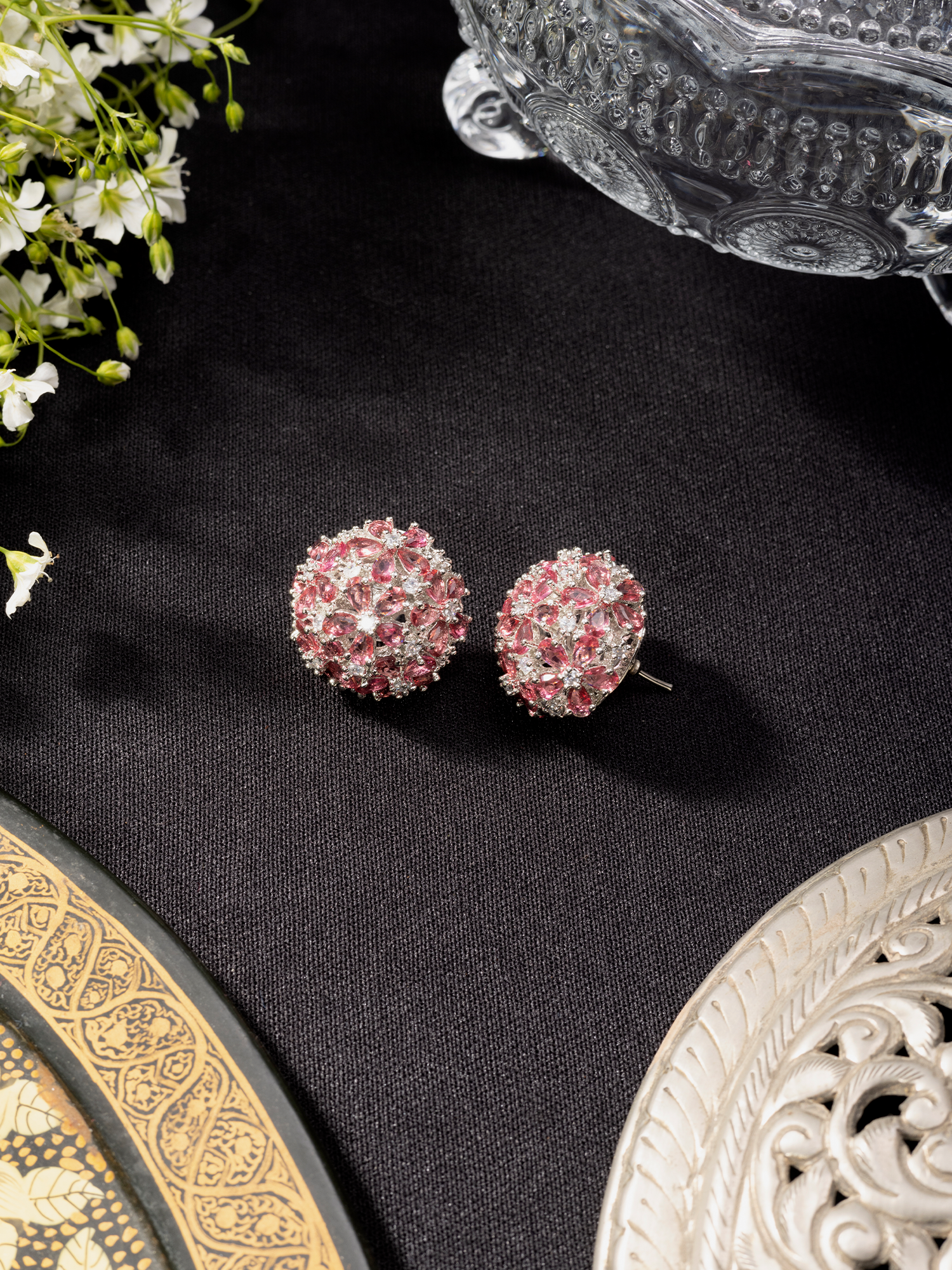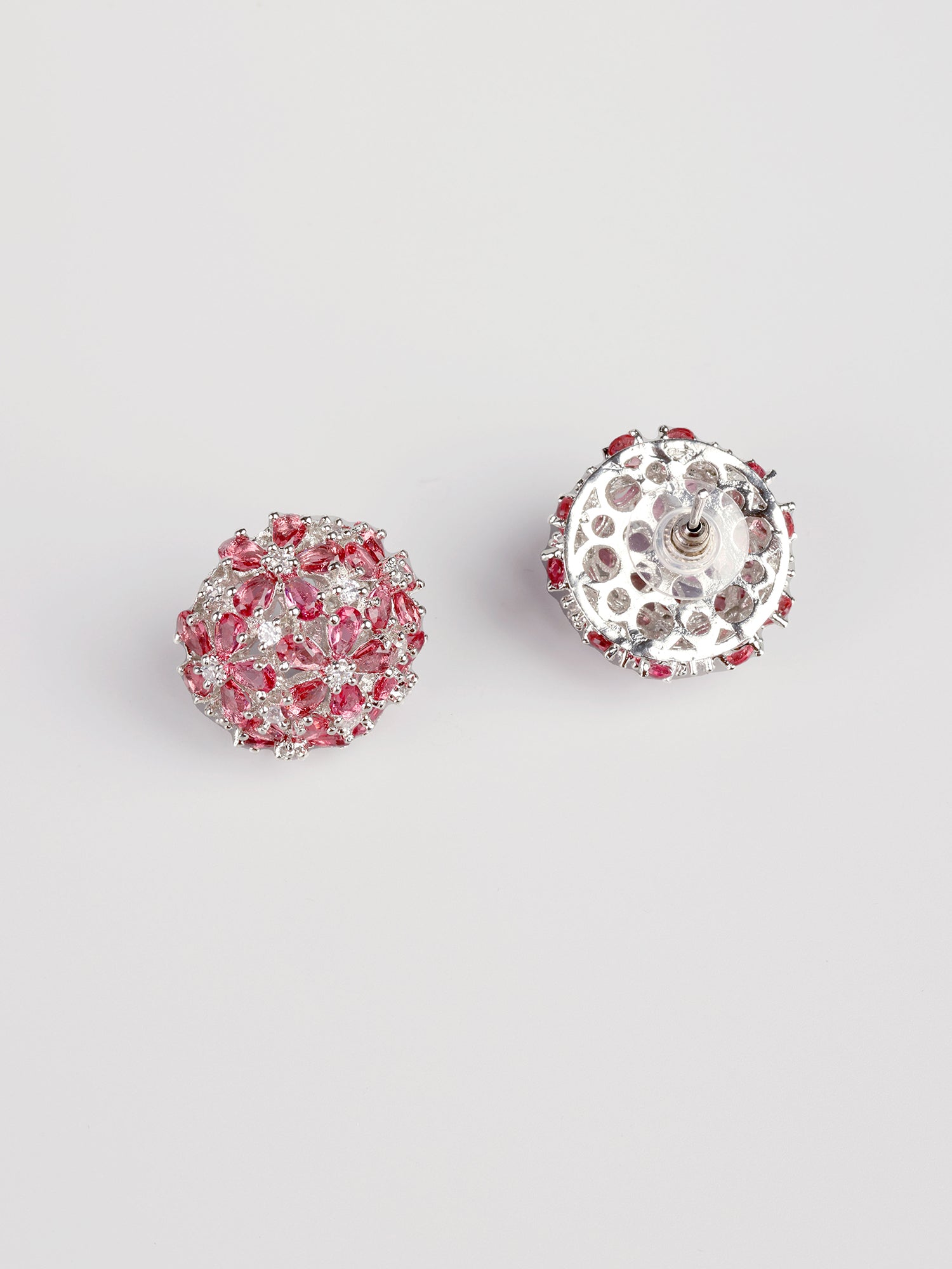 Enhance your look by pairing the Rhodium Plated Round Floral American Diamond Earrings with a chic red dress for a coordinated ensemble that exudes confidence and sophistication.
