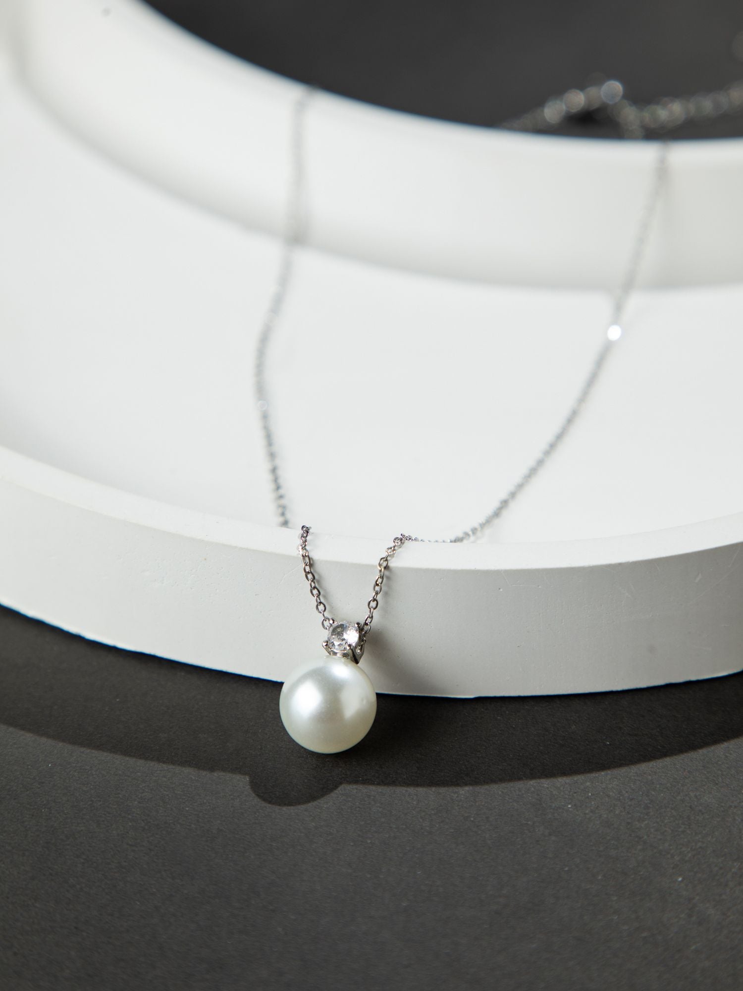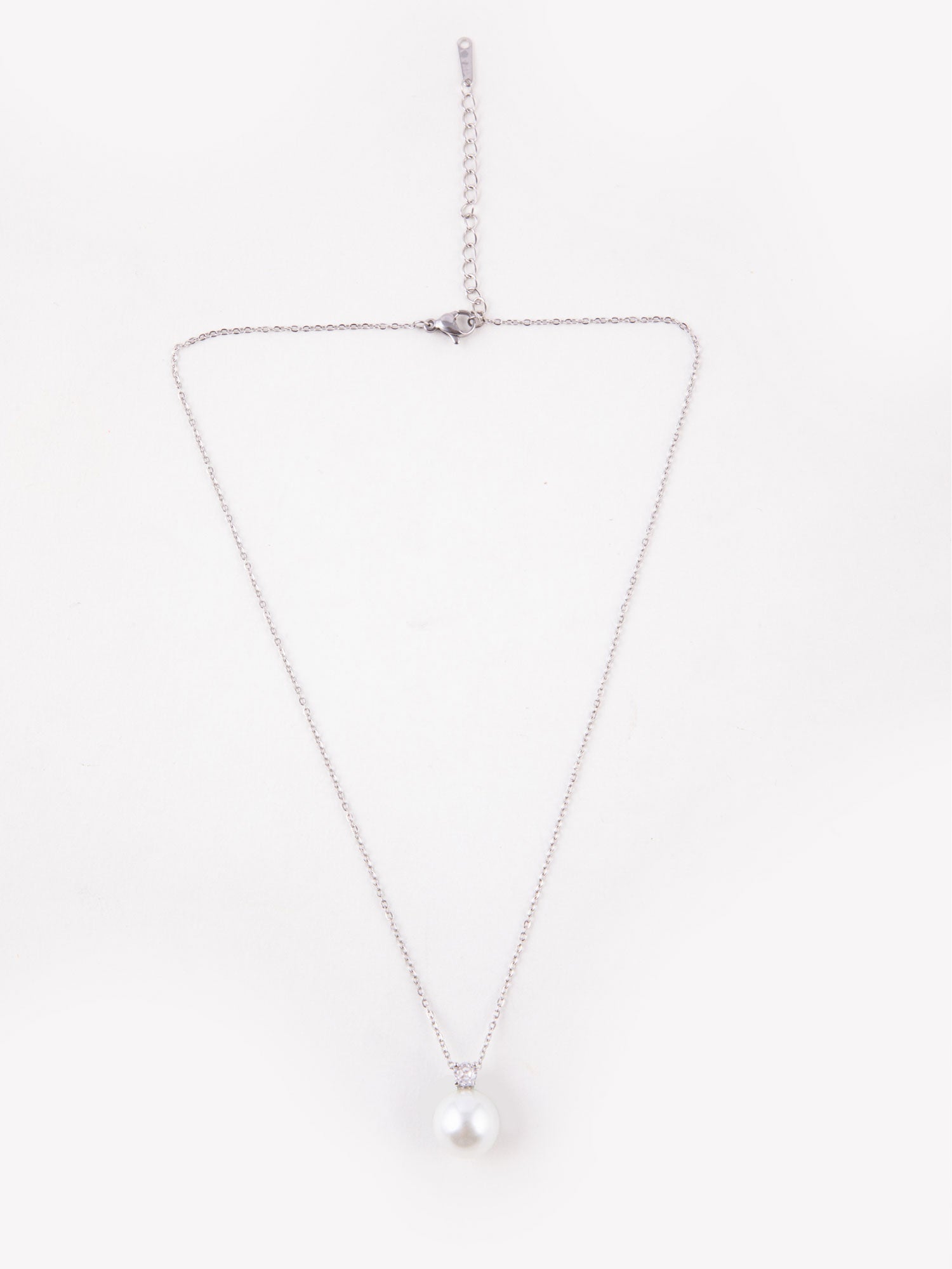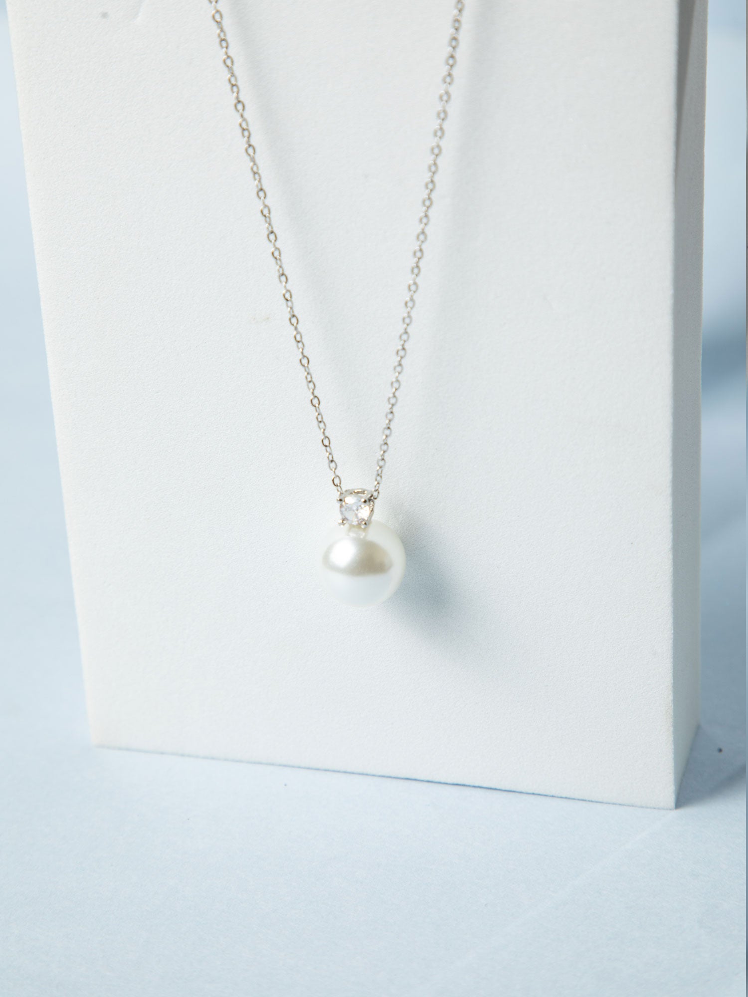 Rhodium Plated Thin Chain Necklace with Large White Faux Pearl Pendant