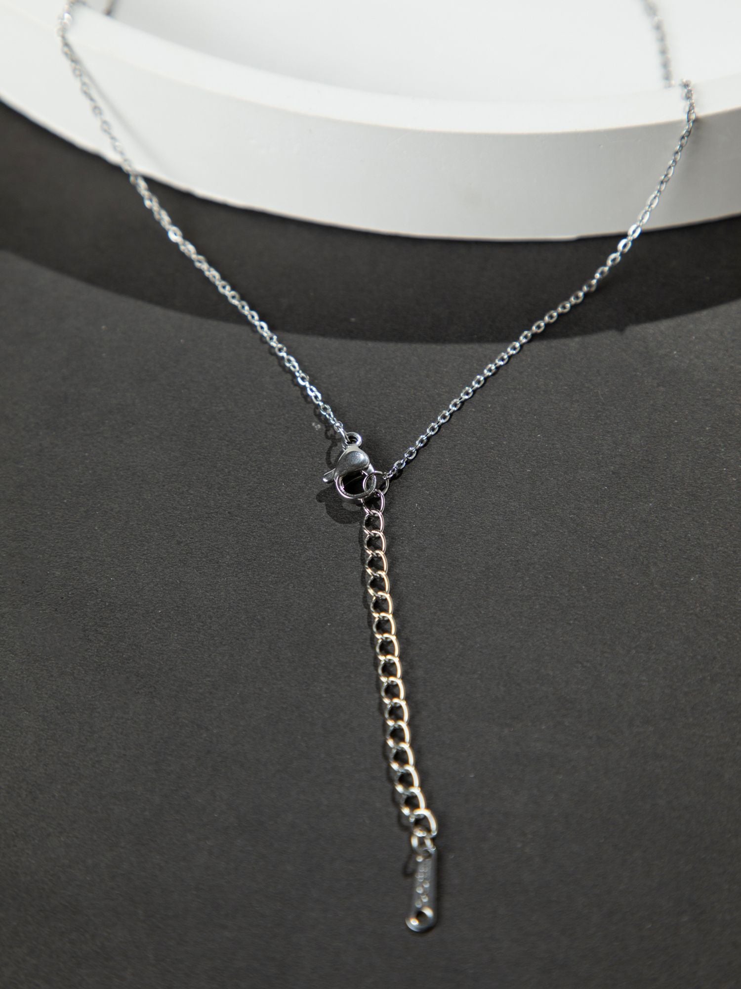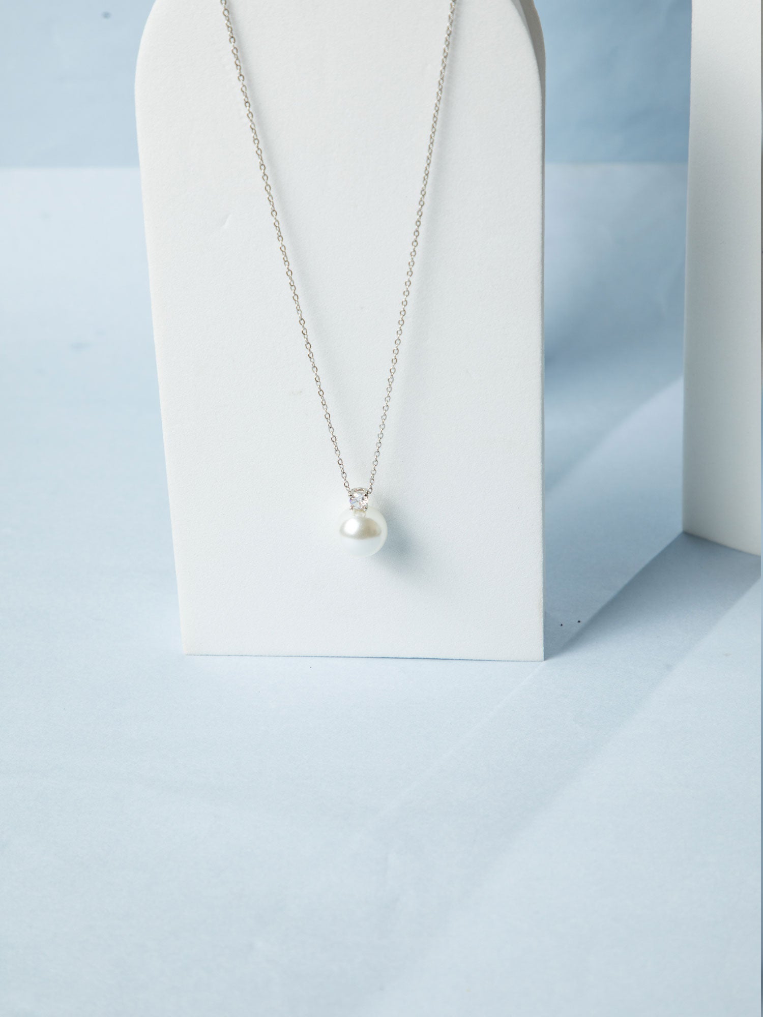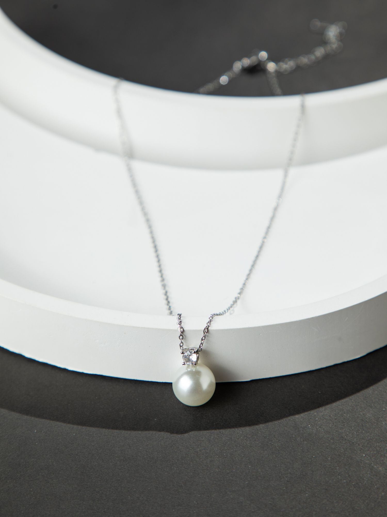Rhodium Plated Thin Chain Necklace with Large White Faux Pearl Pendant