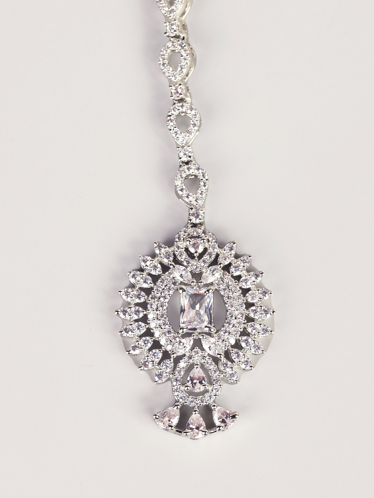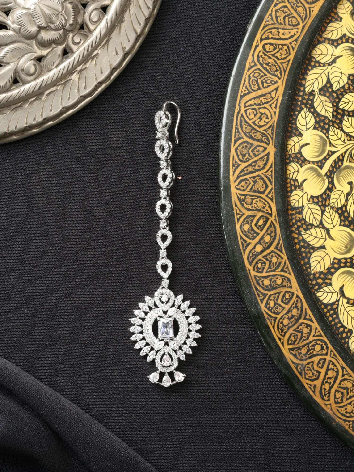 For a traditional look, pair the Rhodium Plated White American Diamond Maang-Teeka with a sleek bun and a vibrant saree or lehenga, allowing the sparkling stones to accentuate your ensemble with timeless elegance.