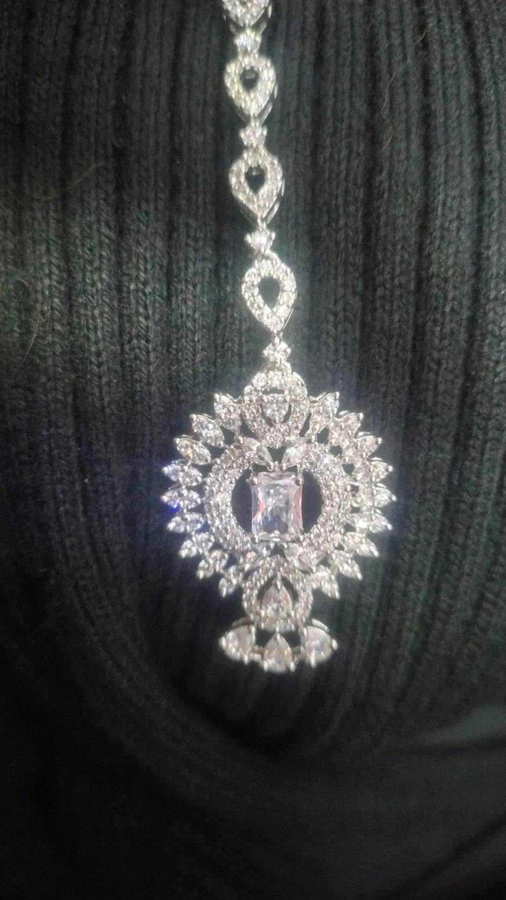 Introducing our exquisite Rhodium Plated White American Diamond Maang-Teeka, adorned with sparkling white American diamond stones meticulously arranged in a beautiful design. Handcrafted by skilled local artisans, this traditional Maang-Teeka features a trendy and fascinating new design that seamlessly blends elegance with cultural charm. Crafted with anti-tarnish and anti-allergic properties, it's perfect for both function and party wear, ensuring enduring beauty and comfort. Elevate your ensemble with this versatile accessory, ideal for adding a touch of sophistication to any occasion.