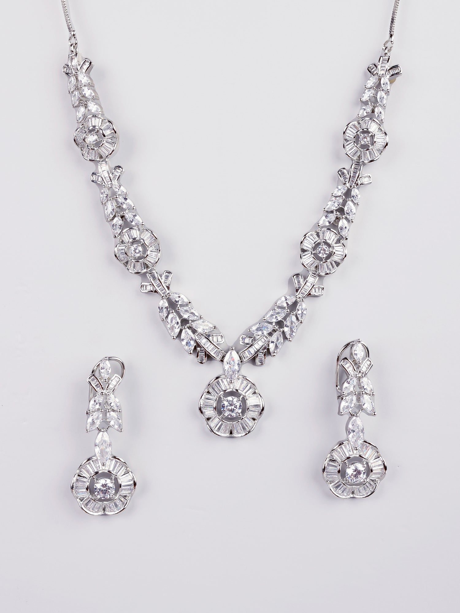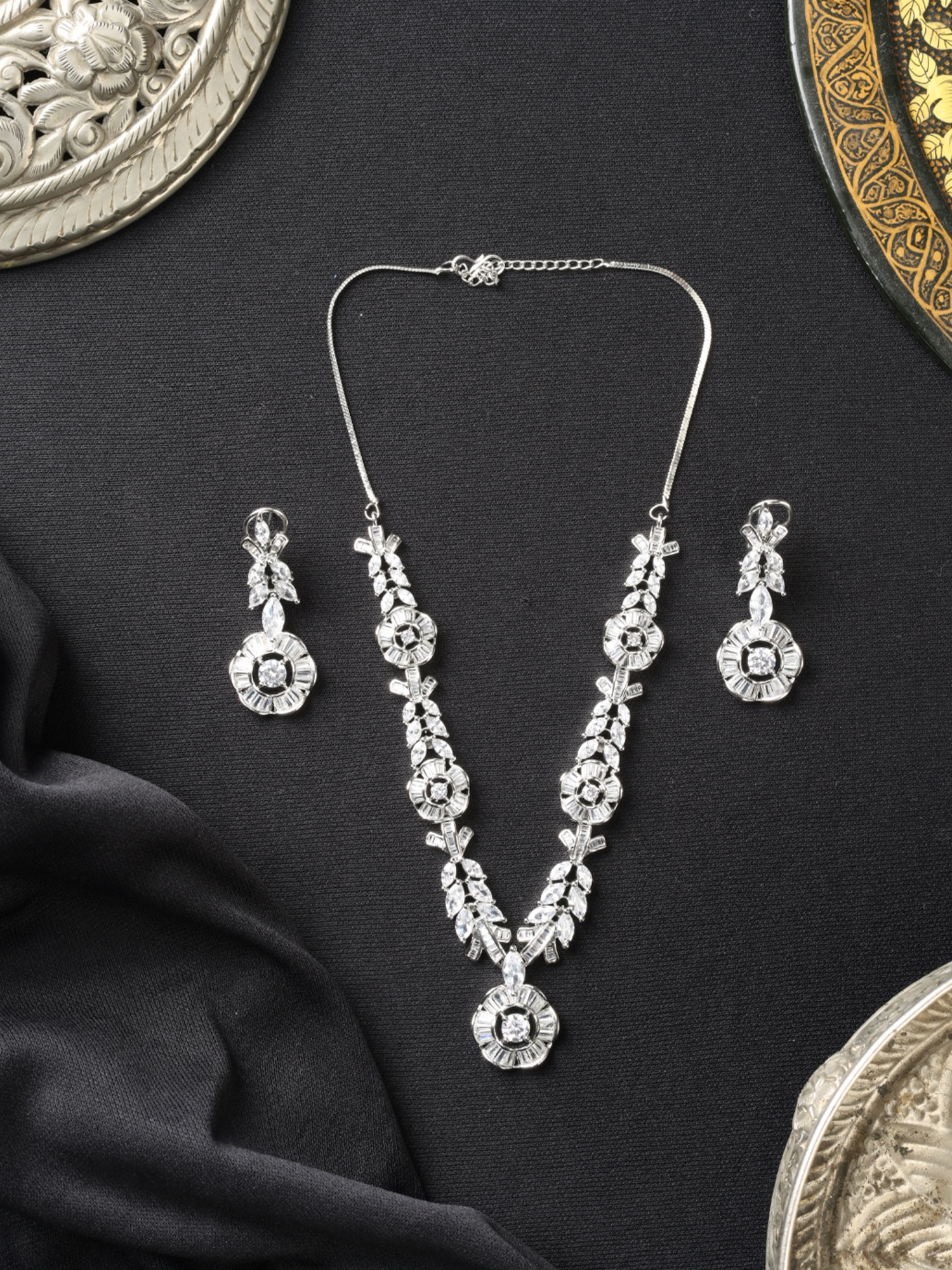 Introducing our captivating Rhodium Plated White American Diamond Necklace Set with matching earrings, adorned with sparkling white American diamond stones intricately arranged in a beautiful floral design. A must-wear for any function, this set features earrings with stunning white CZ stones. Handmade by local artisans, it showcases a trendy and fascinating new design, crafted with anti-tarnish and anti-allergic properties. Versatile for both function and party wear, this set adds timeless elegance to any ensemble.