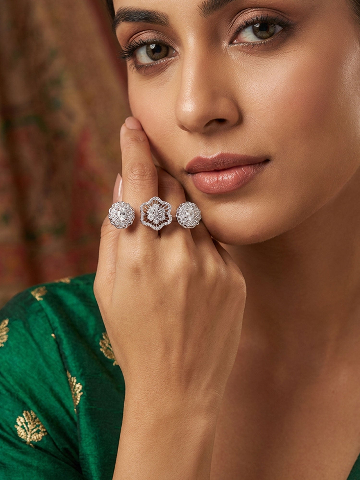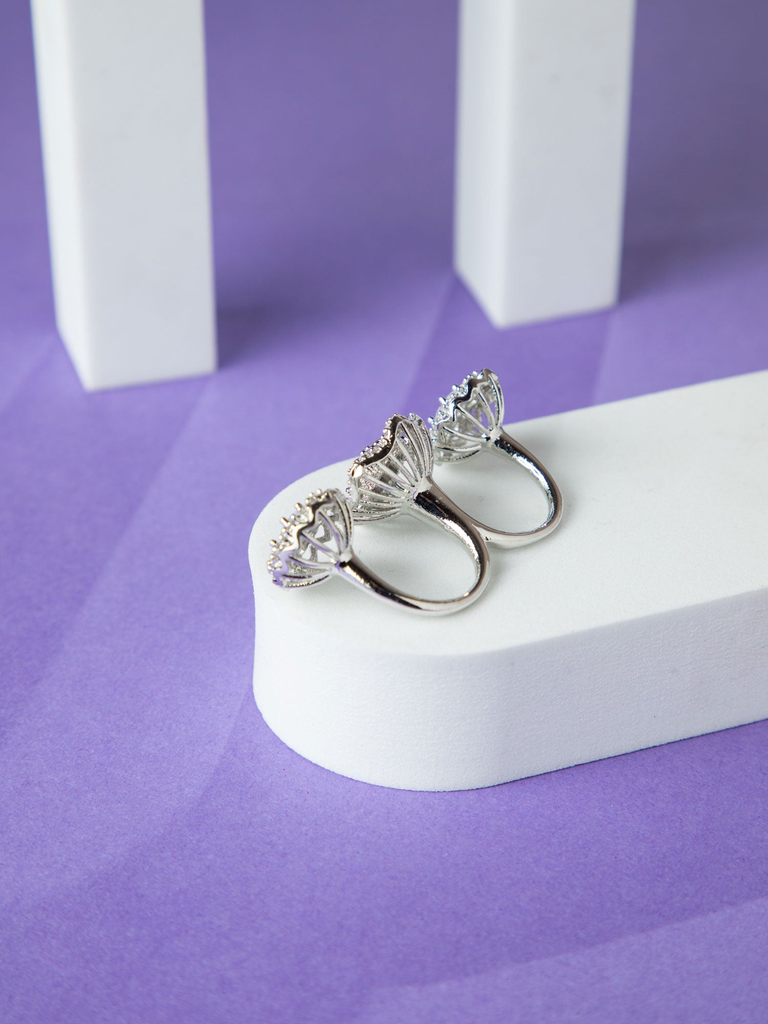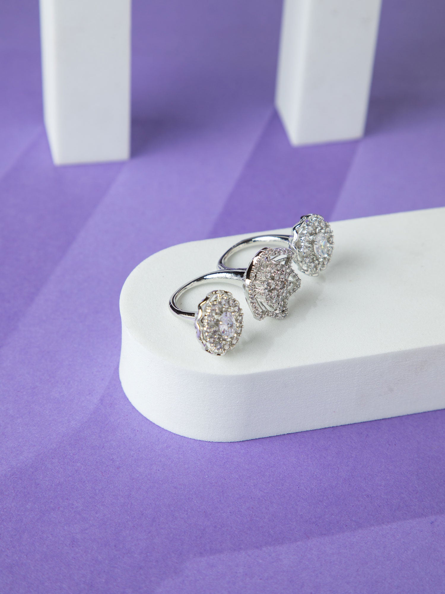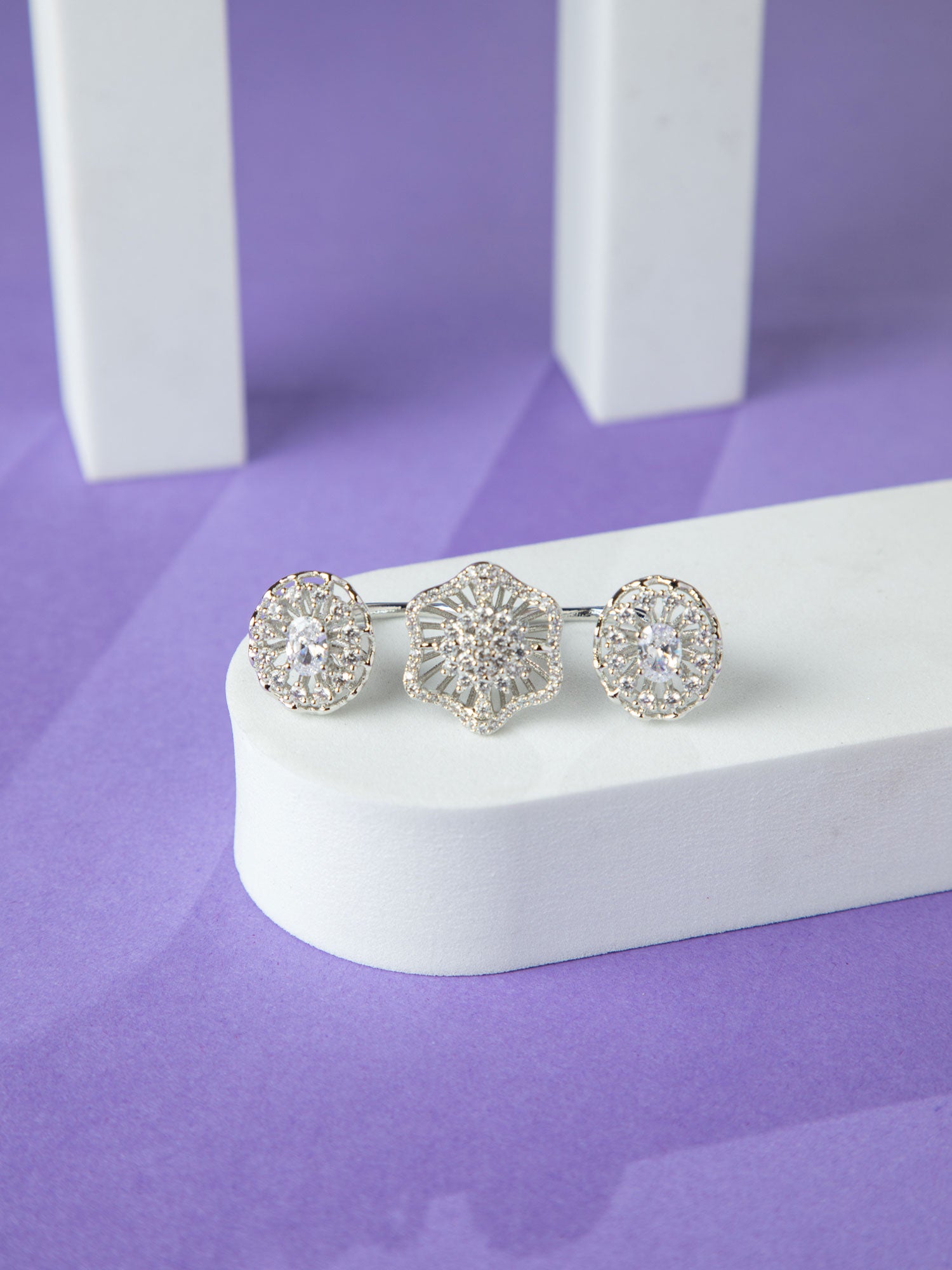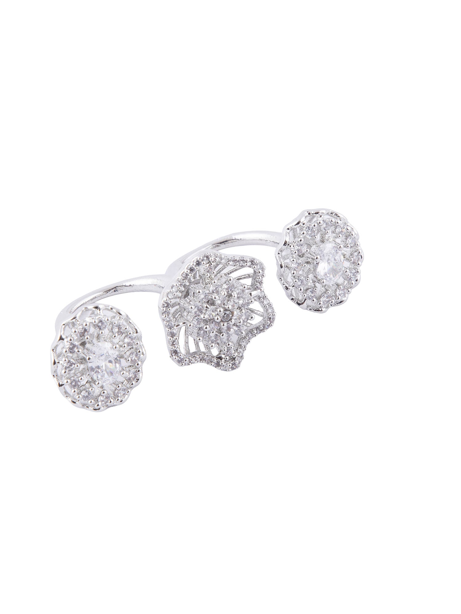 Rhodium Plated White American Diamond Two Finger Statement Ring