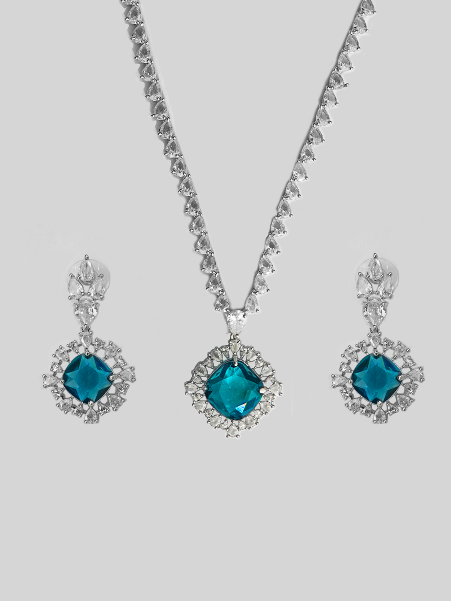 Discover sophistication with our Rhodium Plated White and Blue American Diamond Necklace Set with Earrings. Crafted with sparkling high-quality Royal Blue and White AD stones, this set exudes opulence. The pendant features a captivating Sapphire AD stone surrounded by delicate white water drop AD stones, adding an exquisite touch. Complemented by attractive earrings adorned with white and blue American diamond stones, this ensemble is handcrafted by local artisans, guaranteeing anti-tarnish and anti-allergic properties. Perfect for functions, festivals, and parties, elevate your style with this timeless masterpiece.
