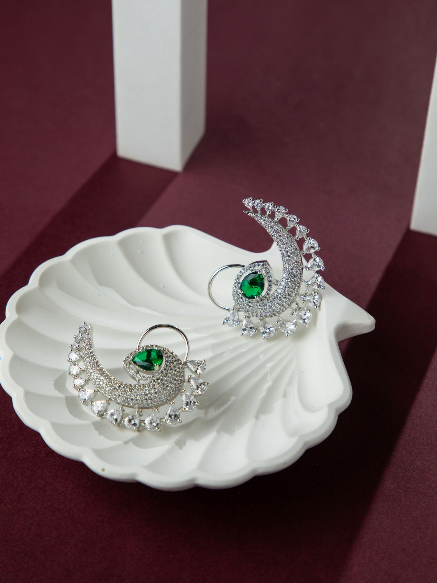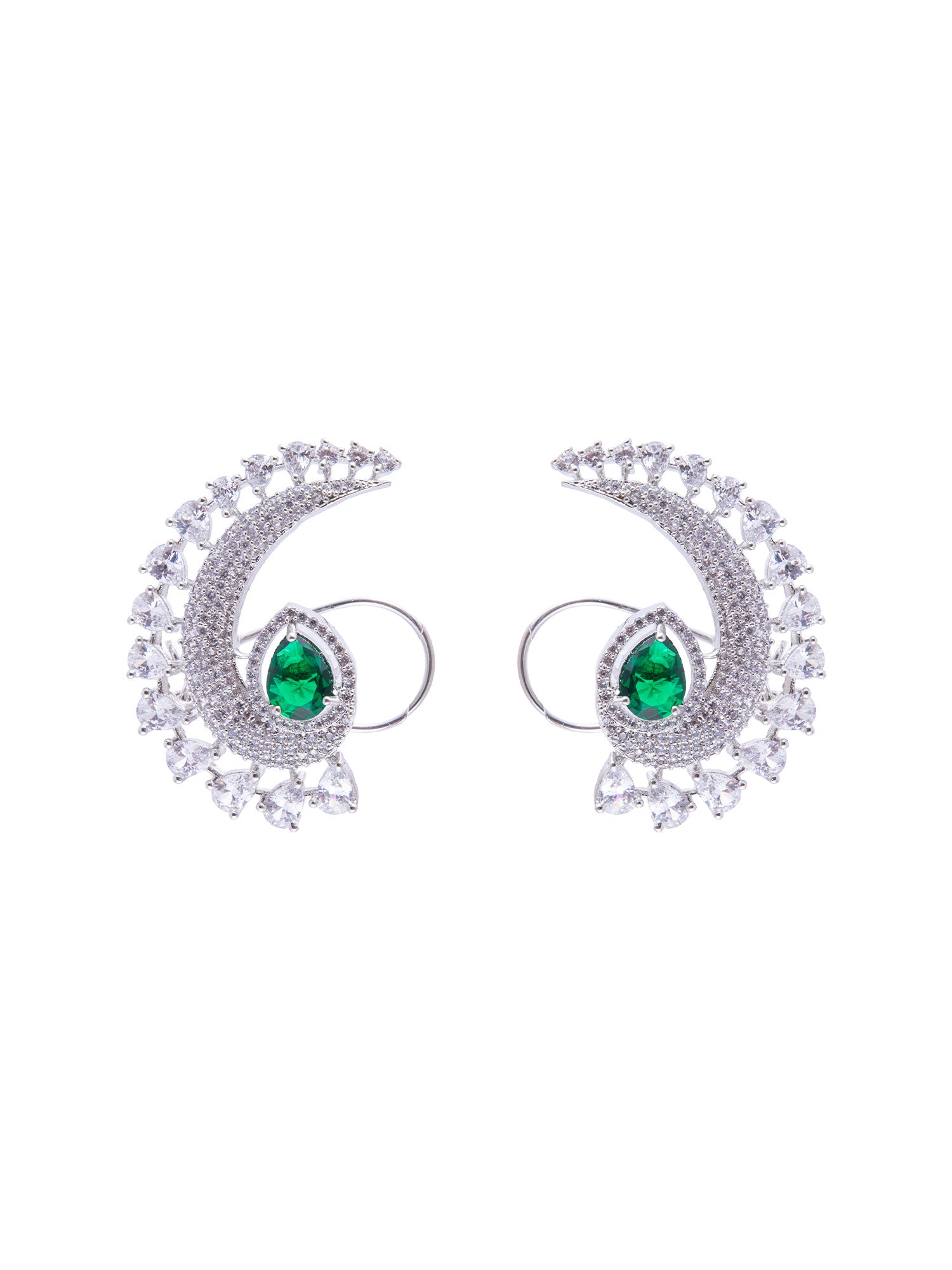 Rhodium Plated White and Green American Diamond Ear Cuff Earrings