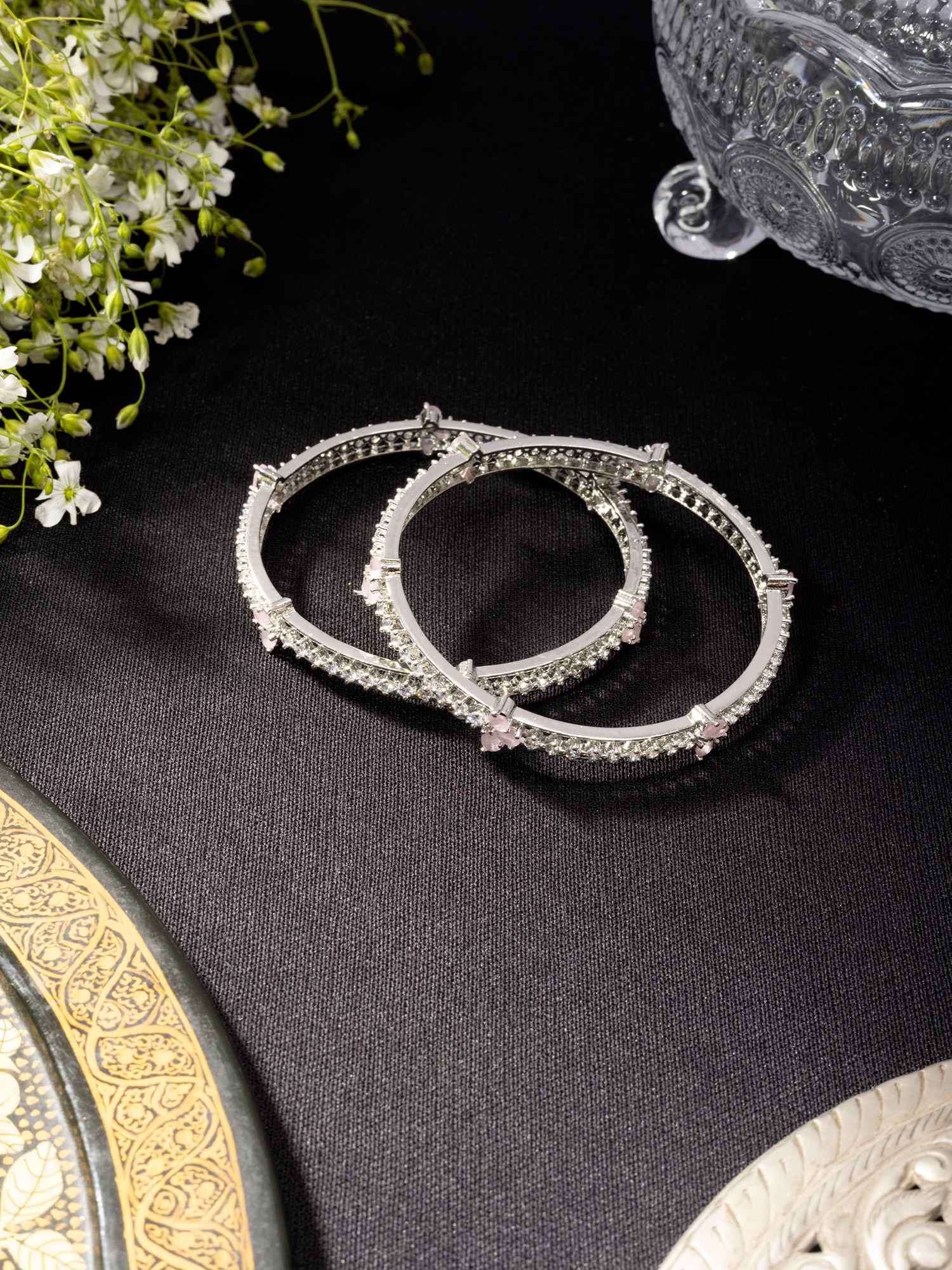 Introducing our exquisite Rhodium Plated White and Pink AD Bangles, a set of two adorned with beautiful American diamond stones. Meticulously crafted by local artisans, these bangles feature a trendy and fascinating new design that seamlessly blends elegance with modern flair. With anti-tarnish and anti-allergic properties, they are suitable for both function and party wear, ensuring enduring beauty and comfort. Elevate your ensemble with these versatile bangles, perfect for adding a touch of glamour to any occasion.