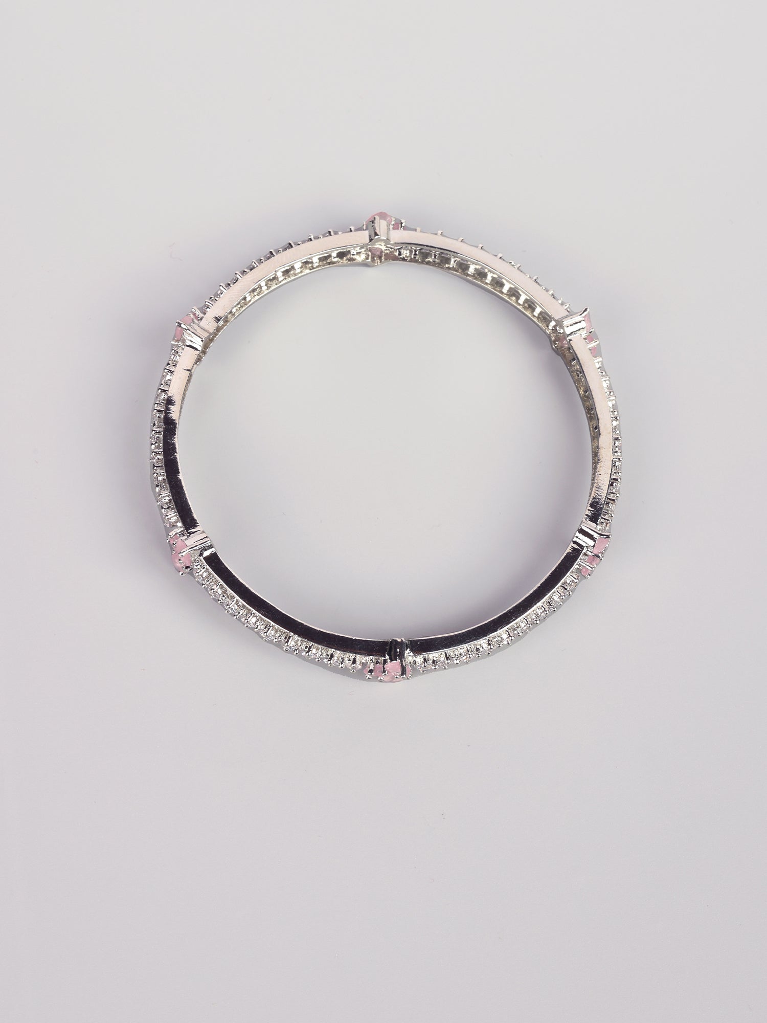 Stack the Rhodium Plated White and Pink AD Bangles with delicate silver bracelets for a chic layered look, or wear them alone as statement pieces to add a pop of sparkle to your outfit.