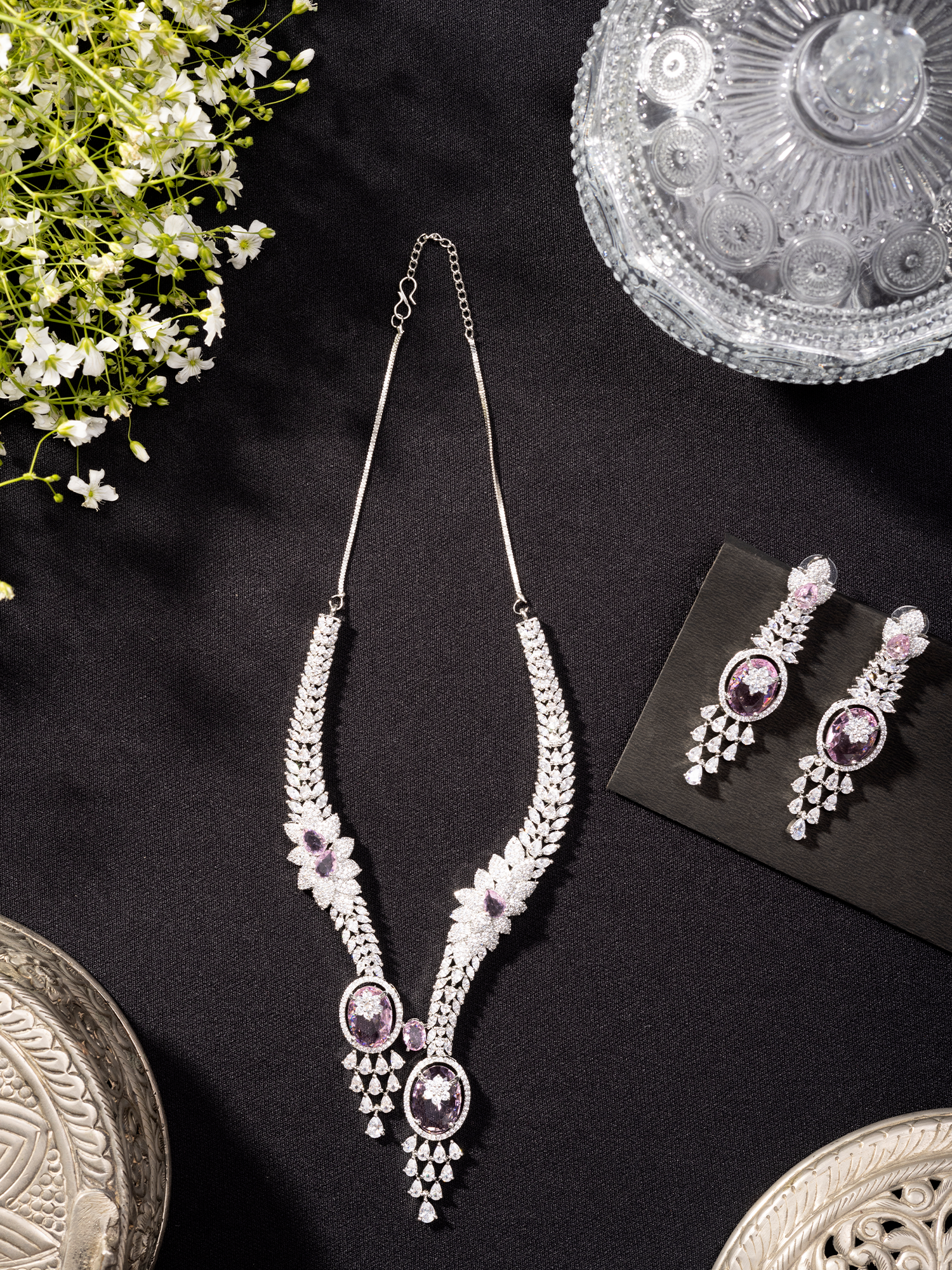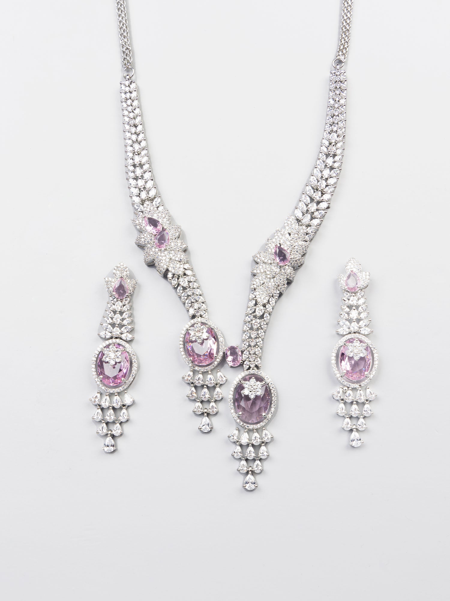 For a chic and feminine look, pair the Rhodium Plated White and Pink American Diamond Necklace Set with soft curls and a pastel-colored dress, letting the pink stones complement your outfit for a charming ensemble.