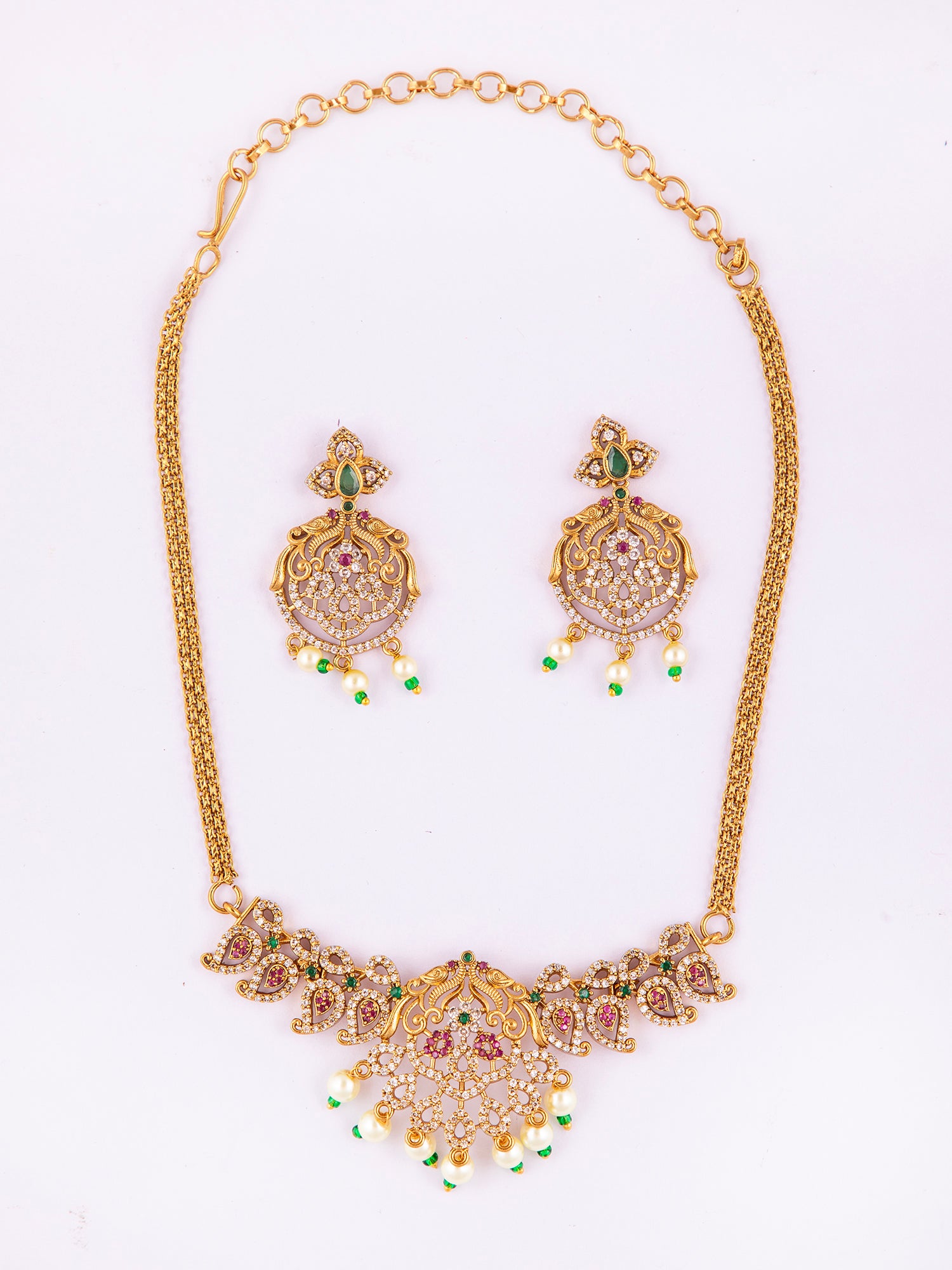 Step into timeless tradition with the Riwaayat Necklace Set — a majestic piece crafted in a rich gold-plated finish, adorned with sparkling American Diamonds and accented with vibrant pink and green stones. The intricate peacock-inspired detailing, floral motifs, and delicate pearl drops evoke a regal, heritage charm. Paired with coordinating earrings, this set is perfect for weddings, cultural festivities, and grand celebrations.