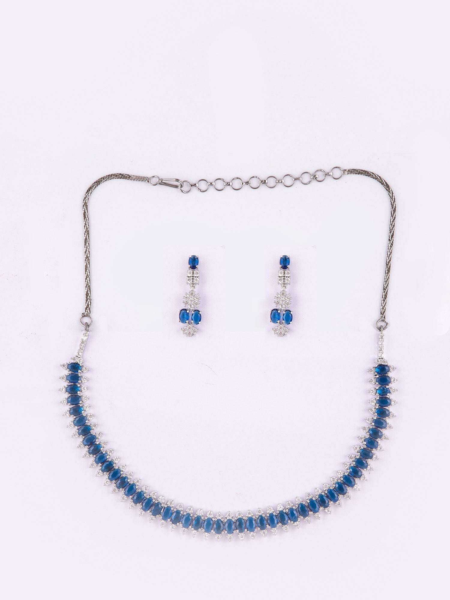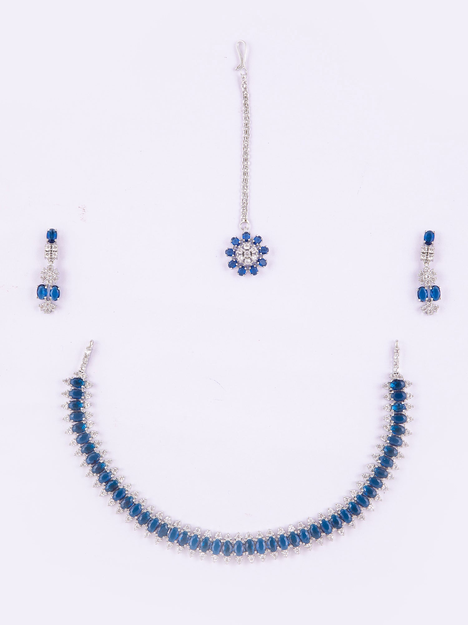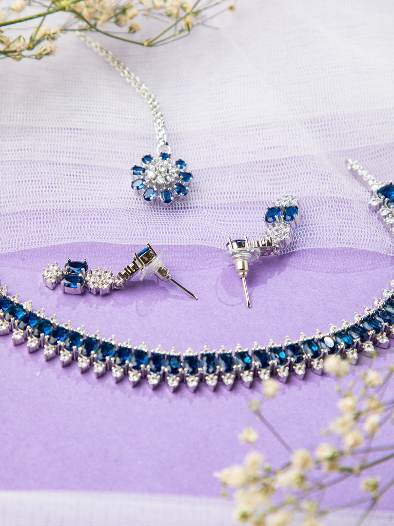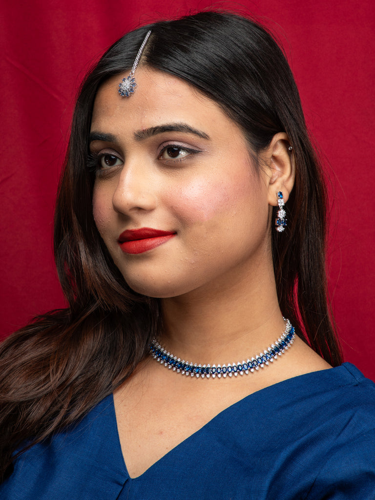 Make a bold and elegant statement with the Royal Aura Necklace Set — a sophisticated piece featuring deep royal blue stones surrounded by a radiant frame of American Diamonds. Plated in sleek rhodium for a high-shine, anti-tarnish finish, this necklace set captures the essence of modern royalty. The coordinated earrings complete the look, adding graceful sparkle and refinement. Perfect for grand occasions, this set brings an air of elegance and confidence to every ensemble.