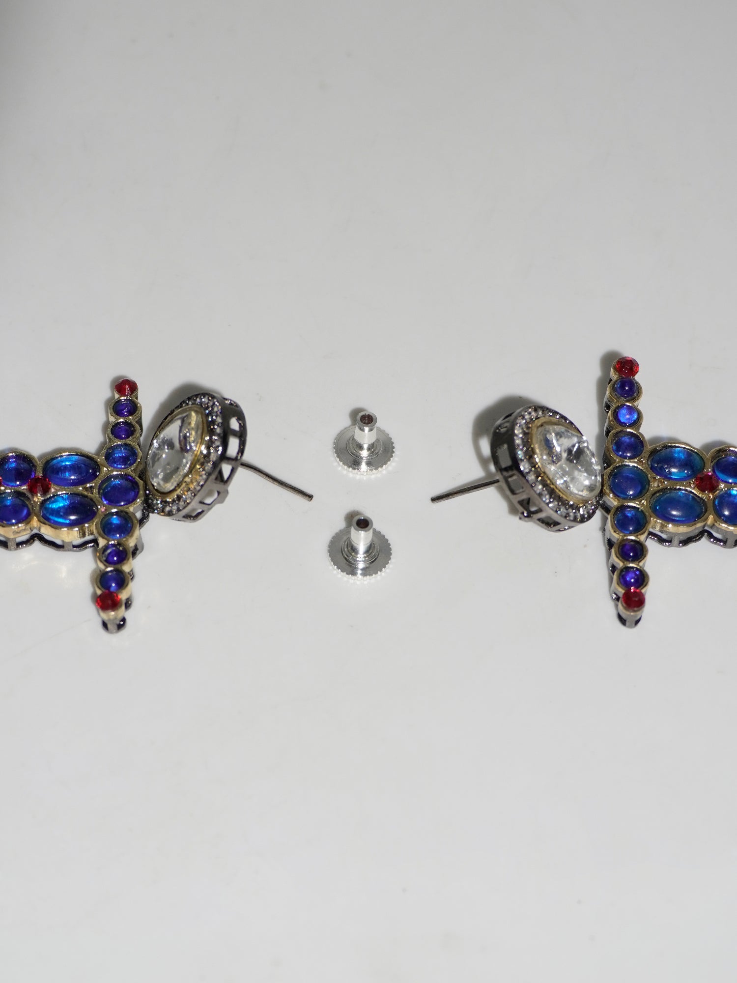 Stunning dual-tone gold-plated and black long cross-shaped earrings, featuring mesmerizing royal blue stones, white waterdrop kundans, and red and white CZ stones. A modern, handcrafted design by local artisans, perfect for parties, festivals, or functions. A must-have statement piece.