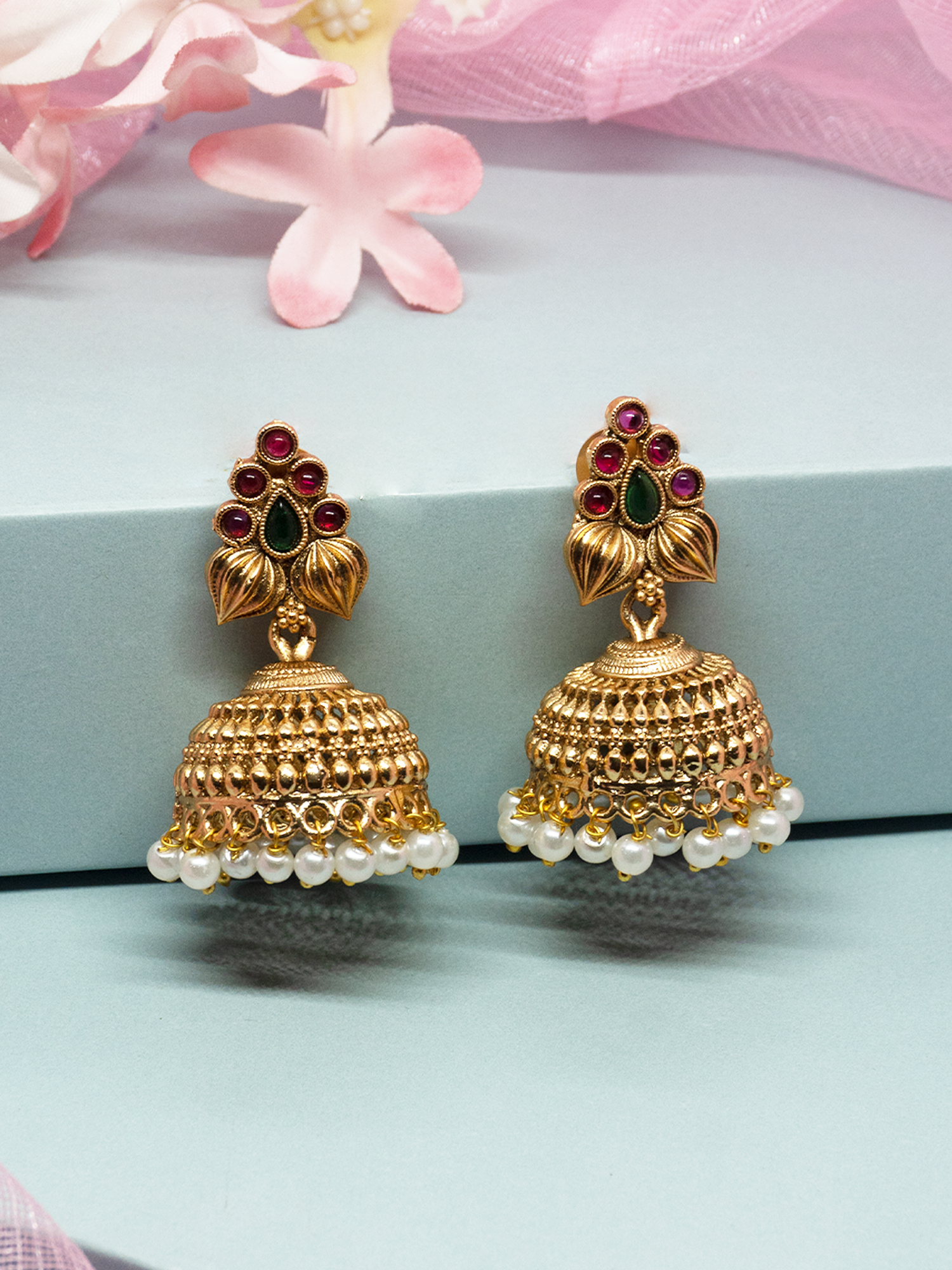 Embrace timeless elegance with the Niscka Royal Gold Plated Emerald Ruby and Pearl Jhumki. These stunning earrings feature a luxurious gold-plated design adorned with vibrant emeralds, striking rubies, and radiant pearls. The intricate detailing of the jhumki captures the essence of traditional craftsmanship, while the rich color palette and classic pearls add a touch of sophistication and grandeur. Perfect for special occasions and festive celebrations, the Niscka Royal Jewel Jhumki Earrings make a bold statement with their exquisite blend of color and elegance. Elevate your ensemble with these captivating earrings and experience a new level of glamour.