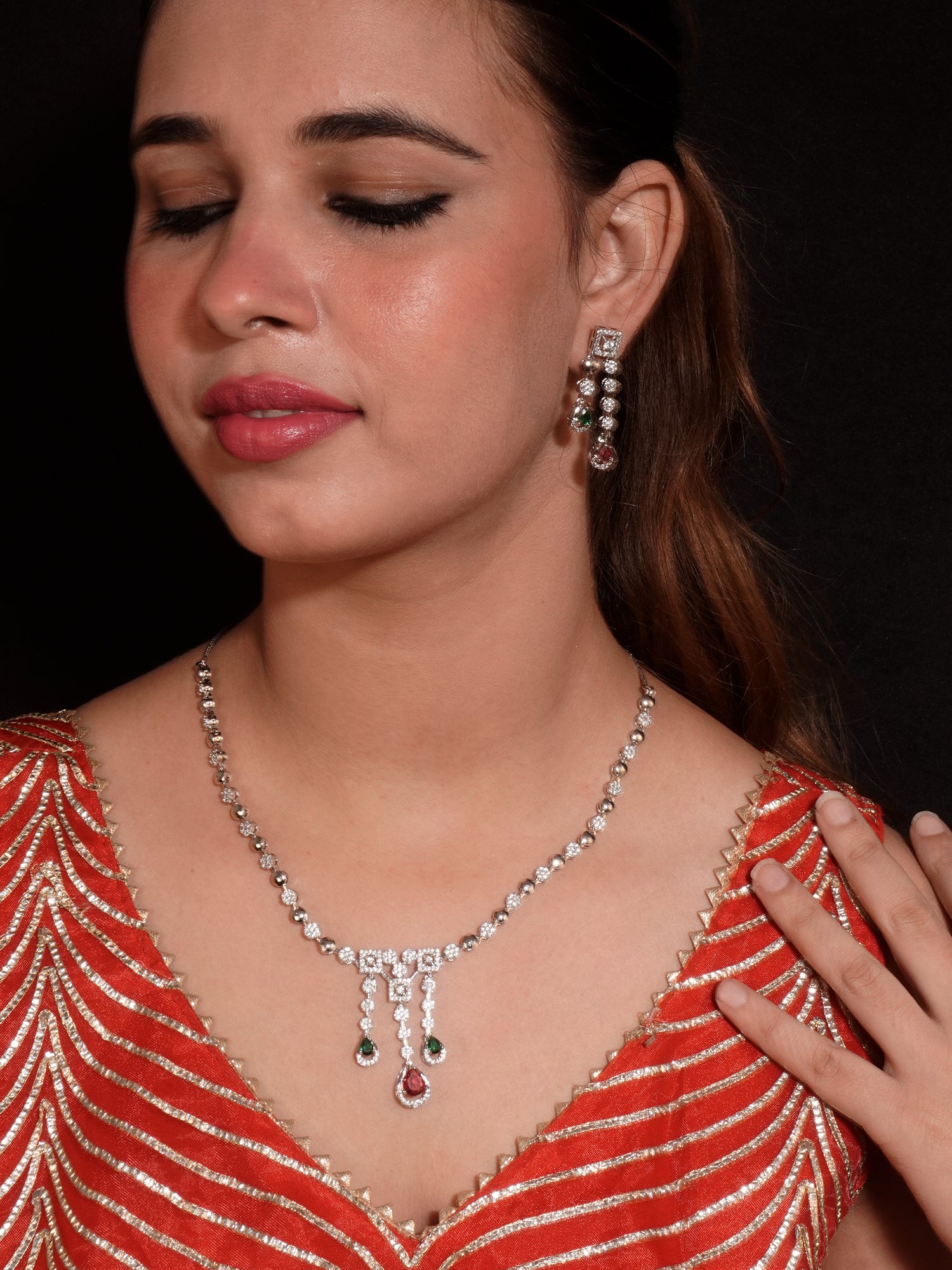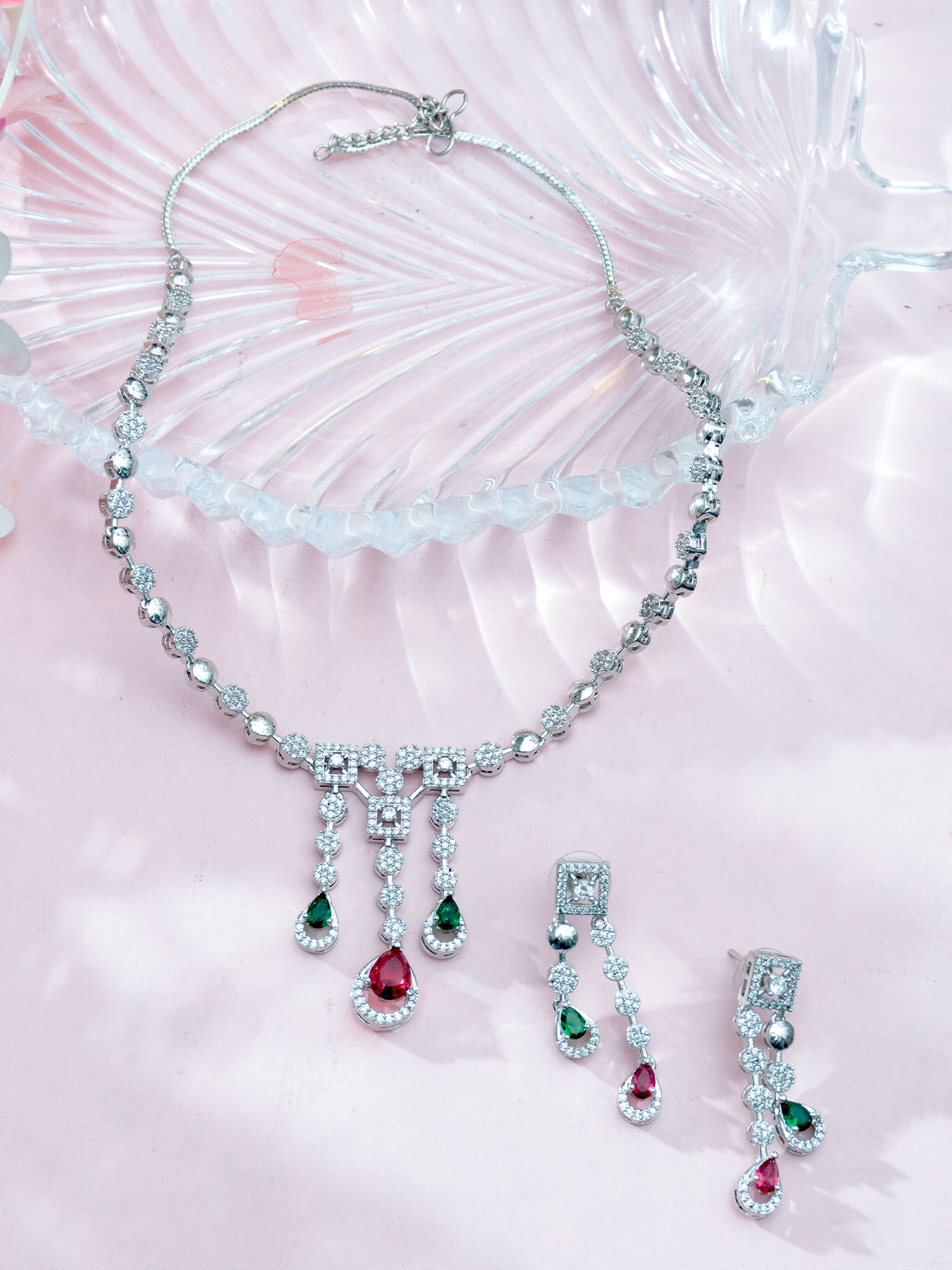 Indulge in timeless elegance with this exquisite jewelry set from Niscka, featuring vibrant ruby and emerald stones in graceful water-drop designs. Accentuated with sparkling Grade AAA+ American diamonds, each piece in the set radiates brilliance and charm. The rhodium-polished finish ensures a sleek, luxurious sheen, making it perfect for both traditional events and modern celebrations.