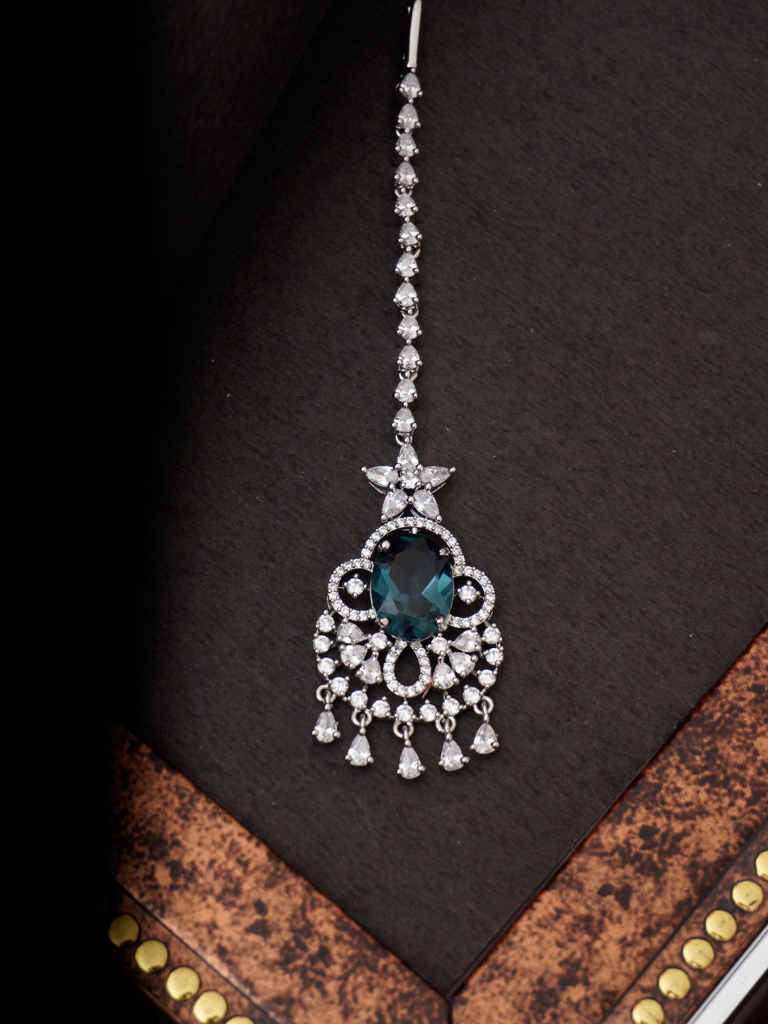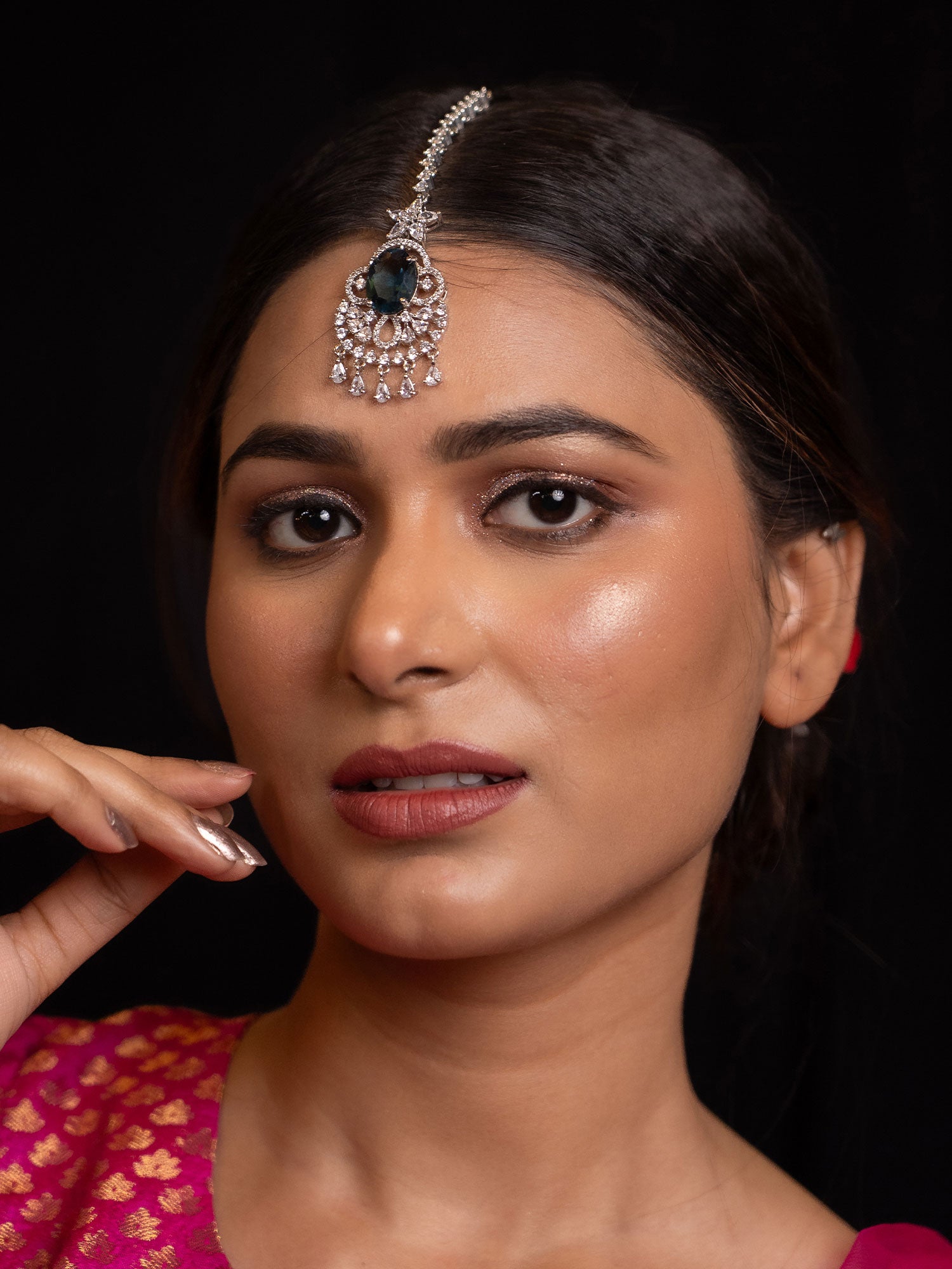 This exquisite silver-plated mangtikka is a beautiful blend of traditional elegance and modern charm. Featuring a sparkling American diamond centerpiece, the piece is adorned with vibrant green stones that add a pop of color and enhance its allure. The shimmery stones catch the light with every movement, creating a stunning effect that will complement any attire. Perfect for weddings, festive occasions, or any special event, this mangtikka is sure to make you stand out with its delicate design and radiant shine. Whether you're dressing up for a grand celebration or simply adding a touch of elegance to your ensemble, this piece is the perfect finishing touch.