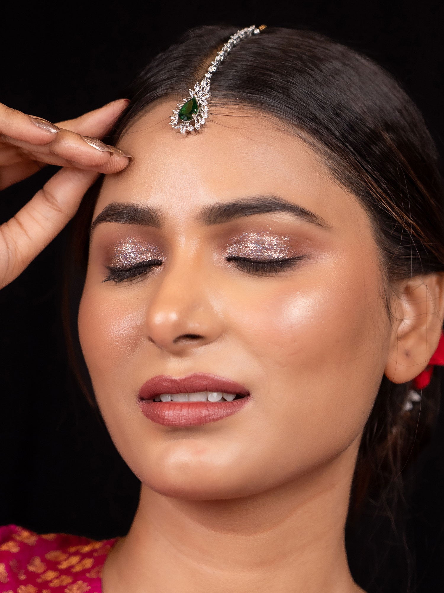 For a regal and striking look, pair this silver-plated American diamond and green emerald mangtikka with a traditional saree or lehenga in rich colors like red, gold, or emerald green. The green emerald will beautifully complement these shades, adding depth and vibrancy to your outfit. For the perfect finish, style your hair in an elegant updo or soft curls to showcase the mangtikka. Keep other accessories minimal, allowing this beautiful piece to be the focal point of your ensemble.