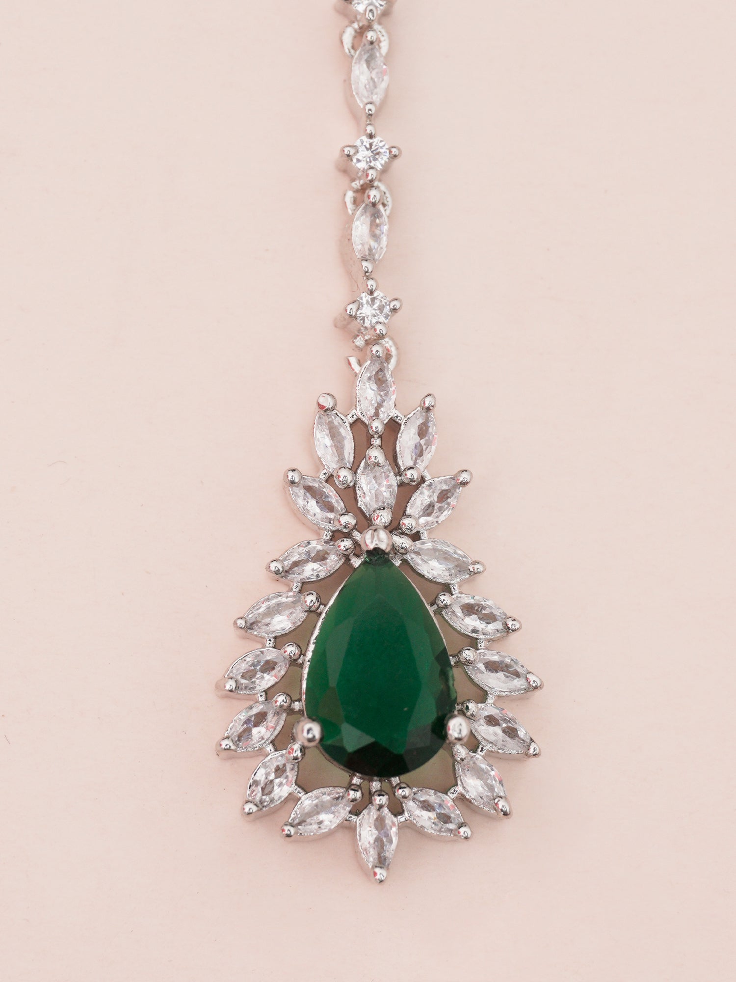 This silver-plated mangtikka is a stunning blend of timeless elegance and modern charm. Featuring a sparkling American diamond centerpiece, it radiates with brilliance, while the vibrant green emerald adds a pop of color and richness to the design. The intricate detailing and luxurious finish make it the perfect accessory for weddings, festive occasions, or any special celebration. Crafted with care, the silver plating ensures long-lasting shine, and the combination of American diamonds and green emeralds creates a mesmerizing, eye-catching effect. Elevate your traditional look with this exquisite mangtikka that beautifully complements any attire.
