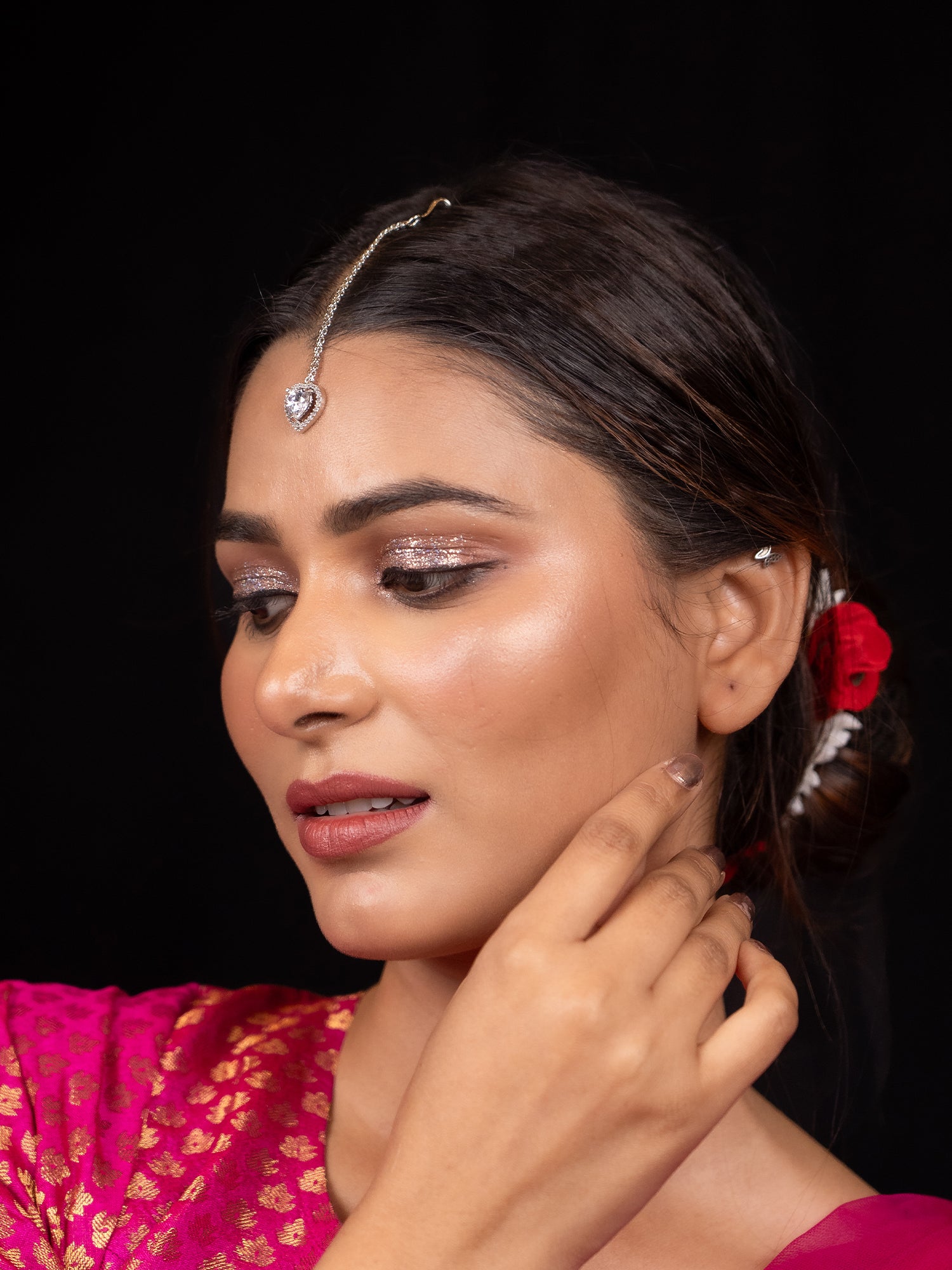 Pair this silver-plated zircon heart design mangtikka with a traditional saree or lehenga in soft pastel shades for an elegant and feminine look. For a modern twist, wear it with an ethnic fusion outfit like a kurti and palazzo pants, allowing the mangtikka to add a delicate yet striking touch to your ensemble. Perfect for weddings or festive events, it will elevate your overall appearance with grace.