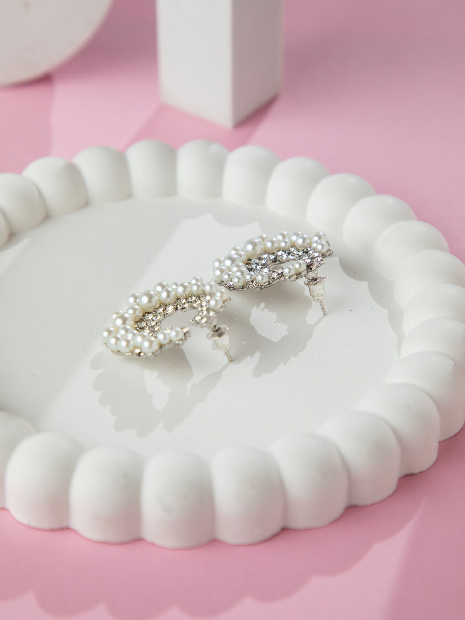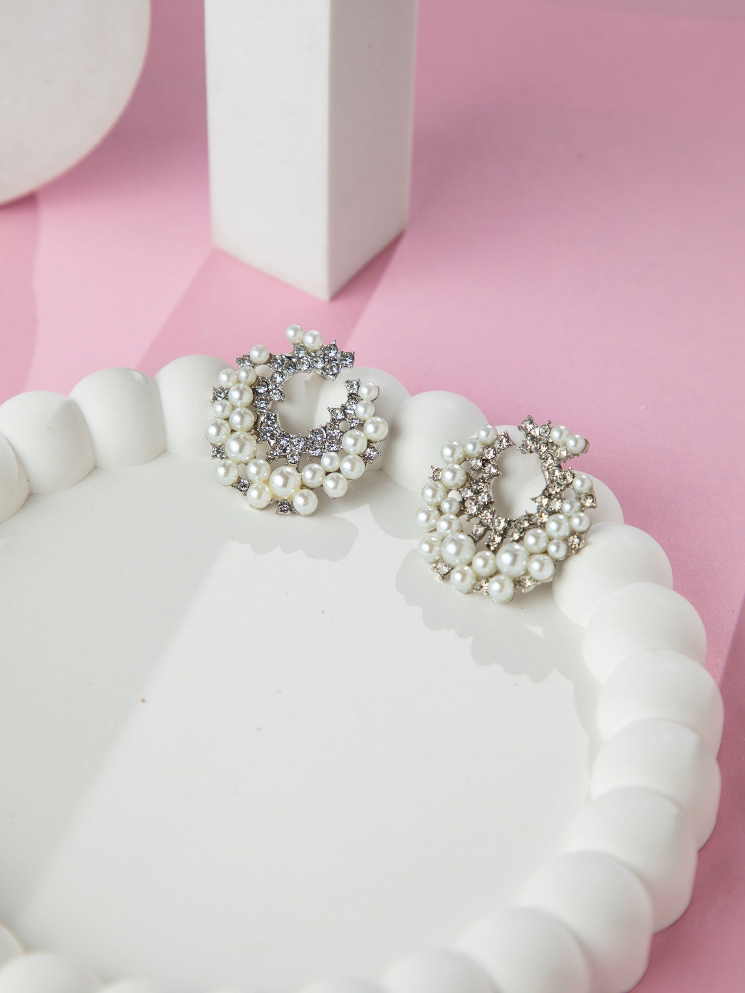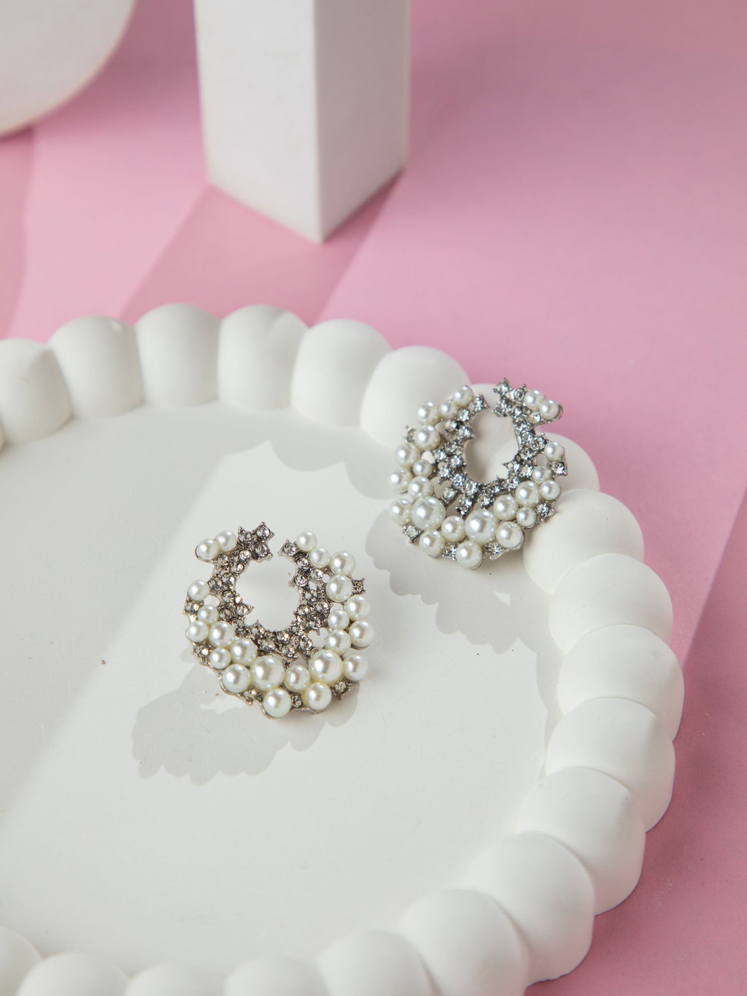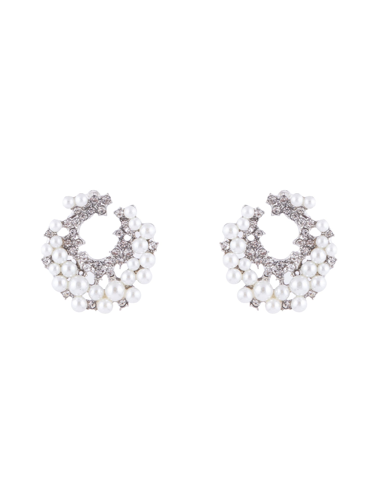 Silver Plated Round Earrings with White CZ Stones and Faux Pearl