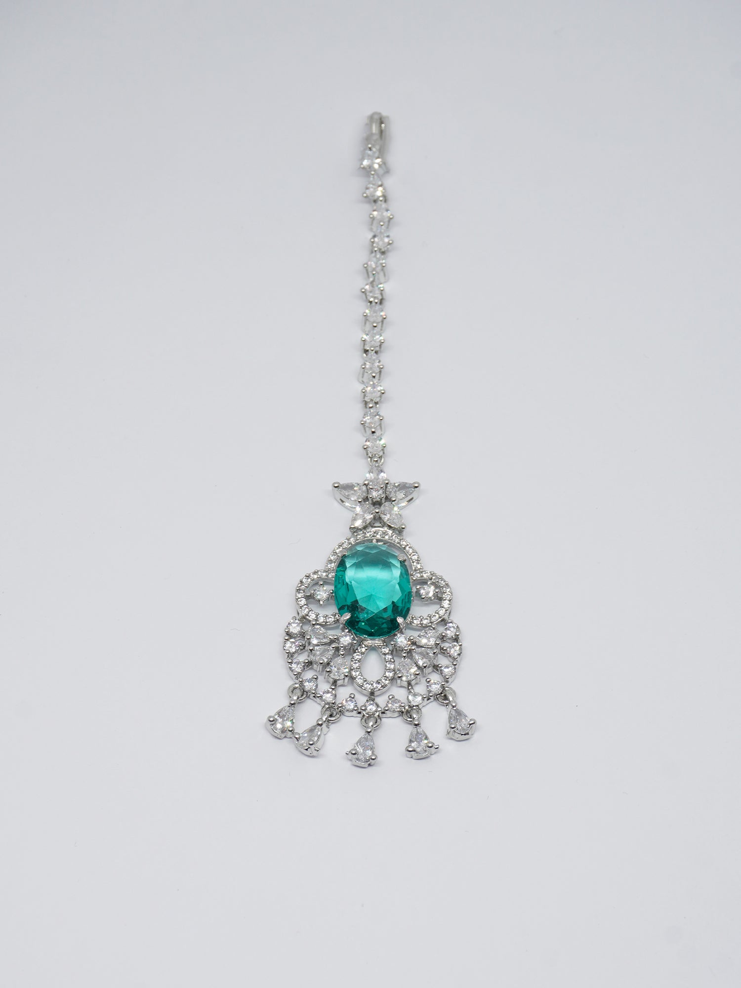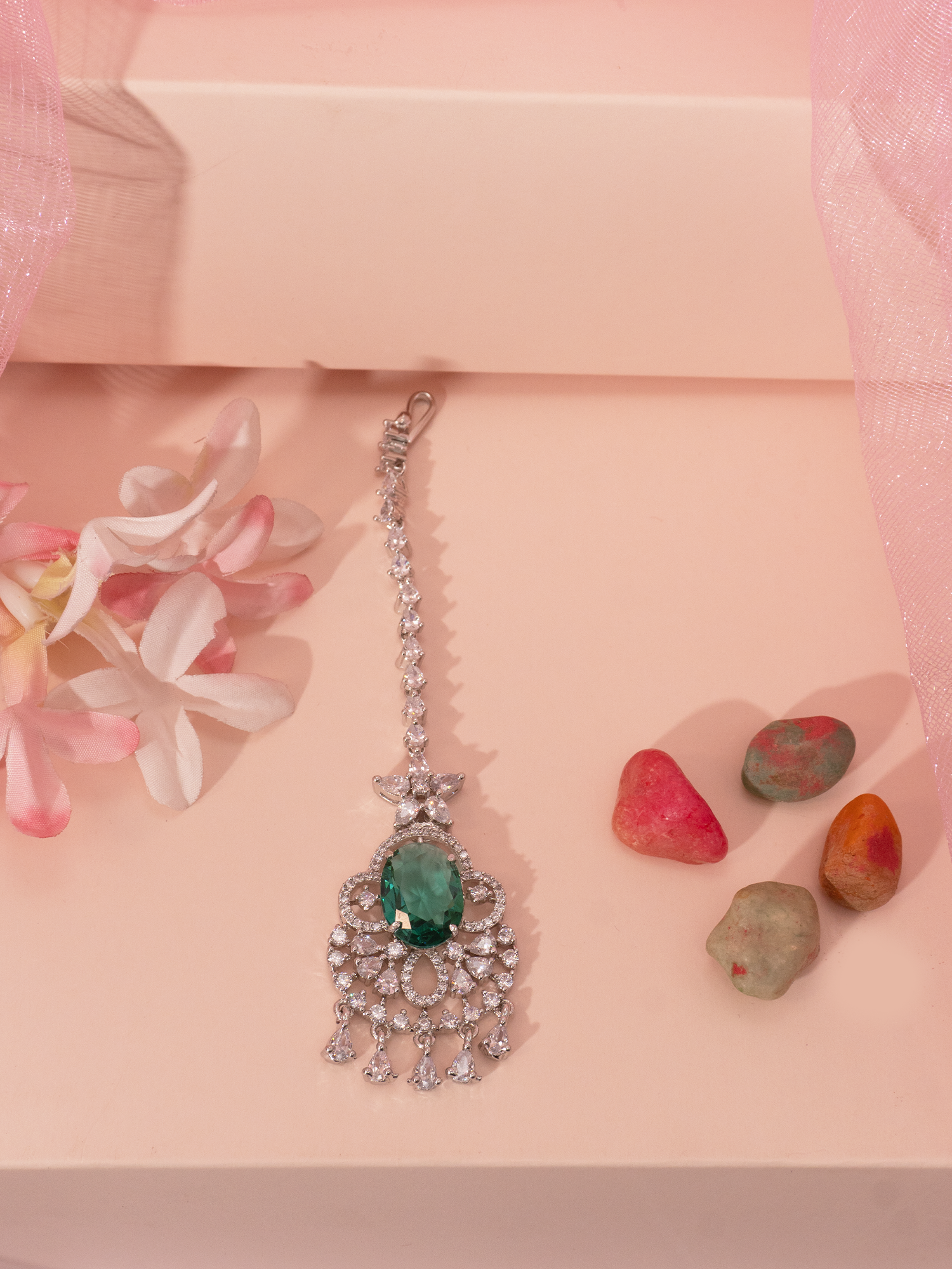 "Introducing Niscka's Emerald and White Flower Mantikka, a stunning piece that combines traditional elegance with contemporary flair. This exquisite mantikka features a delicate flower design, adorned with a blend of vibrant emerald and shimmering white stones, complemented by sparkling American diamonds and radiant zircon accents. The intricate floral motif adds a touch of grace and sophistication, while the carefully set stones create a mesmerizing sparkle that enhances your overall look. Perfect for weddings, festive occasions, or any special celebration, this mantikka is designed to add a regal touch to your traditional ensemble."