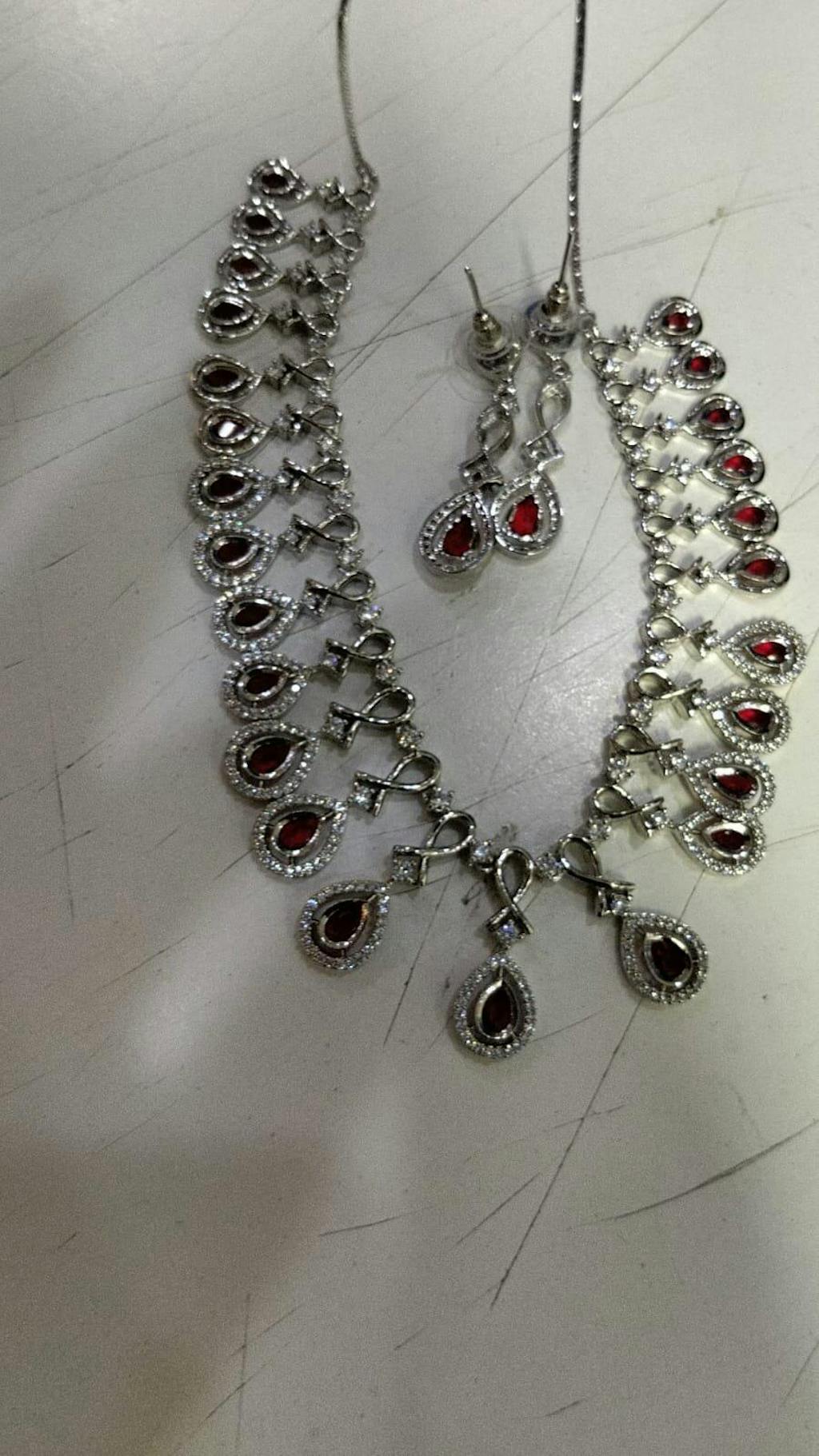 Delight in delicate elegance with this stunning jewelry set from Niscka, featuring a harmonious blend of pink and white accents. Adorned with sparkling Zircon stones and brilliant American diamonds, this set radiates sophistication and charm. The rhodium-polished finish adds a sleek, luminous touch, ensuring lasting shine. Perfect for weddings, festive gatherings, or formal soirées, the set includes a matching necklace and earrings, designed to complement both traditional and modern outfits with effortless grace.