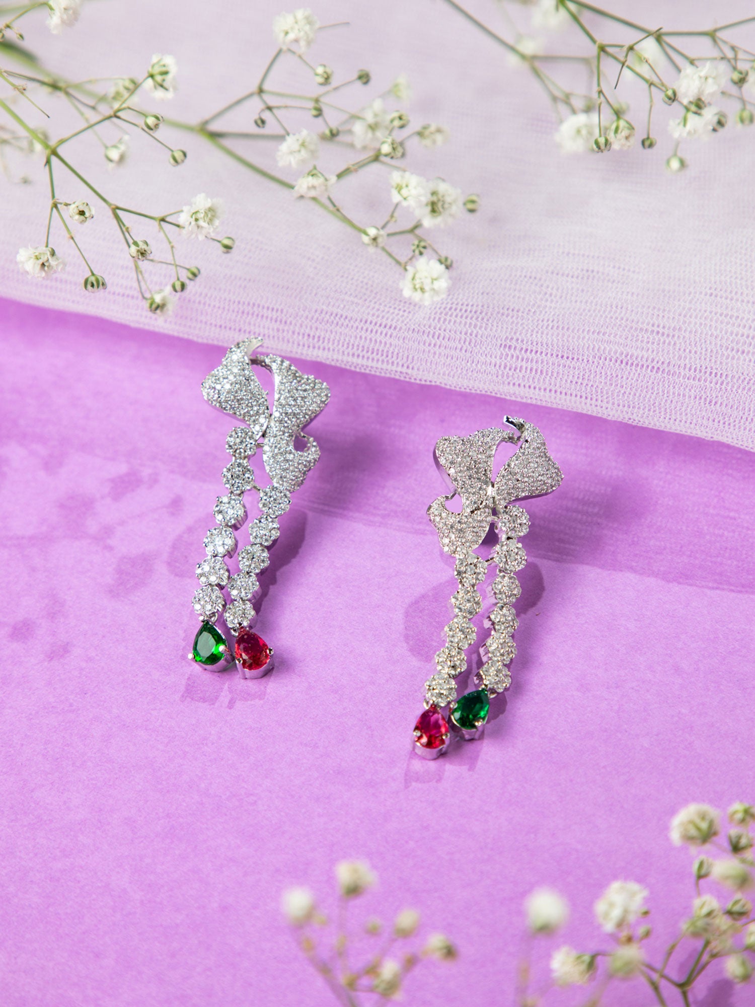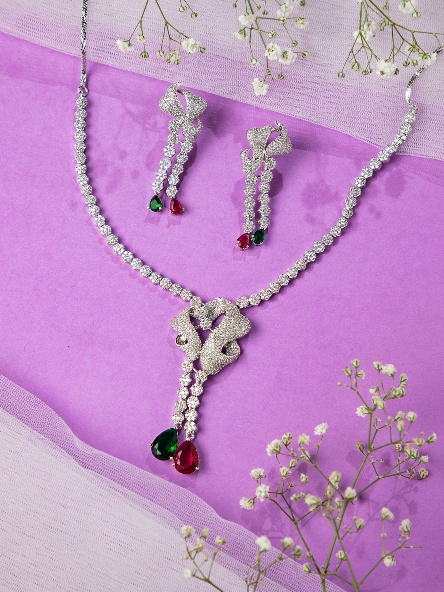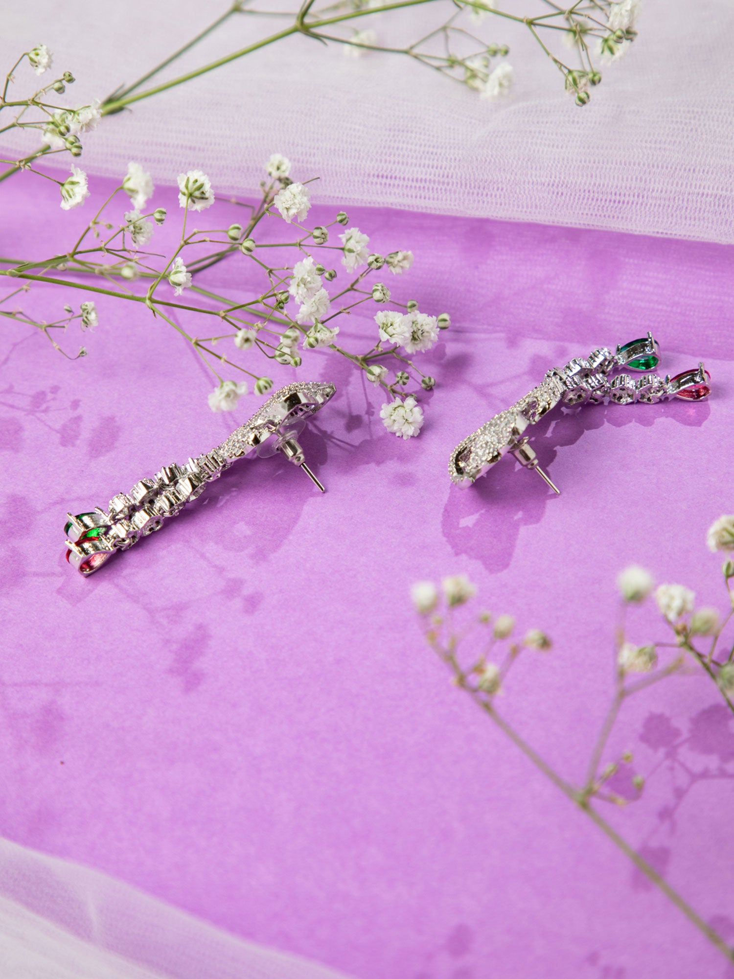 Handcrafted by local artisans, this rhodium-plated necklace set features elegant water drop pink, green, and small white American diamond stones. Paired with long matching earrings, it's a must-have accessory for parties, festivals, or functions, showcasing a truly gorgeous design.