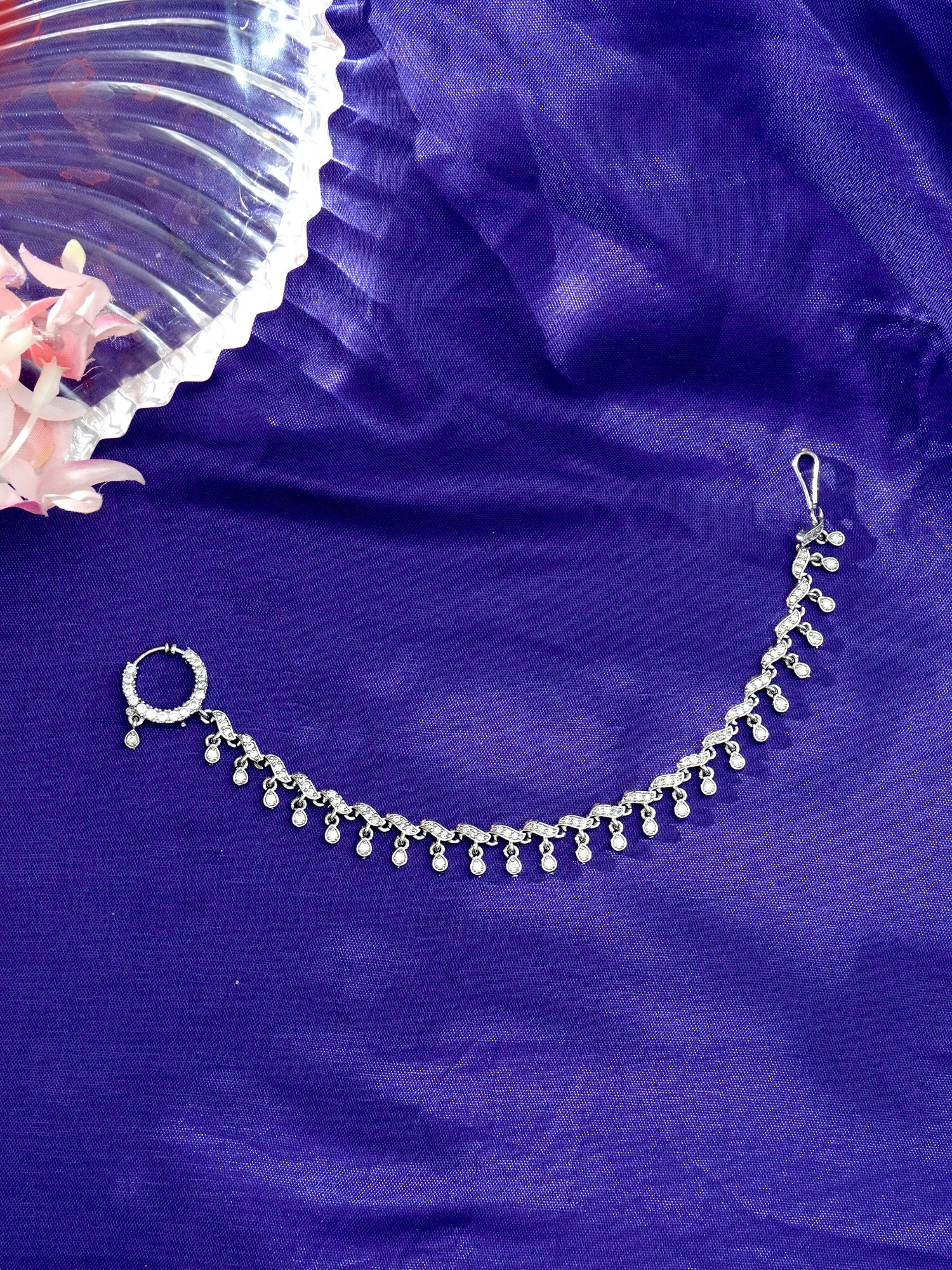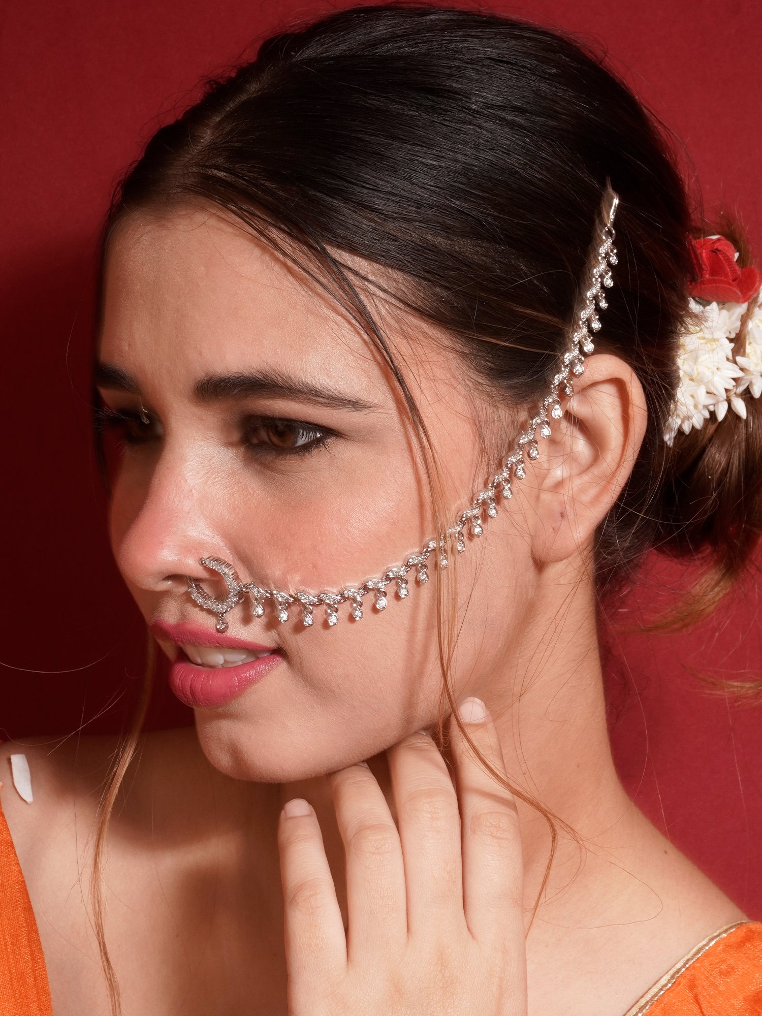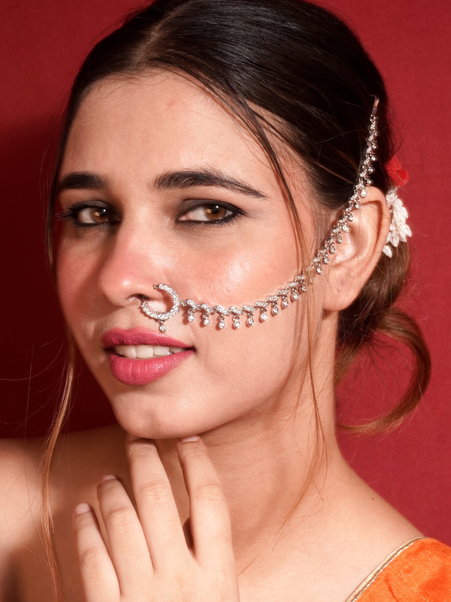 For a classic yet modern look, pair this silver-plated nath with a traditional saree or lehenga in soft tones like ivory or pastel hues, allowing the rhinestones and pearl to stand out. For a fusion twist, wear it with a contemporary outfit like a flowy gown or a chic kurti. Perfect for weddings, festivals, or any occasion where you want to add an elegant and timeless touch.