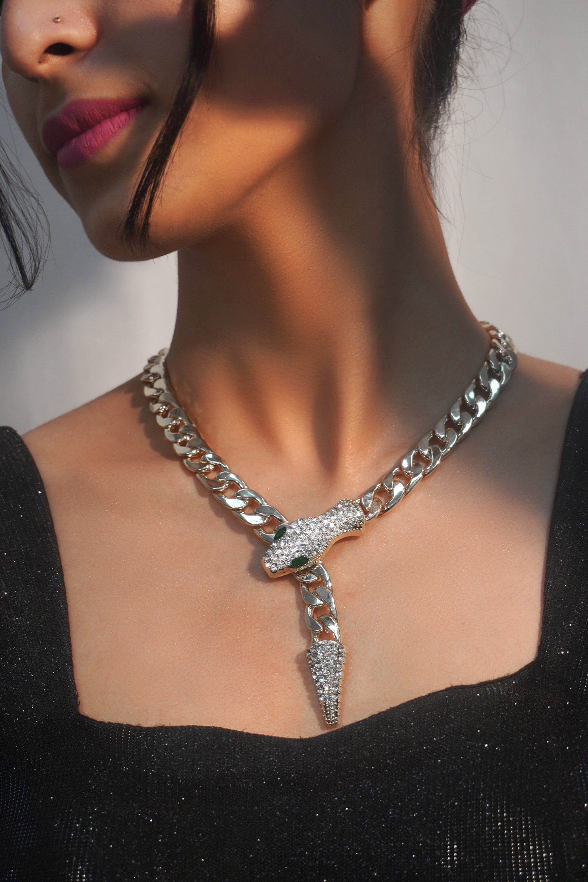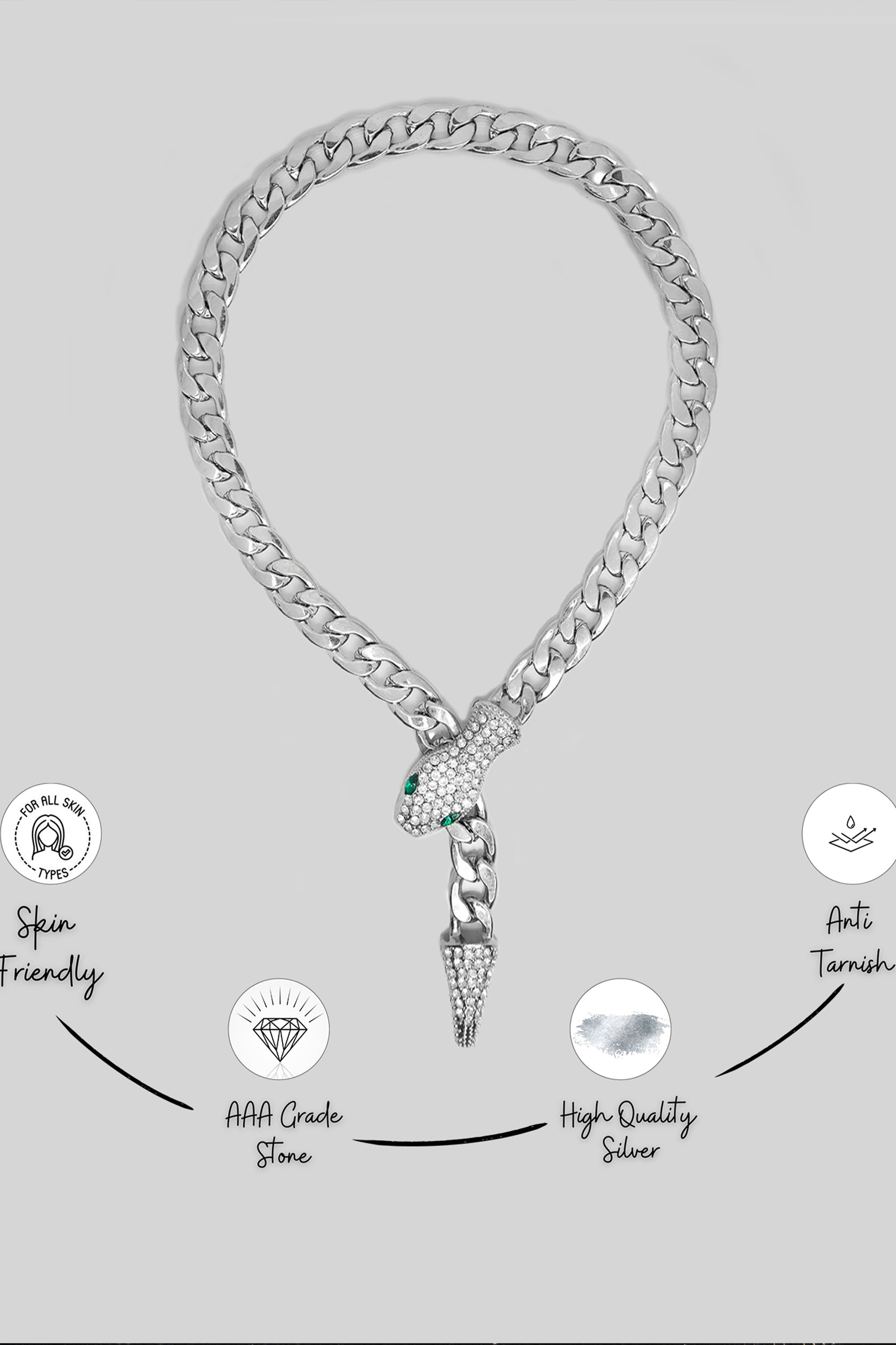 This spectacular snake necklace is made with a stainless steel chain. The face and tail are crafted with AAA-grade American Diamonds and green stone. It is highly polished with silver rhodium. It is a beautiful and luxurious piece of jewellery that is perfect for any occasion.