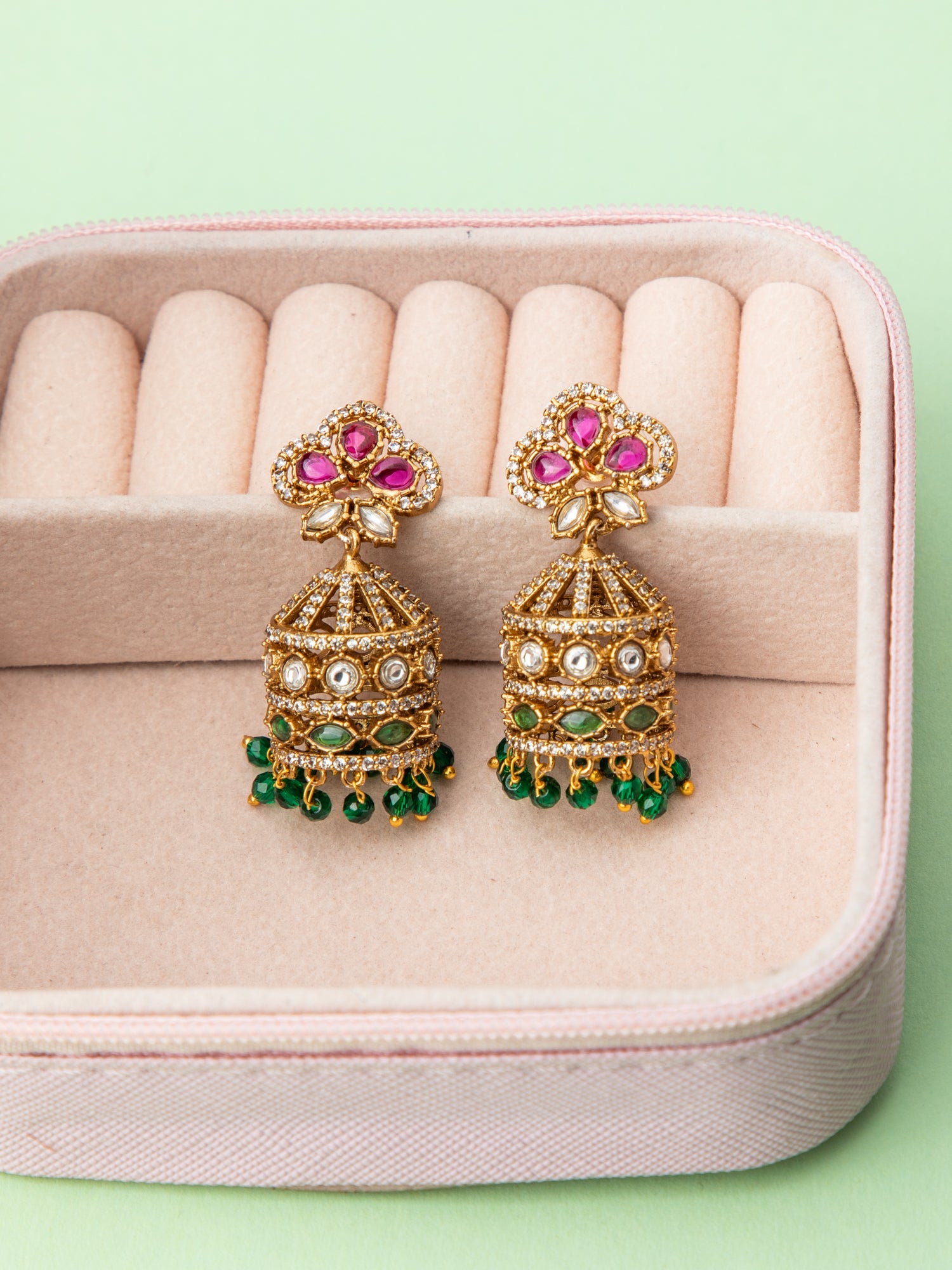 Pair these stunning jhumkas with sarees, lehengas, or heavy Anarkalis in rich hues like red, gold, or emerald green for a coordinated look. For maximum impact, opt for a traditional bun or braid to highlight these statement earrings. Add a matching gold bangle or ring to complete the regal ensemble.