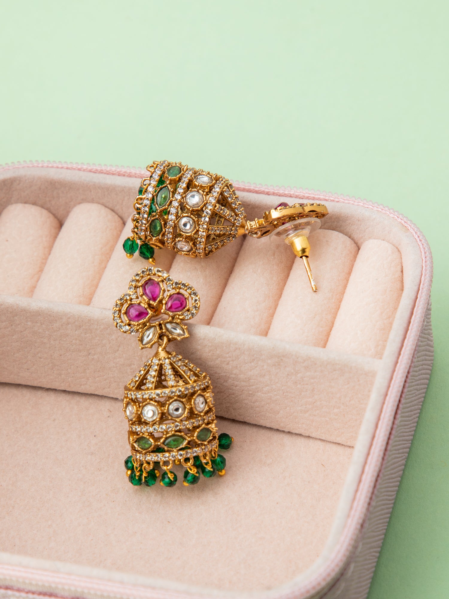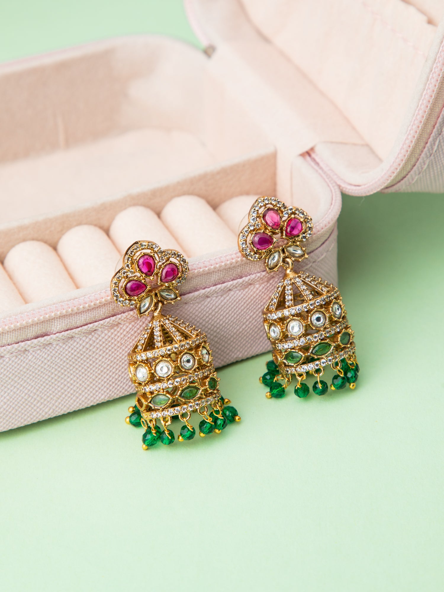 Celebrate timeless beauty with the Vibrant Elegance Jhumka Earrings — a captivating piece of traditional craftsmanship. Featuring a floral design with radiant pink and white stones, these earrings are further accentuated by a delicate gold-plated jhumka drop adorned with green stones. The intricate detailing and graceful movement of the jhumka make these earrings the perfect blend of classic and festive, designed to turn heads at weddings, festivals, or elegant gatherings.