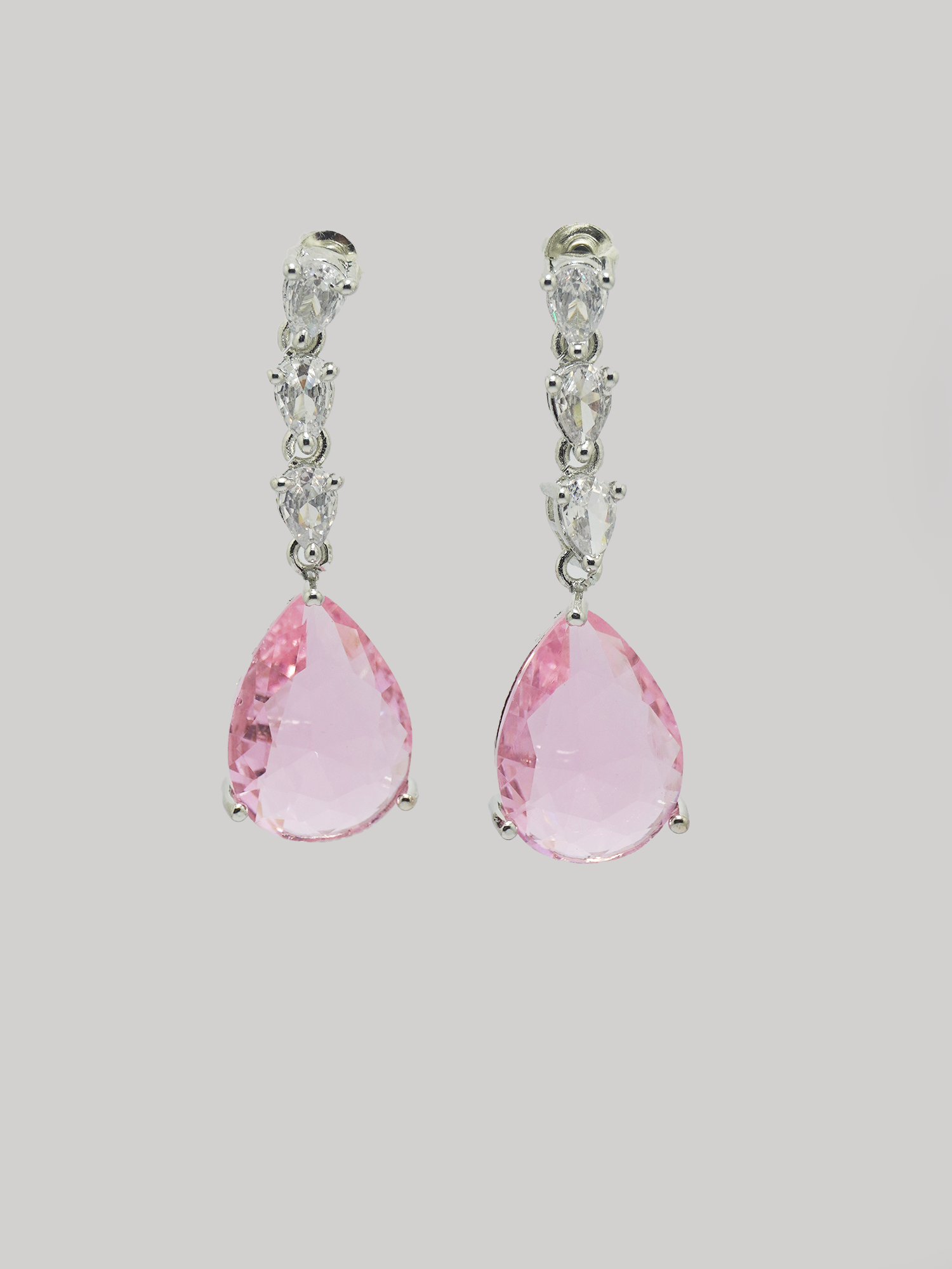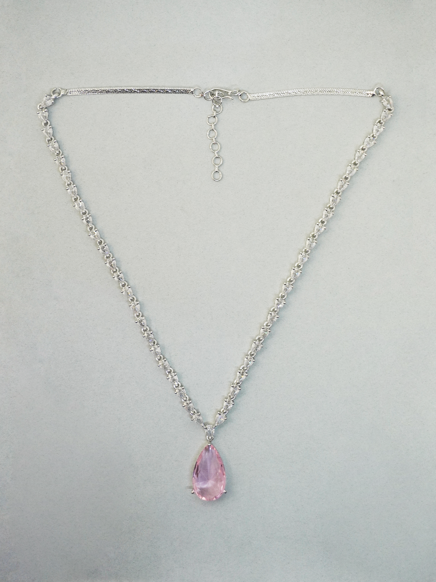 Adorn yourself with this sophisticated Pink and White American Diamond Necklace. Featuring water drop pink and white AD stones in a seamless pattern and rhodium plating, it's ideal for functions. The spellbinding earrings highlight pink water drop stones adorned with small white AD stones at the top. Handcrafted by local artisans, this latest necklace set is a must-have for its exquisite design and versatility.