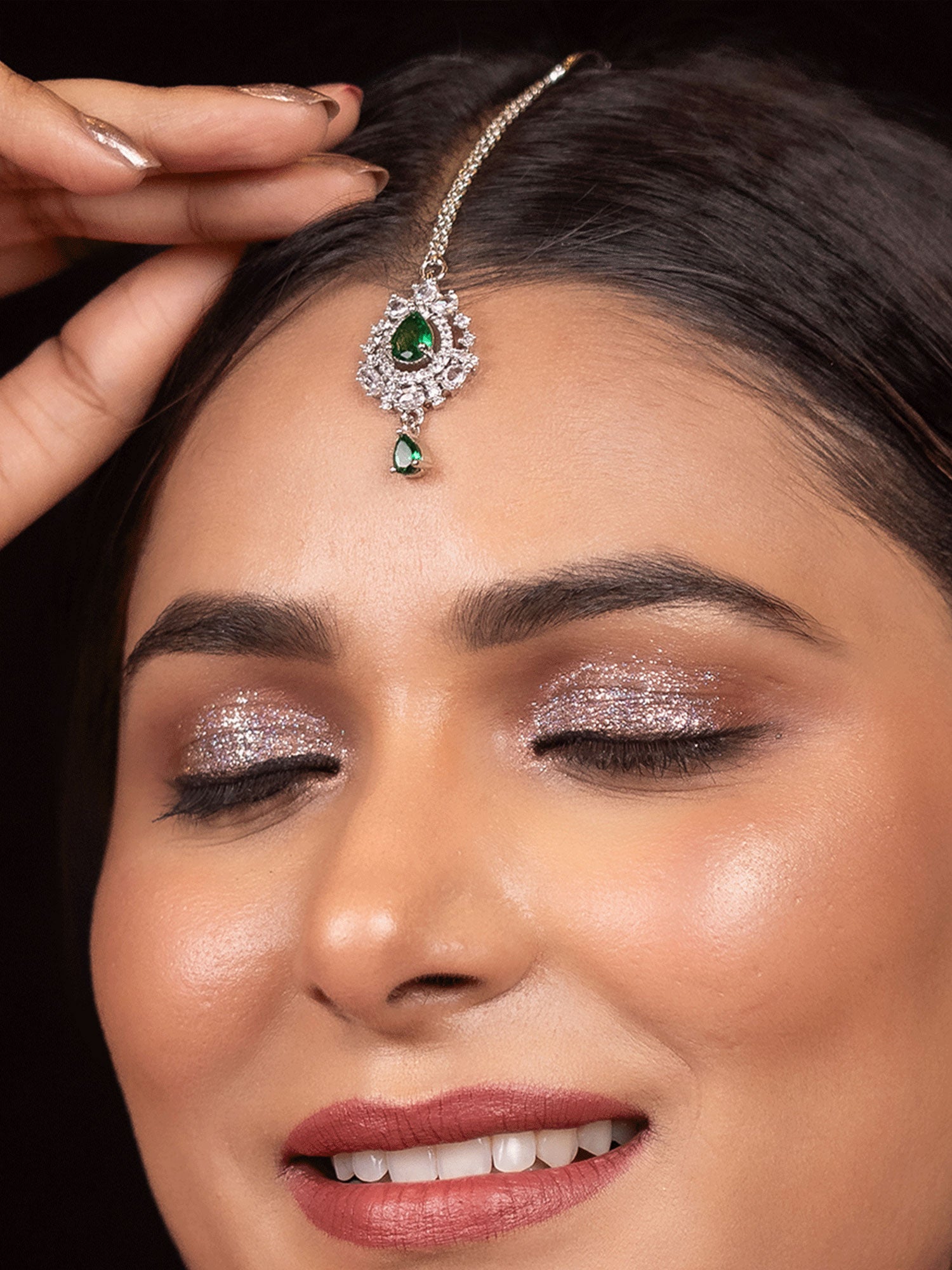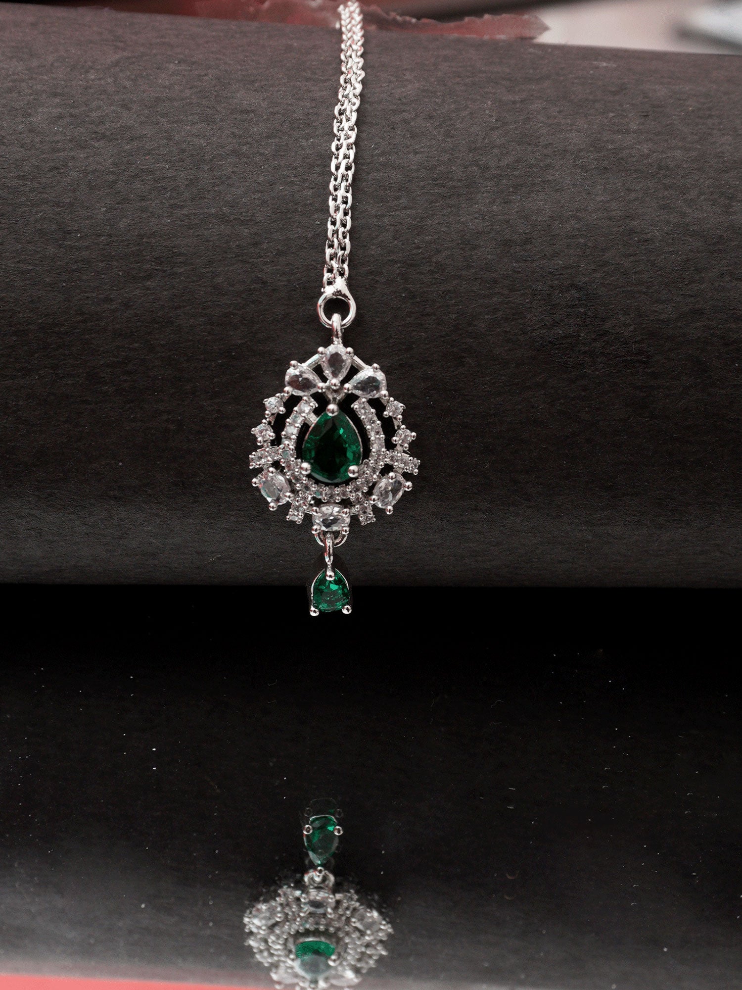 Add a touch of regal elegance to your traditional attire with this stunning Maang Tikka, featuring a captivating emerald centerpiece surrounded by shimmering American diamonds. The rhodium-plated finish enhances its brilliance, offering a sophisticated yet timeless appeal. Designed to complement ethnic ensembles, this piece beautifully enhances bridal, festive, and celebratory looks. Lightweight and comfortable to wear, it gracefully adorns your forehead, making it a perfect choice for those who appreciate fine craftsmanship and refined beauty.