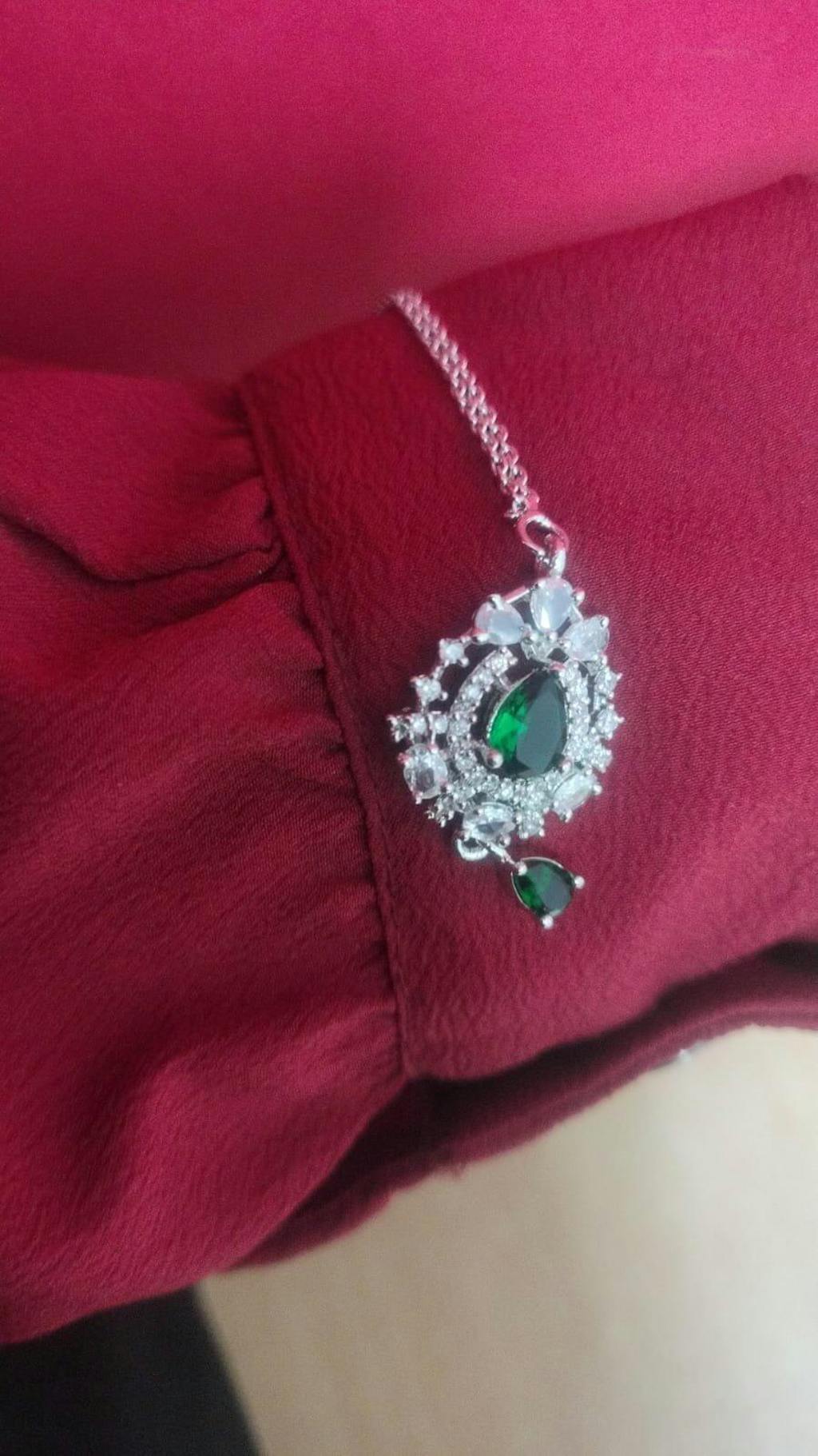 Pair this Emerald & American Diamond Maang Tikka with a matching choker or layered necklace to enhance its regal charm. Opt for a sleek low bun or soft curls to highlight the tikka’s elegance. Complement the look with emerald-studded earrings and subtle makeup with a dewy finish and a bold kajal-lined eye for a sophisticated traditional appeal. Perfect for weddings, festive occasions, and grand celebrations!